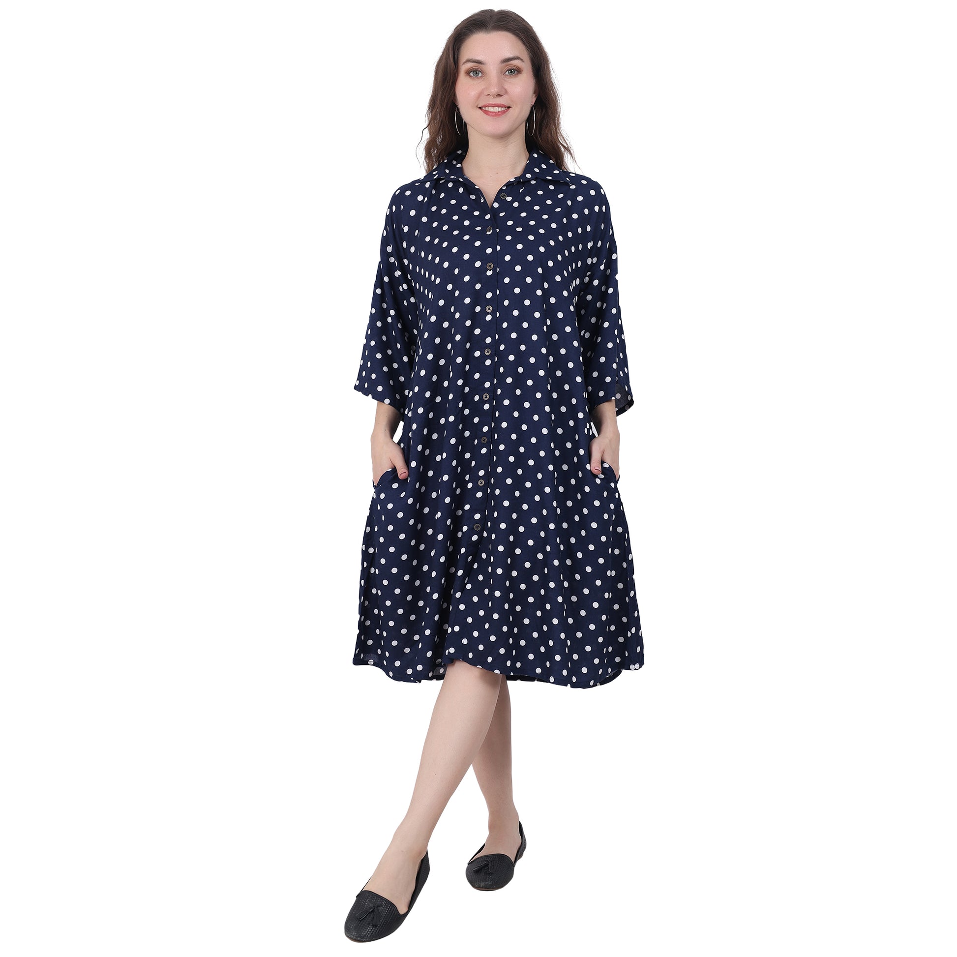 Collared navy blue 3/4 sleeves polka printed knee-length dress with pockets. Perfect for women who want to stay comfortable and stylish during the warm weather..