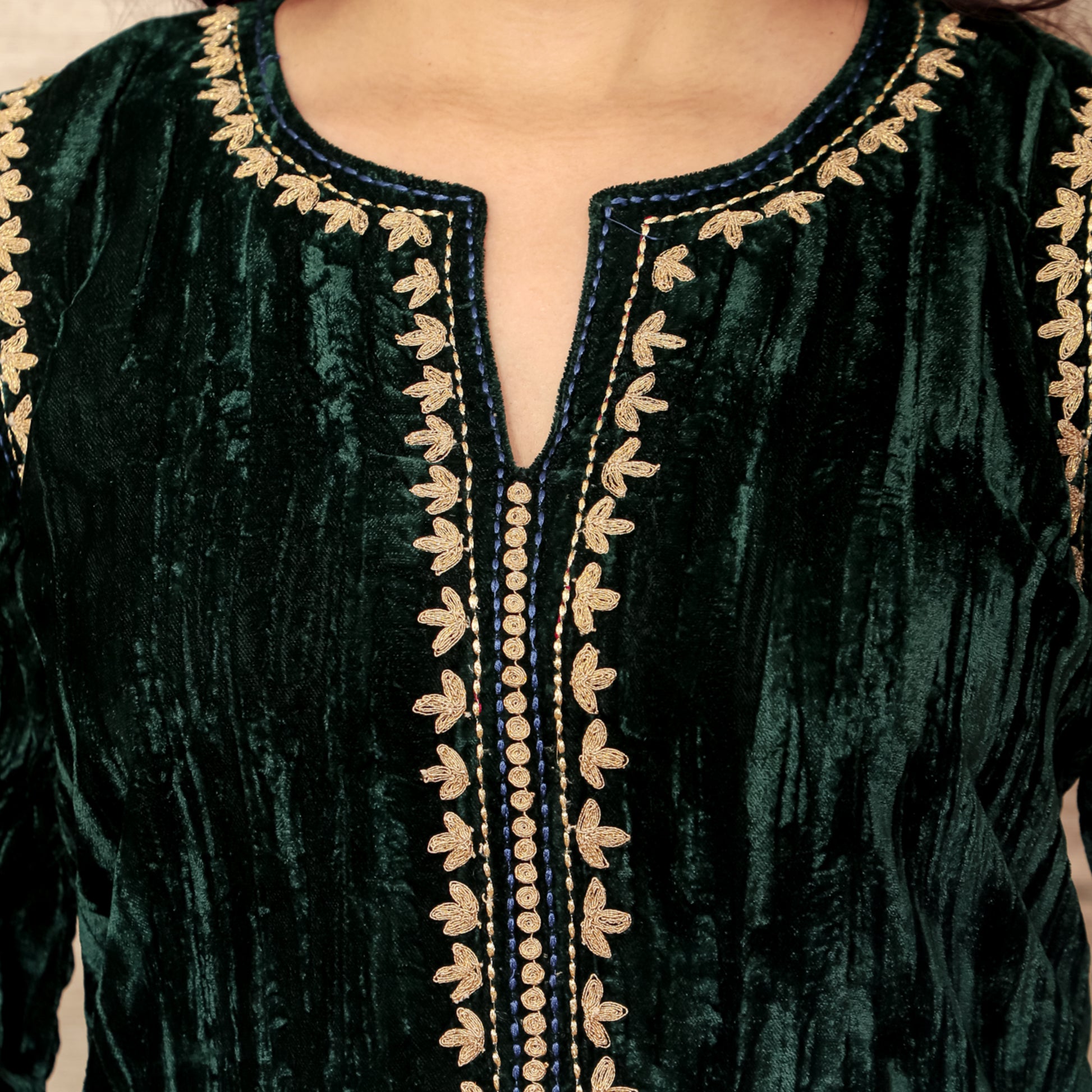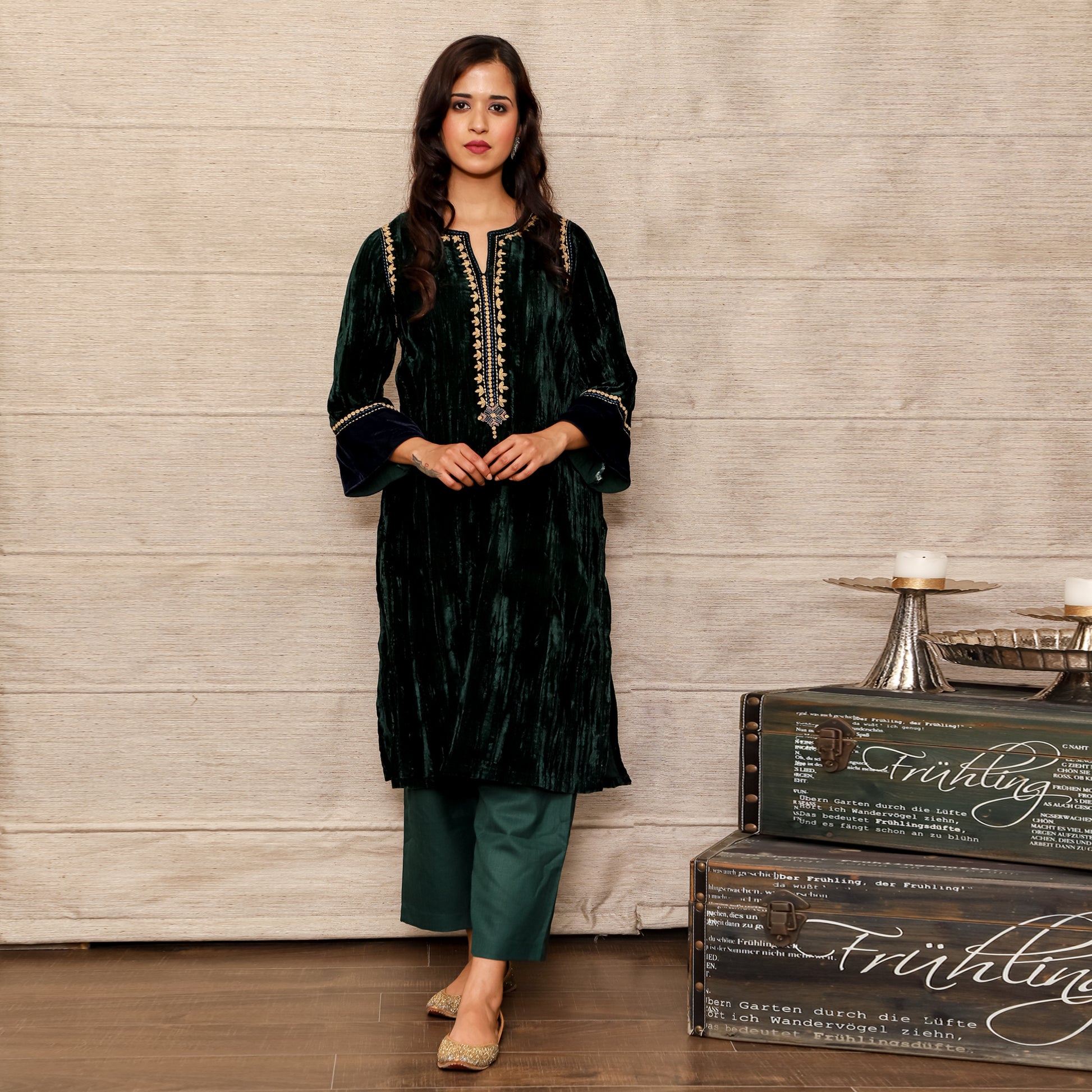 Dark Green Velvet silk round neck kurta with Dori/Zari work detailing on neck and Sleeves. It is paired with tonal mashru silk pants. Perfect outfit for winter celebrations.