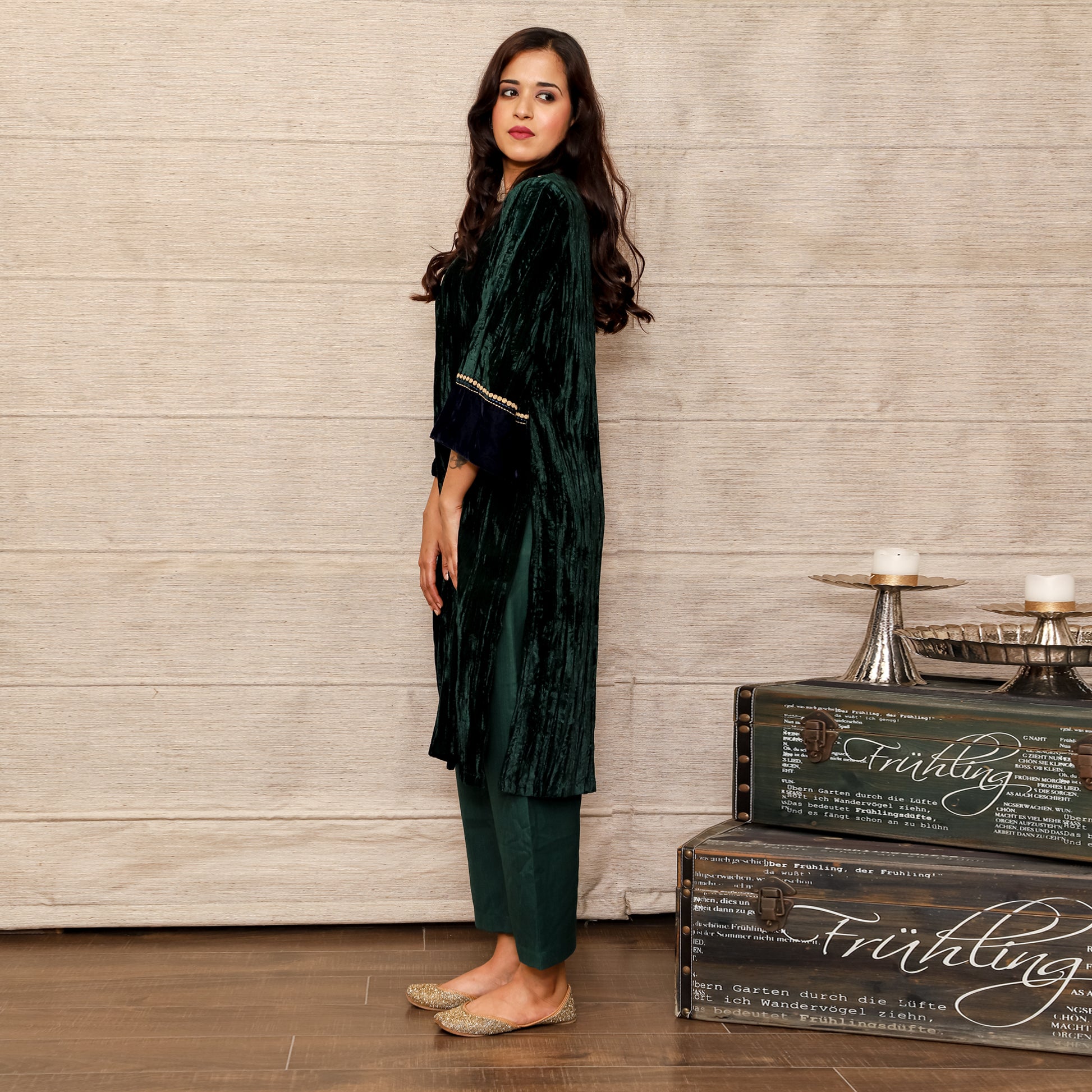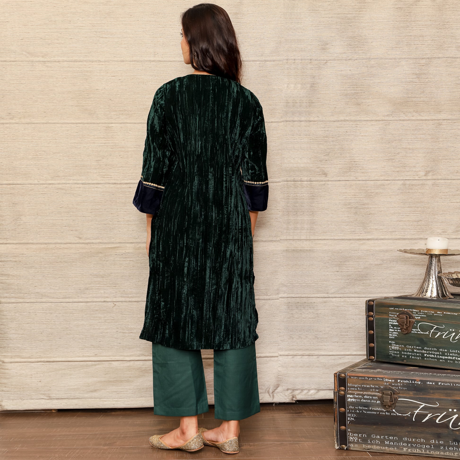 Dark Green Embroidered Crushed Velvet Silk Kurta with Mashru Silk Pants