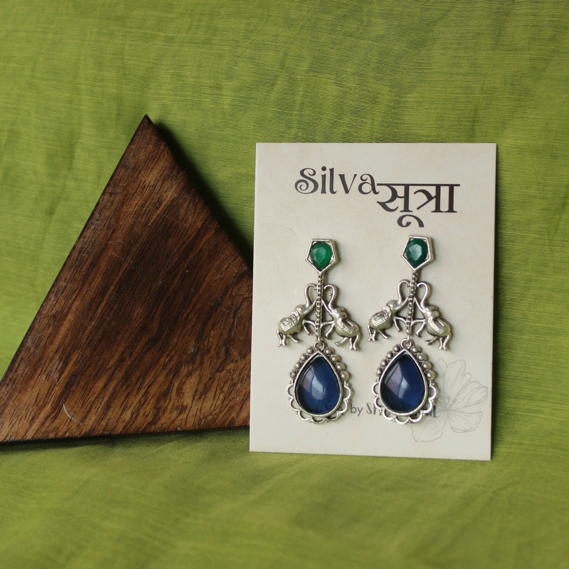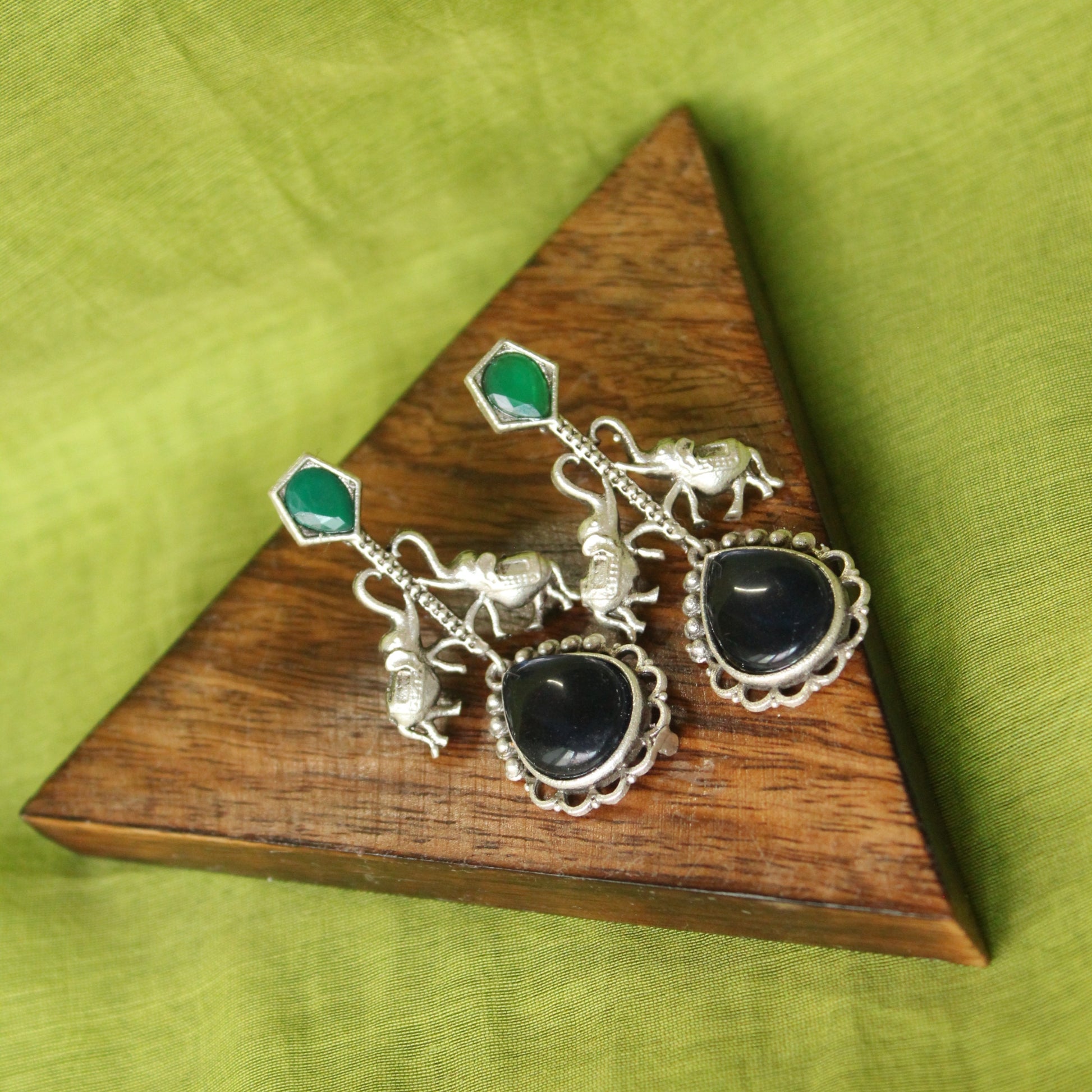 These captivating silver-toned earrings feature charming elephant motifs, symbolizing strength and wisdom. Adorned with vibrant green studs and elegant teardrop-shaped blue stones, they beautifully blend traditional craftsmanship with a touch of modern allure, perfect for adding an ethnic chic statement to any attire.