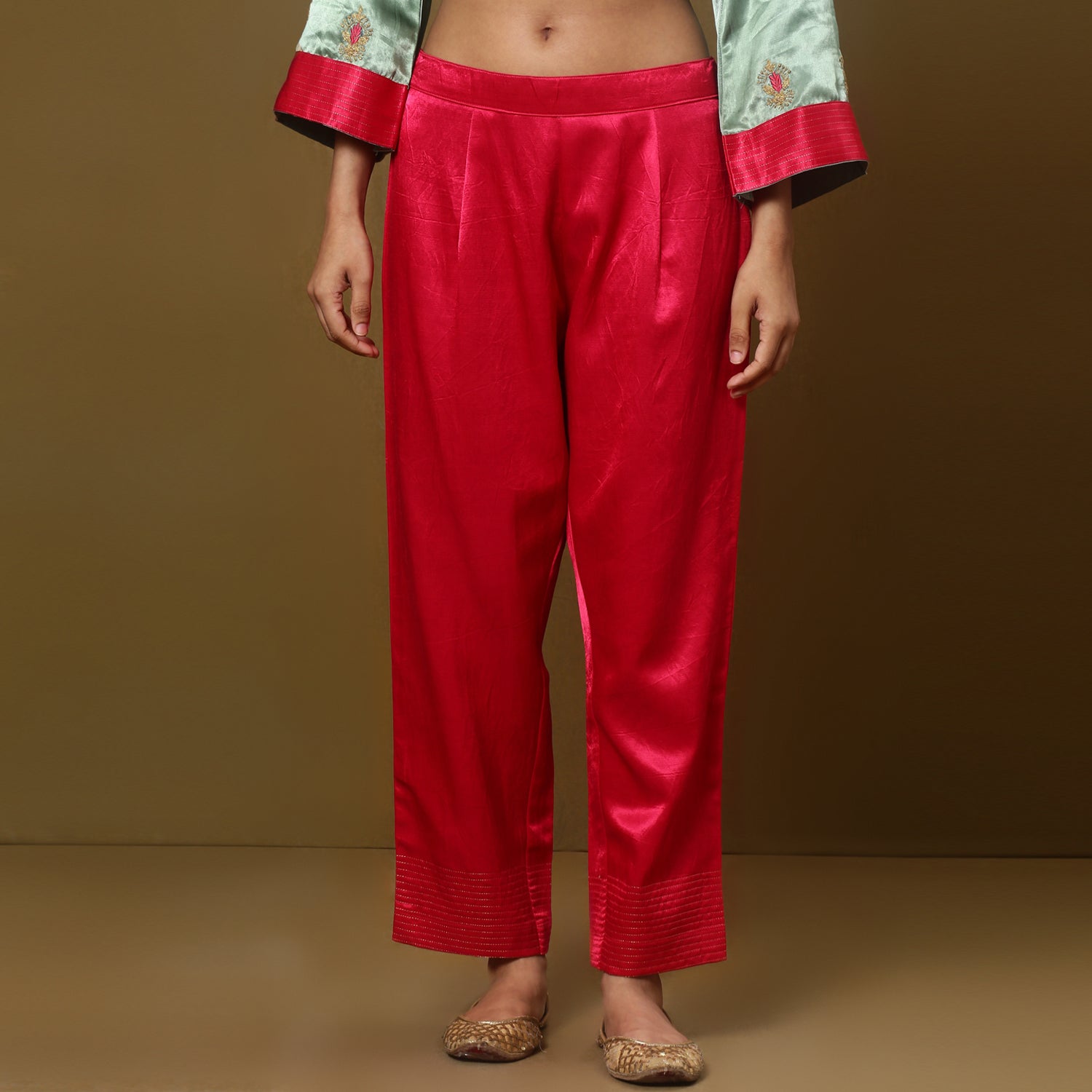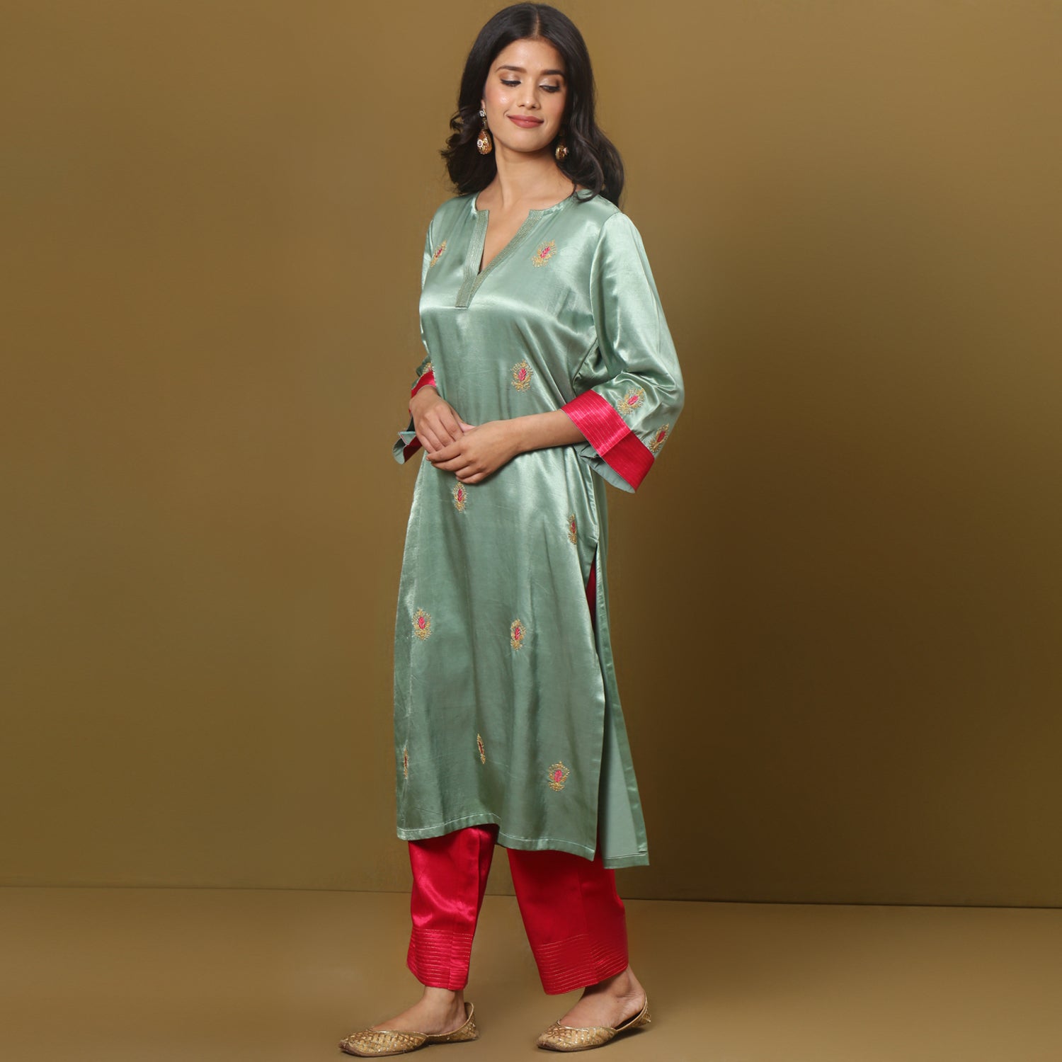 A classic sage green mashru silk kurta set with embroidery all over and zari detailing on sleeves. It is paired with pink silk pants. It is a classic kurta set to add charm in any occasion.