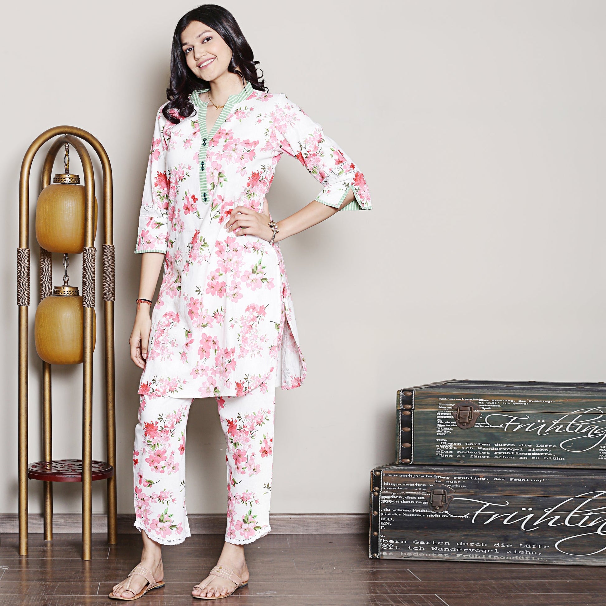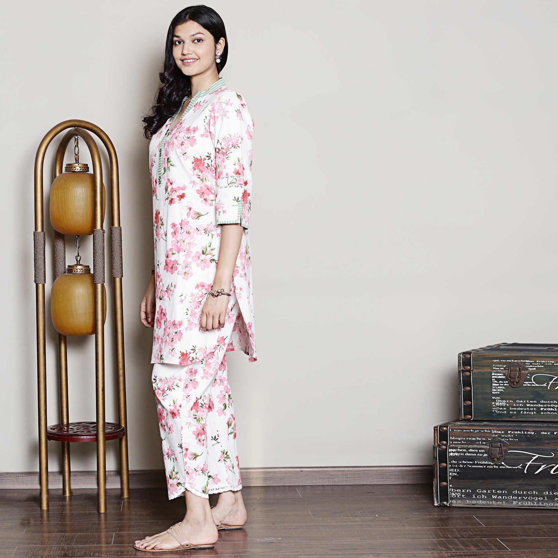 Stunning floral printed white linen co-ord set with mirror embroidery on neck and lace detailing on sleeves. It is paired with matching pants. Effortlessly stylish for any casual outing.