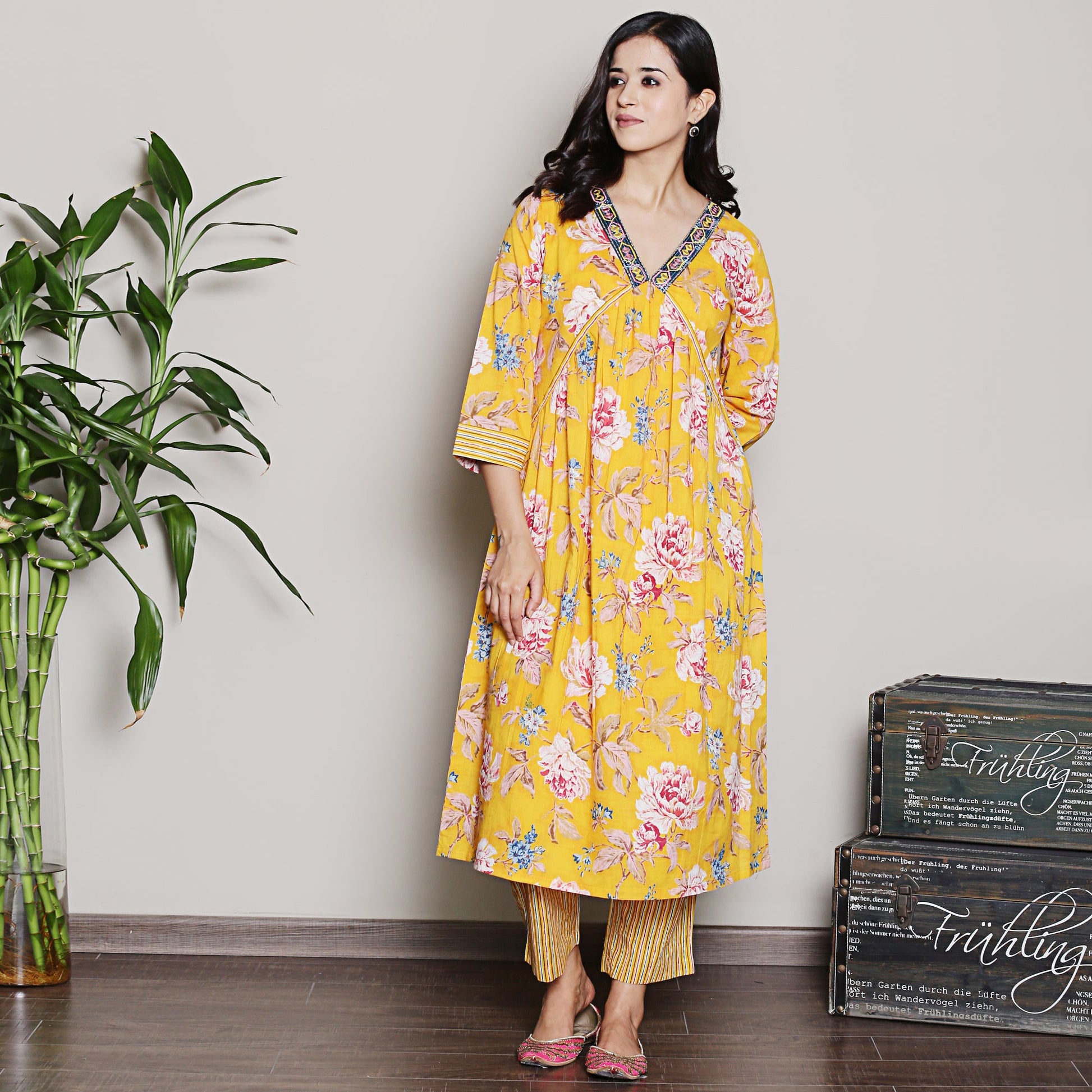 Step out in style with our A-line yellow floral-printed cotton kurta set with mirrorwork & thread embroidery on the neck. It is paired with a striped printed pants. Effortlessly chic and perfect for a casual day out.