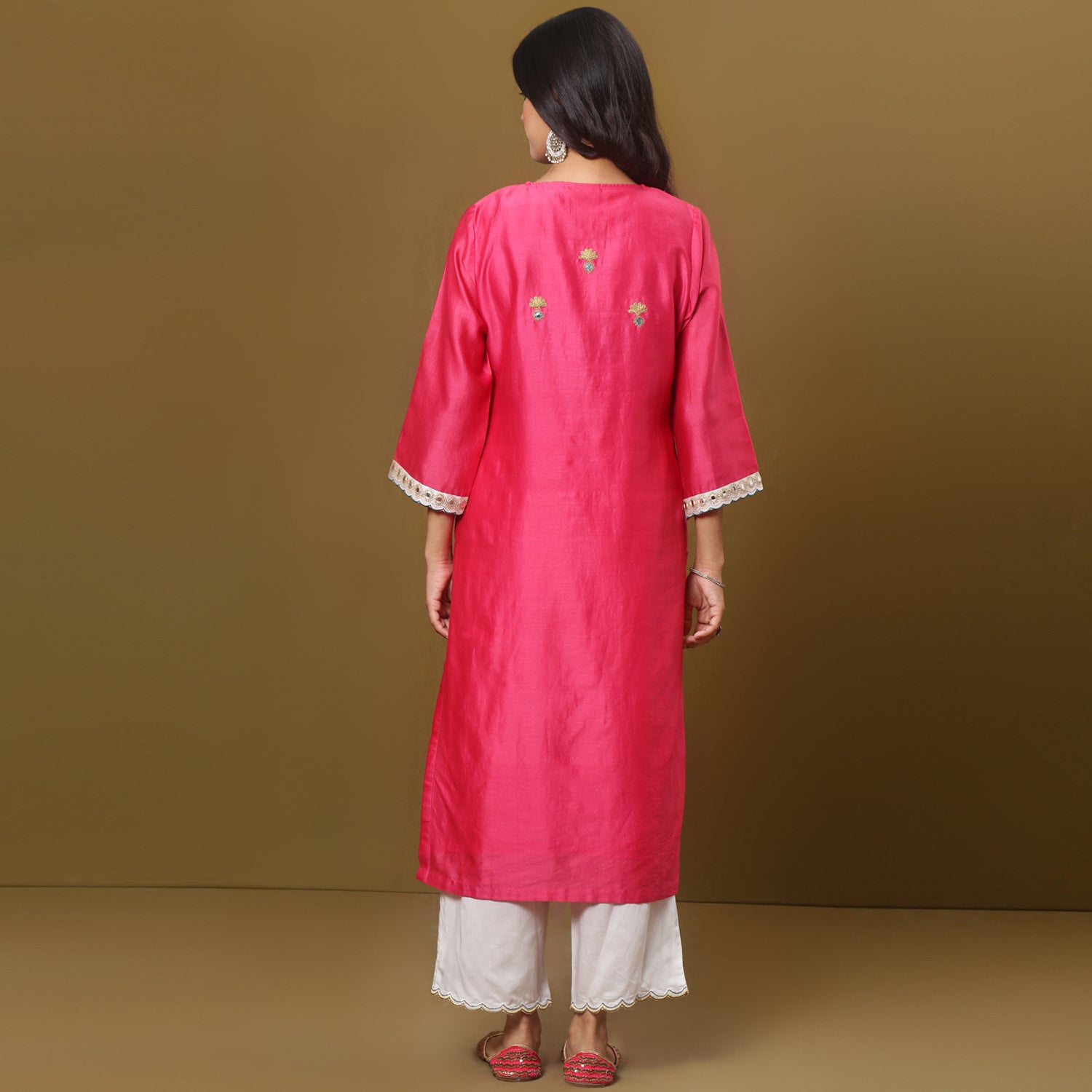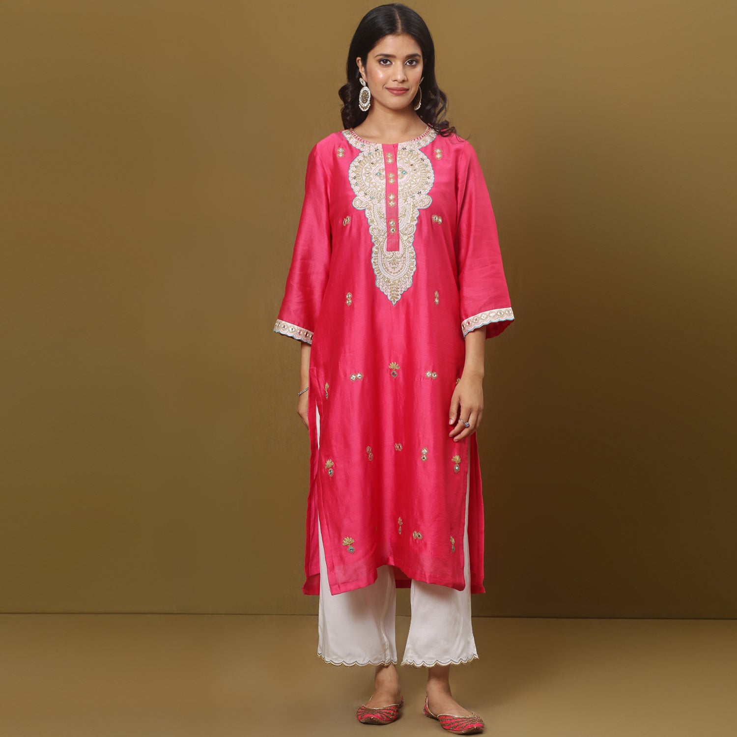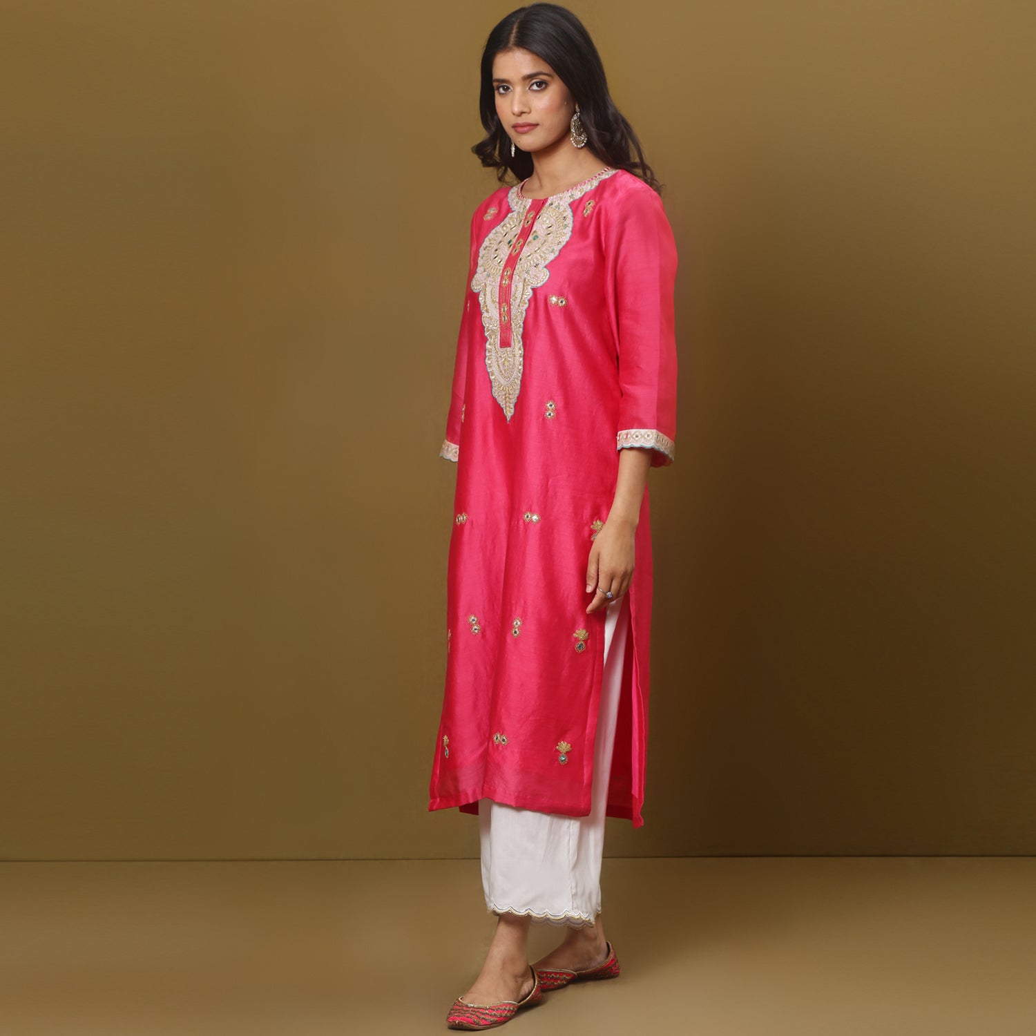 A classic fuschia pink chanderi silk kurta with embroidery on neck and sleeves. It is paired with white silk pants. It is a classic kurta set to add charm in any occasion.