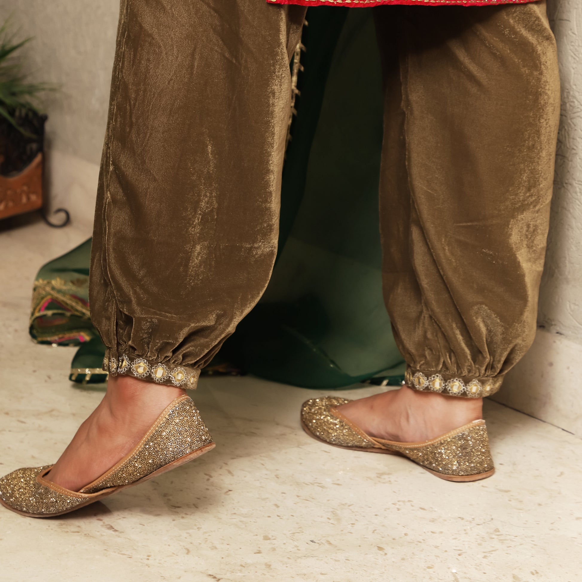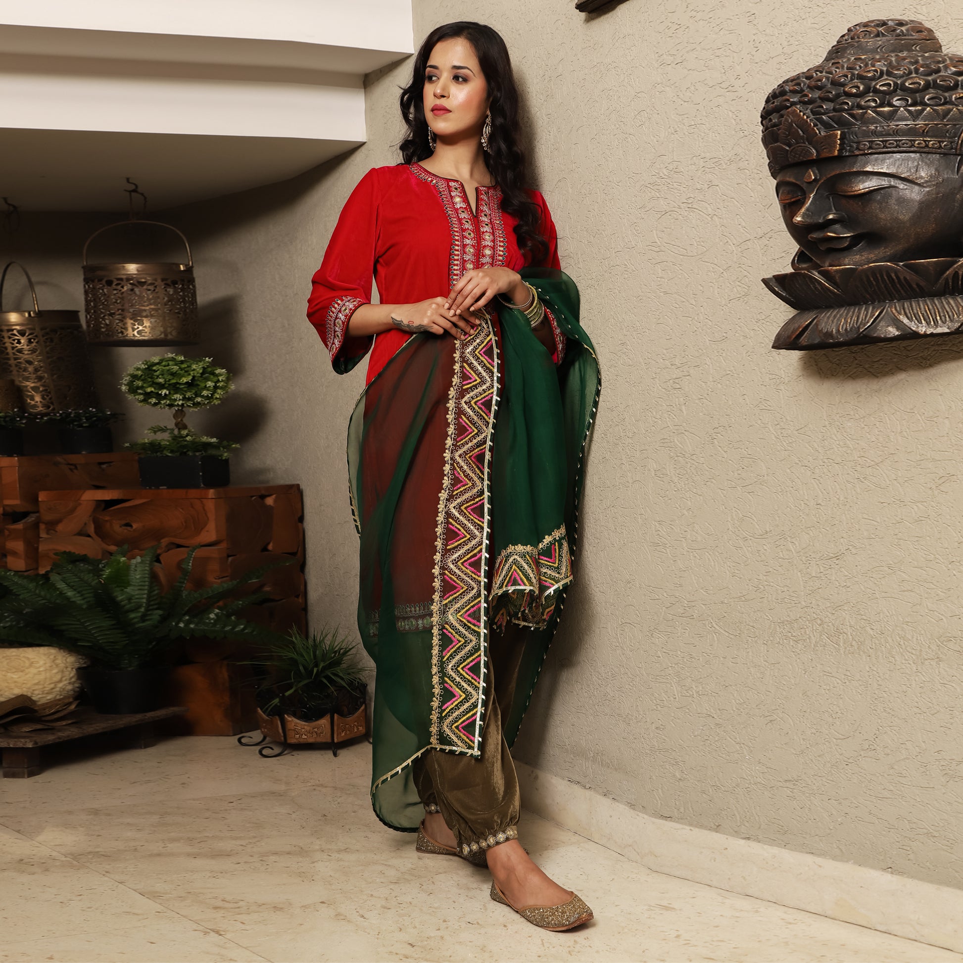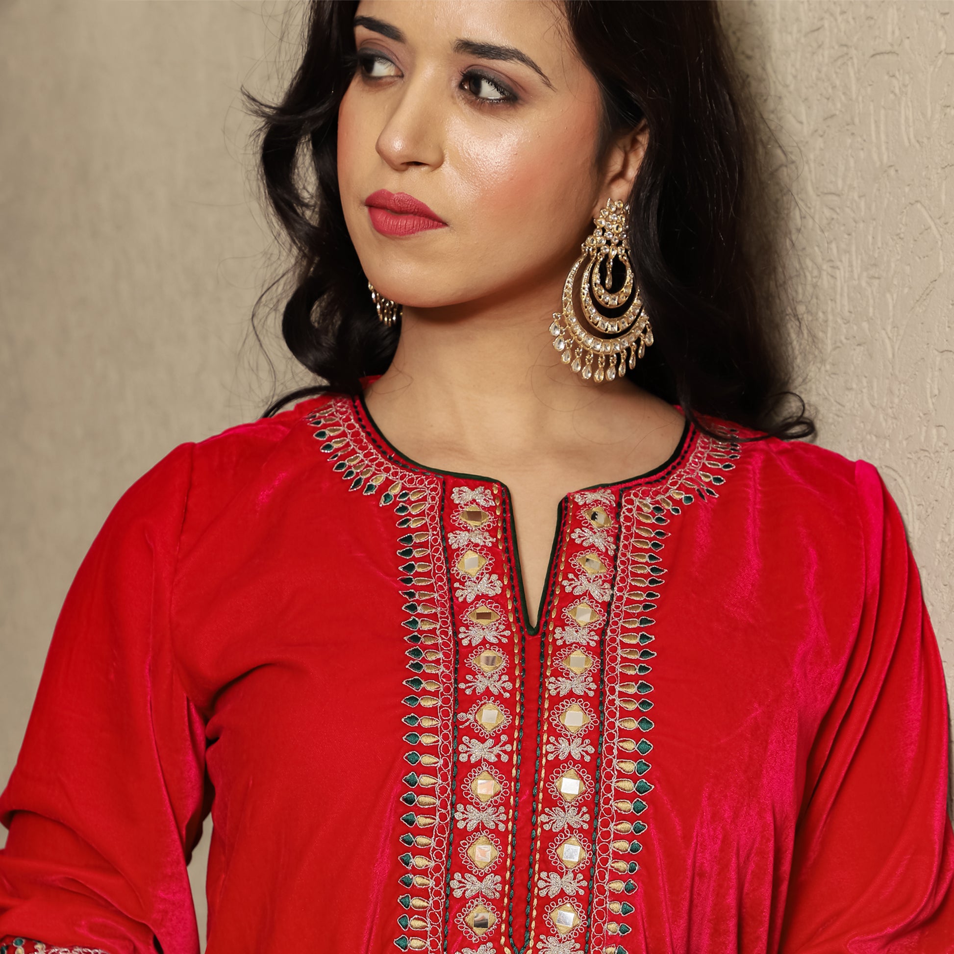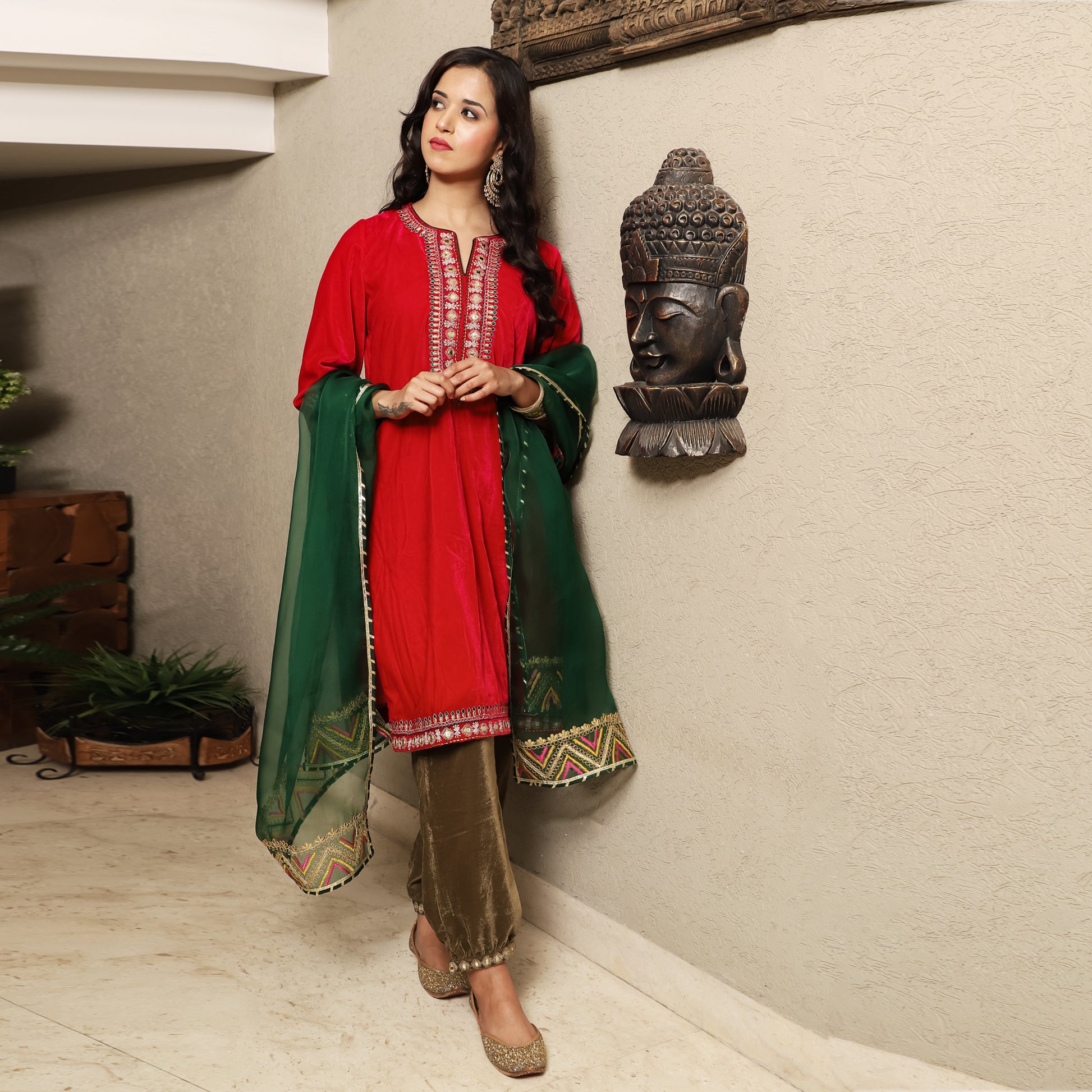Fuschia pink Velvet round neck kurta with Dori/Zari and mirrorwork detailing on neck kurta patti, and Sleeves. It is paired with contrasting green organza dupatta and olive velvet pants. Perfect three color outfit for winter celebrations.