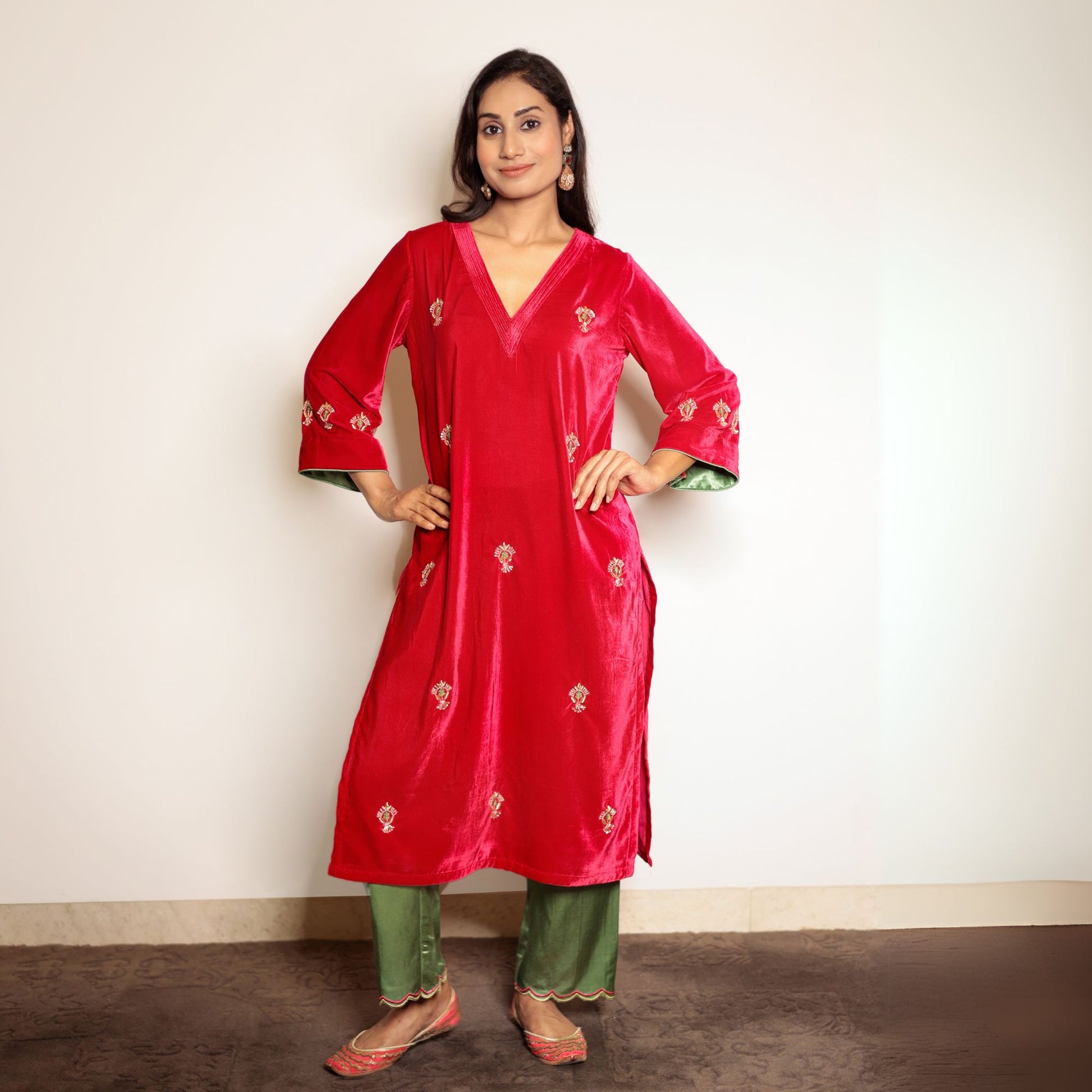 Fuschia pink hand embroidered velvet kurta with zari detailing on the neckline. It is paired with green mashru silk pants with scalloped hem. Perfect outfit for winter celebrations