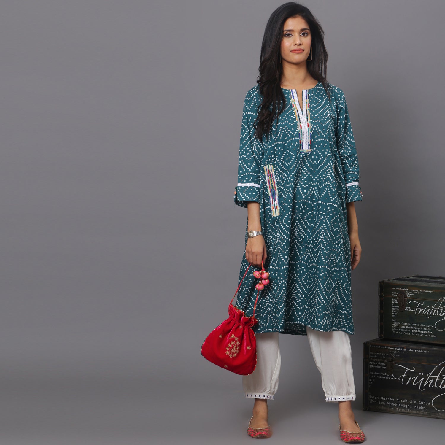 green bandhani frock style knee length kurta Set with threadwork and lace detailing on neck, sleeves & pocket paired with white harem pants with mirror work detailing on bottom. It is a stylish ensemble perfect for any occasion.