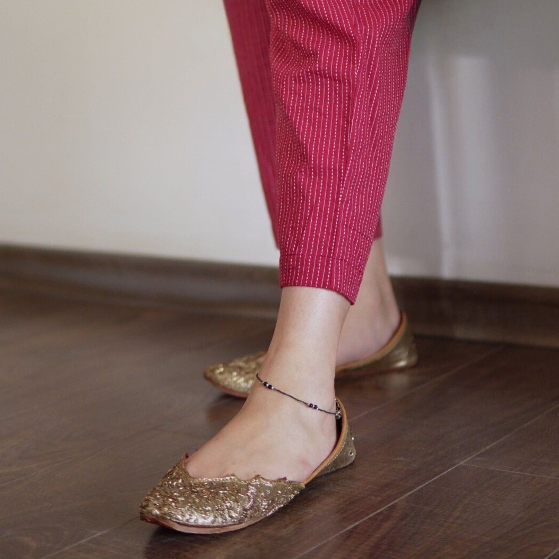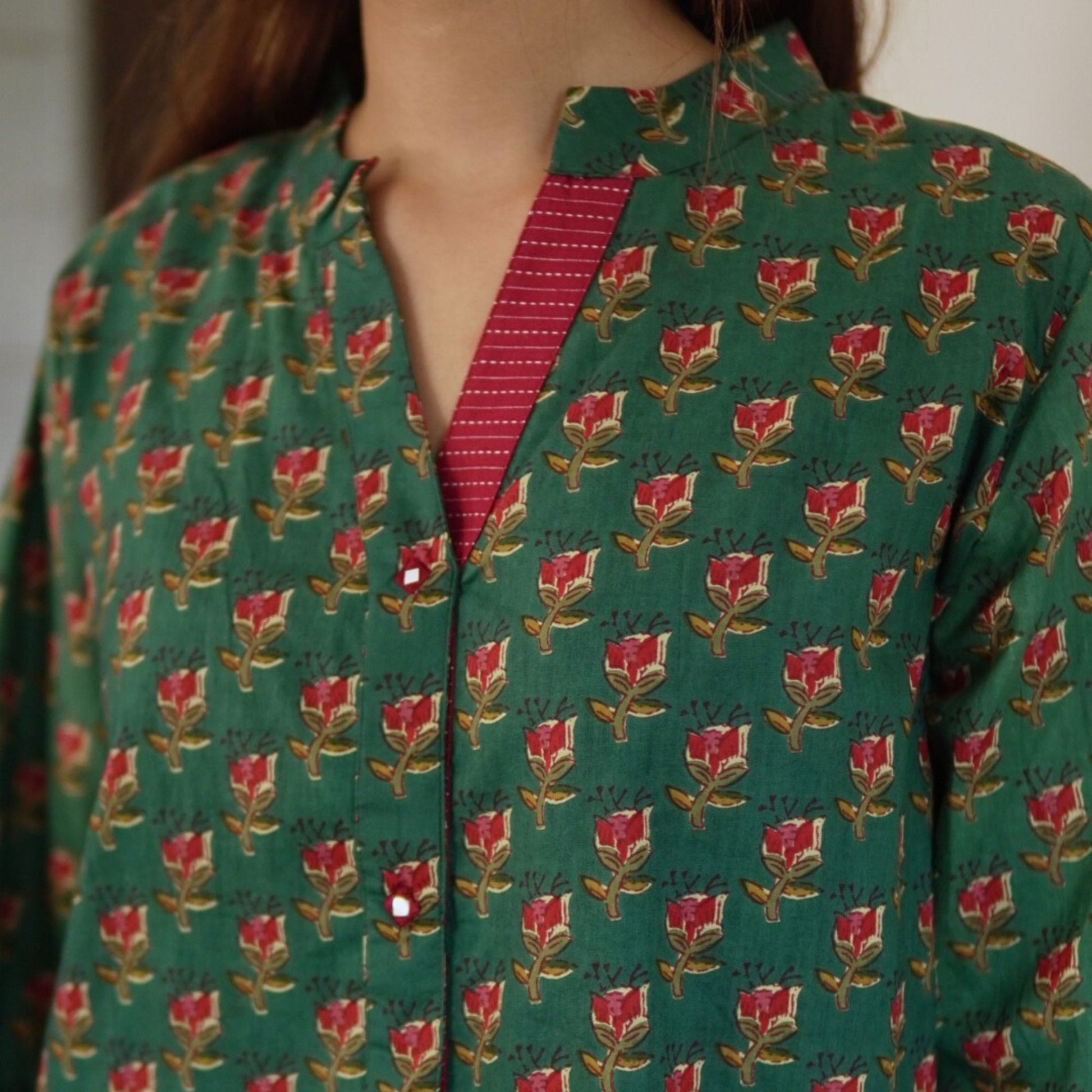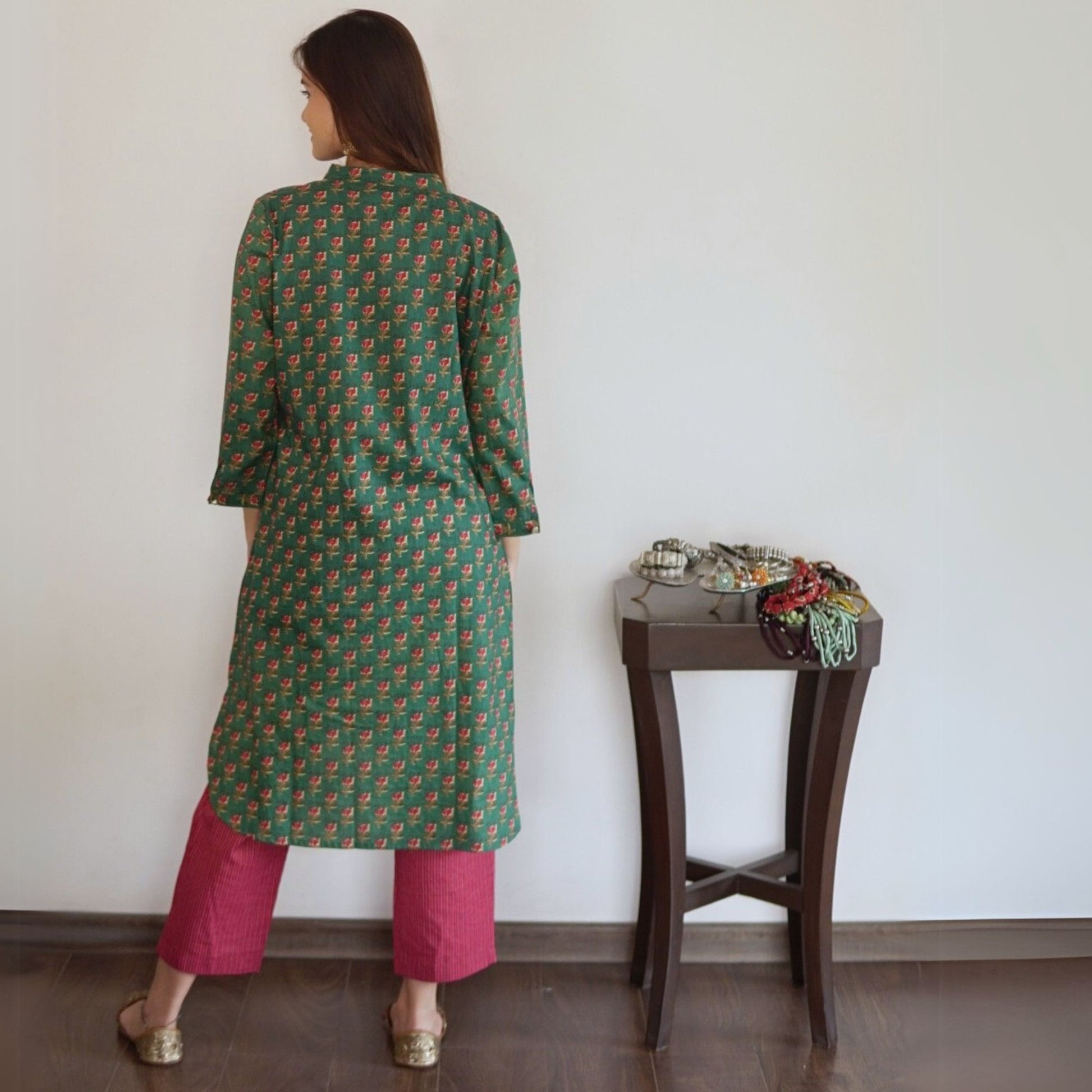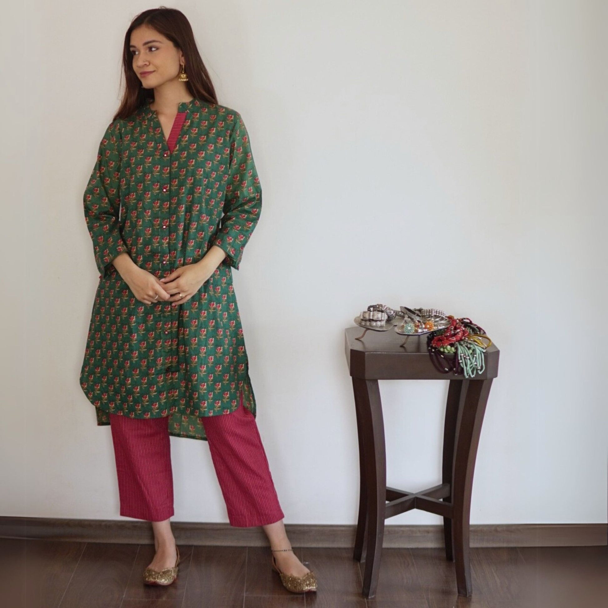 This green buta block printed kurta features a band collar, full placket with Kantha detailing, 3/4th sleeves, and a high-low round hem. Paired with contrasting maroon Kantha pants, it’s a versatile pick for everyday wear and smart office dressing.