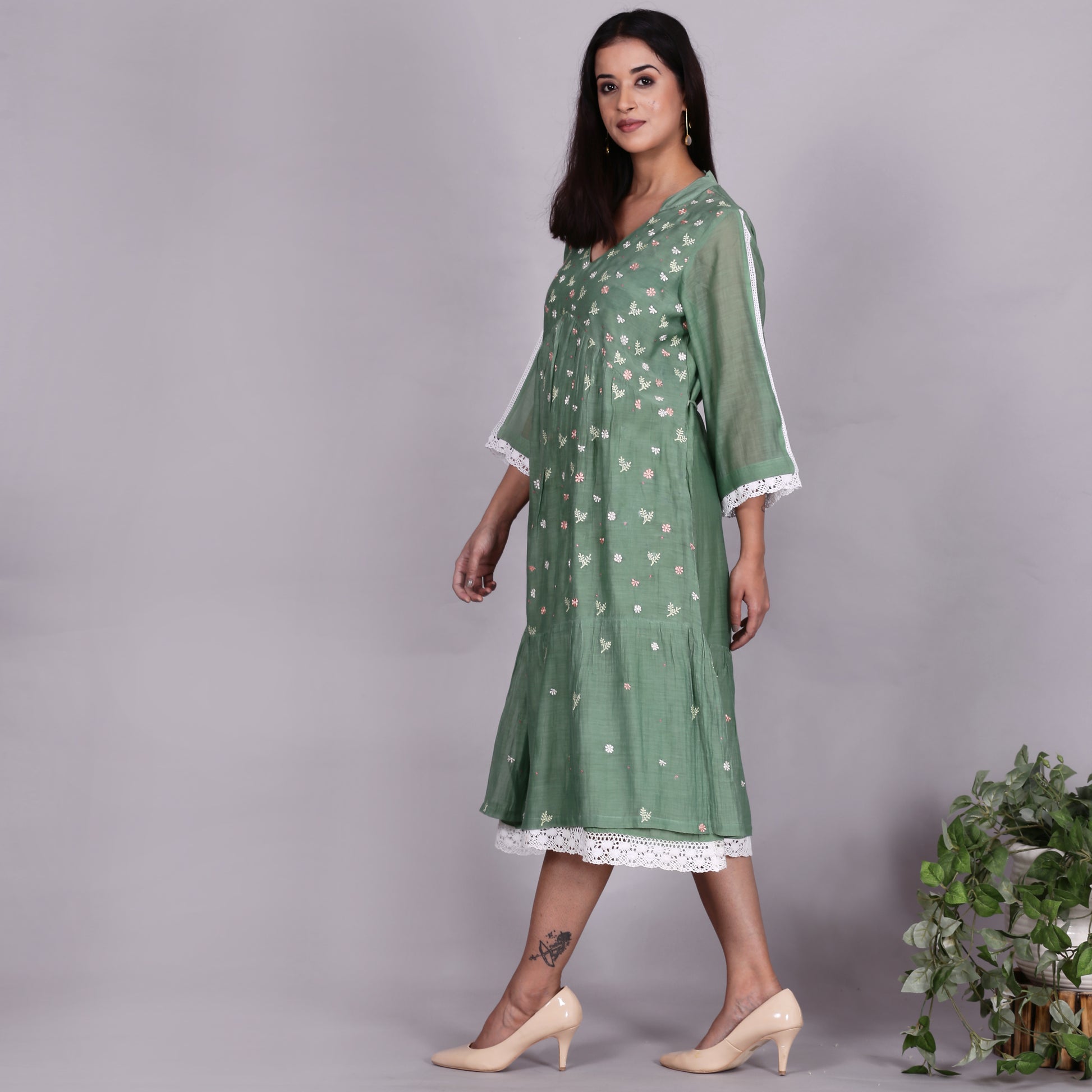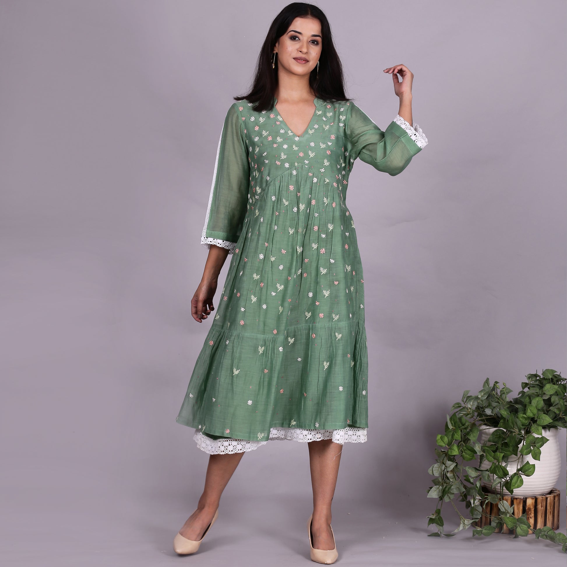 This green Chanderi gathered dress exudes elegance with its delicate embroidery and luxurious fabric. The gathered silhouette offers a graceful flow. This dress is lined with matching fabric. This dress combines traditional charm with contemporary style for a timeless look.