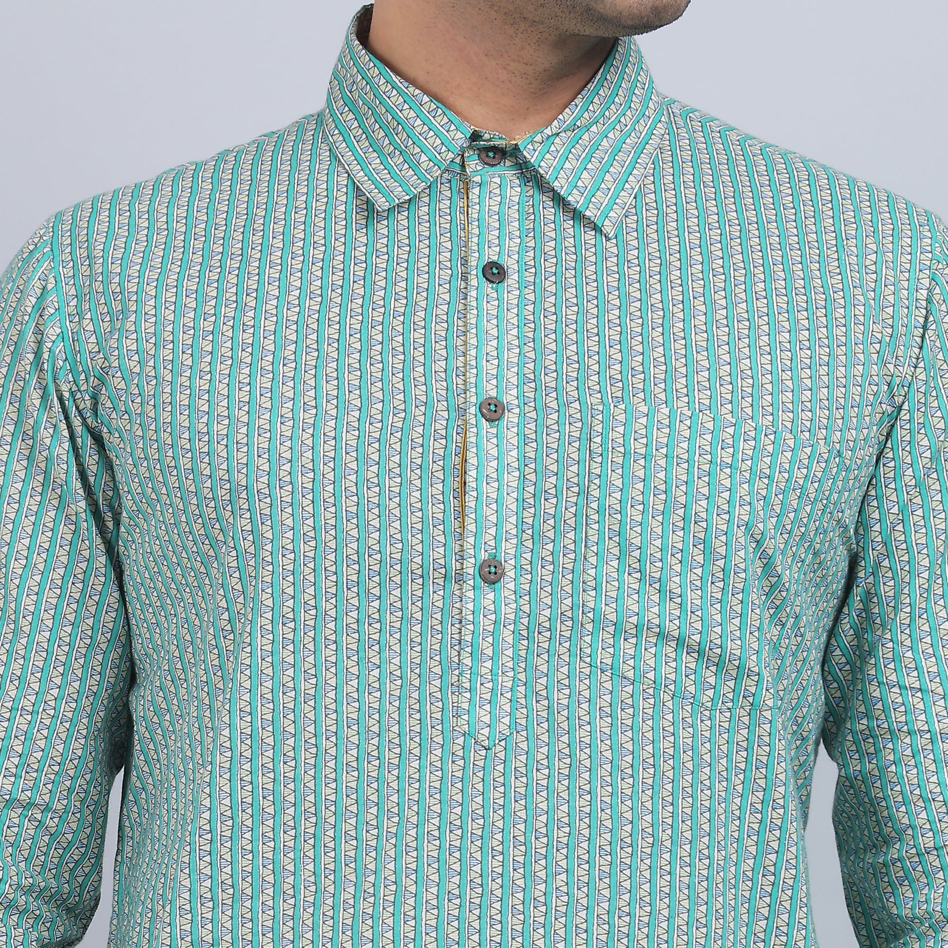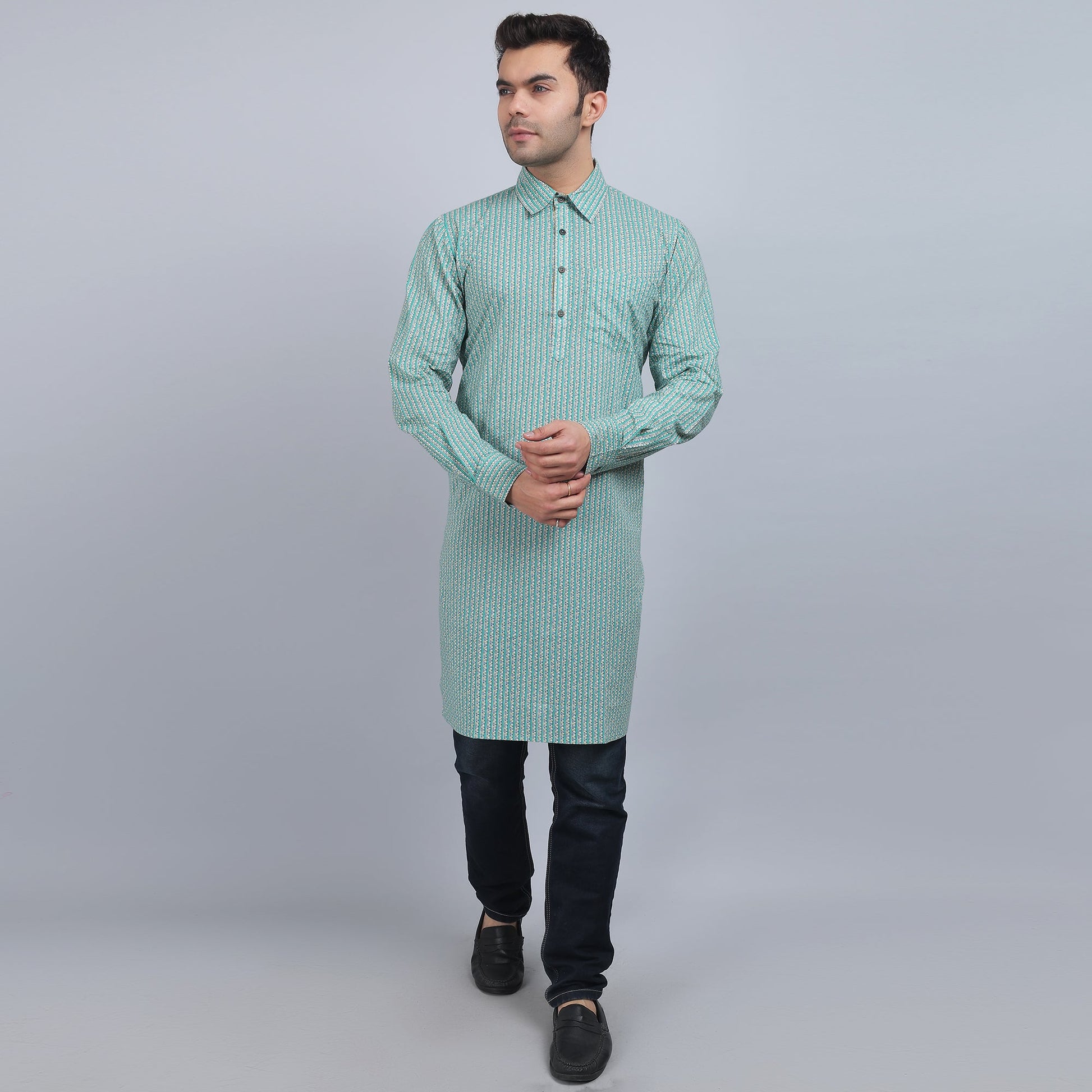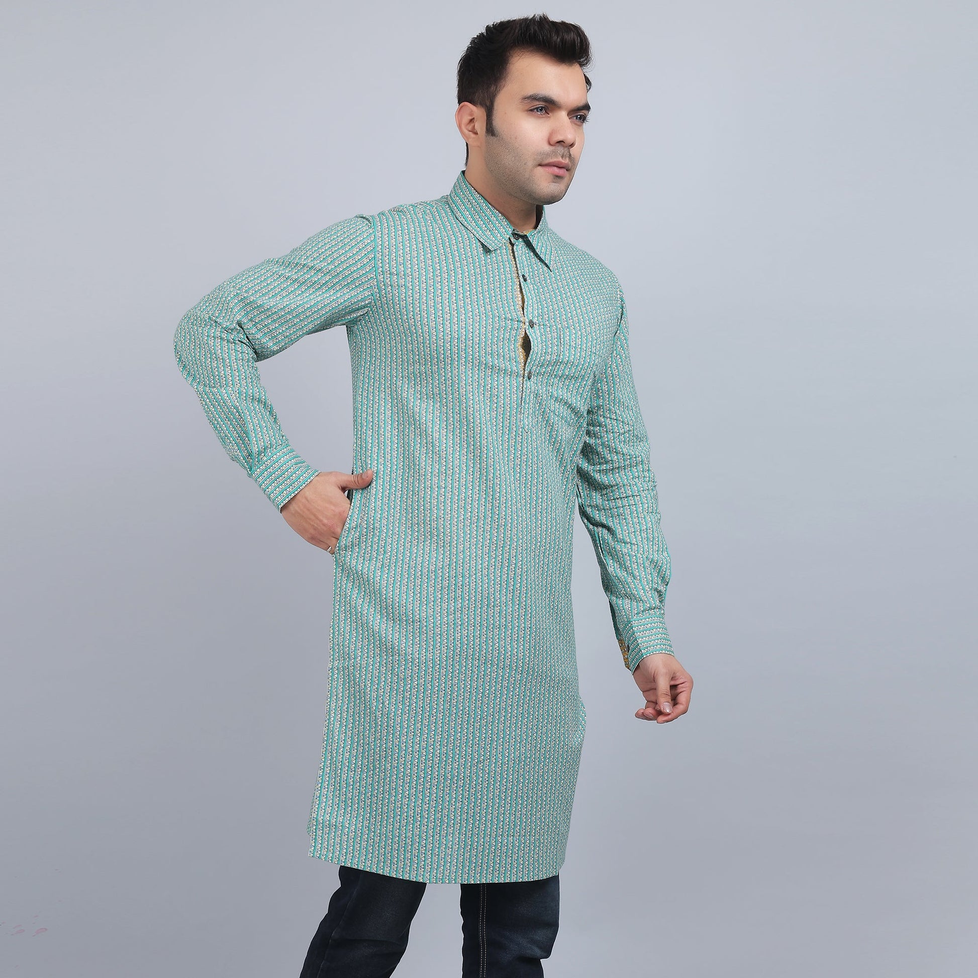Green printed cotton full-sleeves shirt collar kurta in comfort fit. These comfortable yet stylish kurtas are perfect for casual, festive & relaxed evenings. They can be paired with jeans or straight pyjamas.