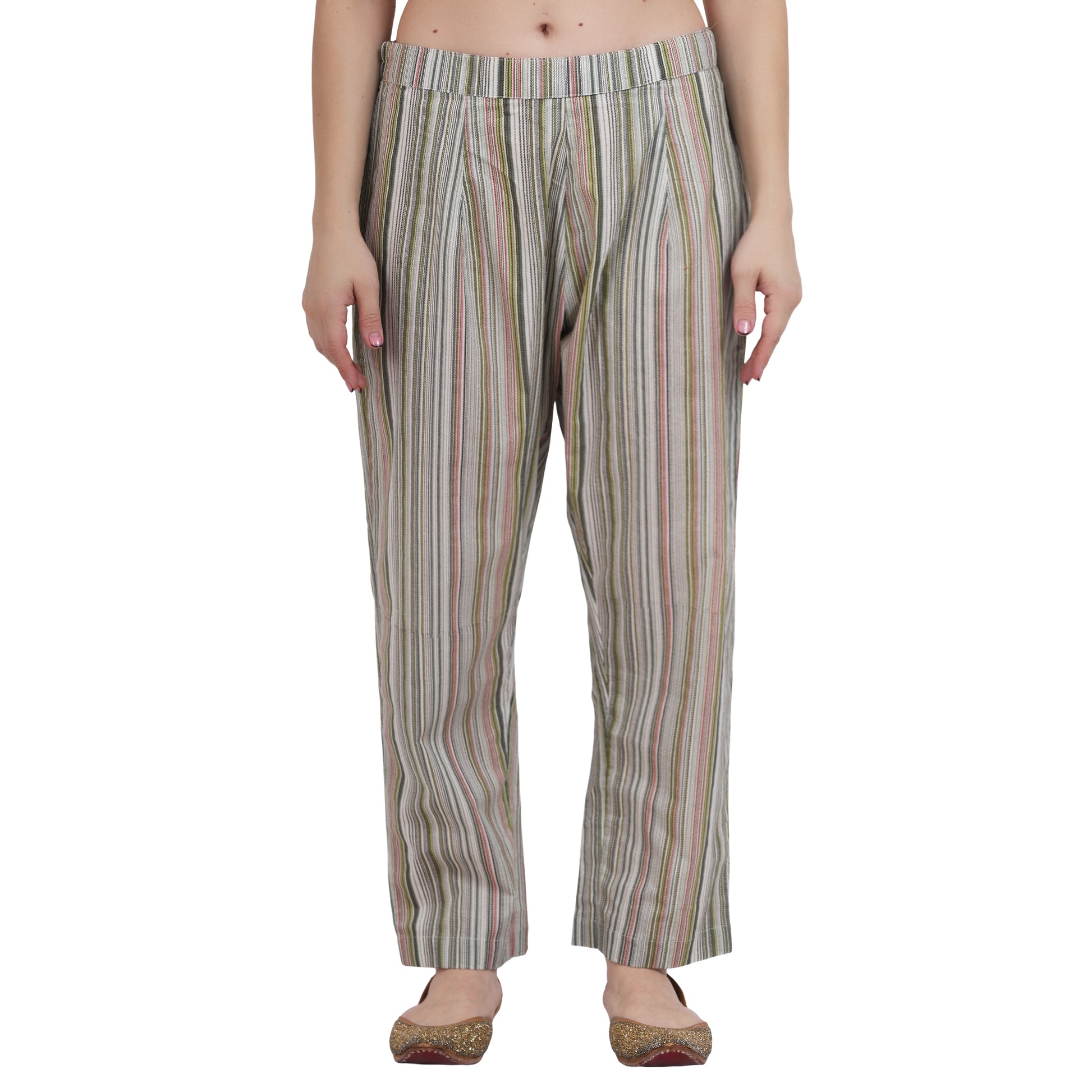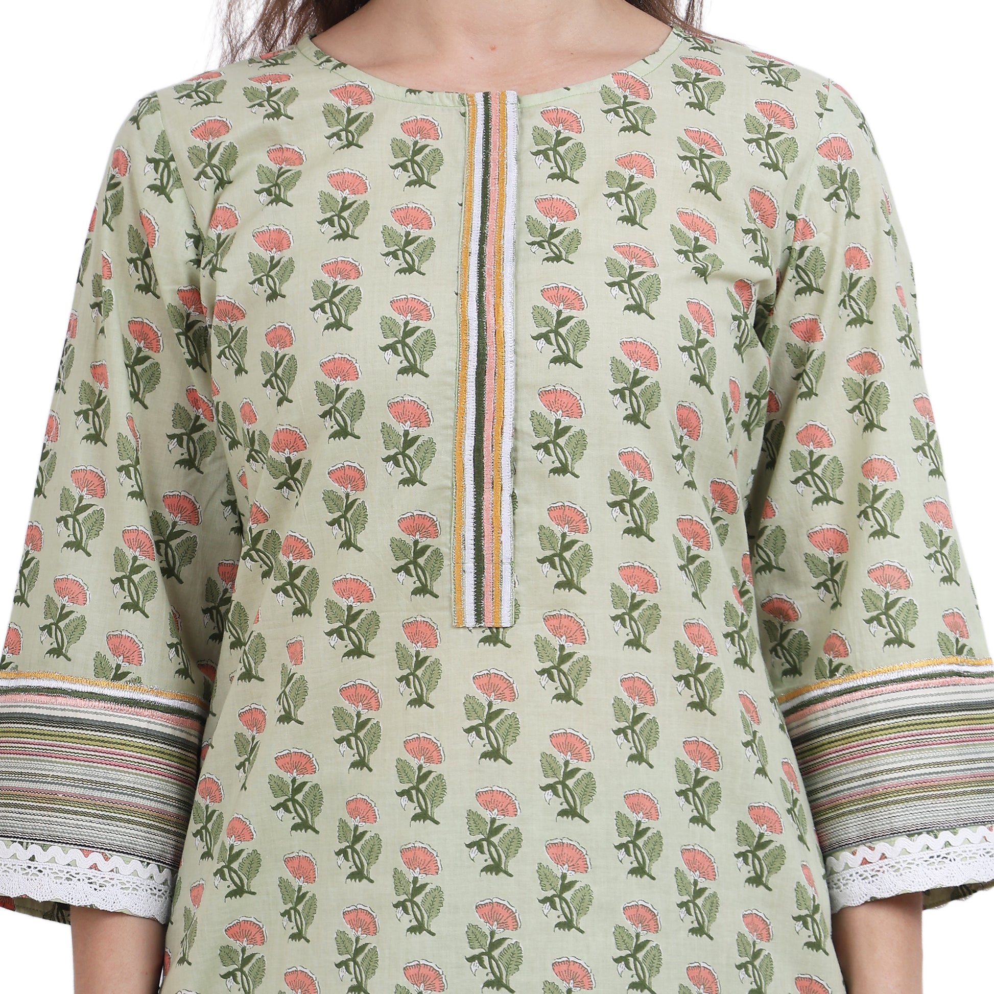 A classic kurta set with round neck & kurta patti detailing and embroidered lace sleeves. It is paired with straight multi-coloured stripe pants.