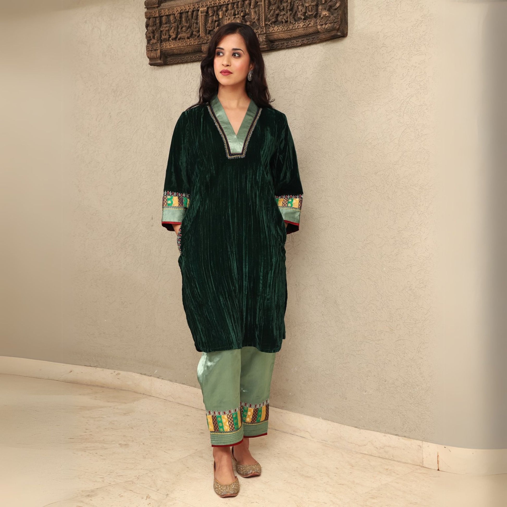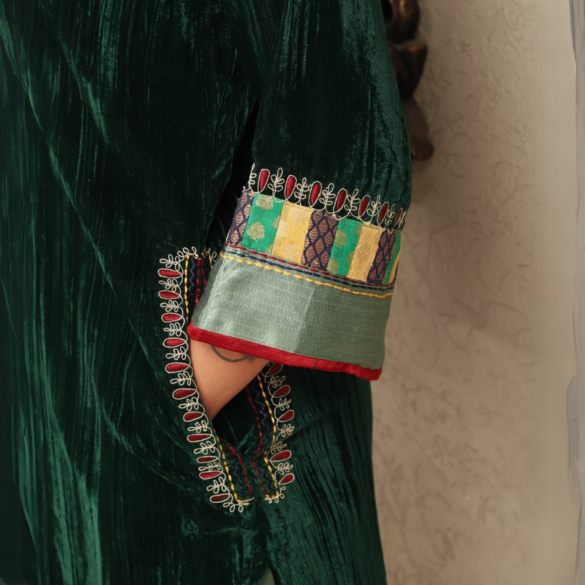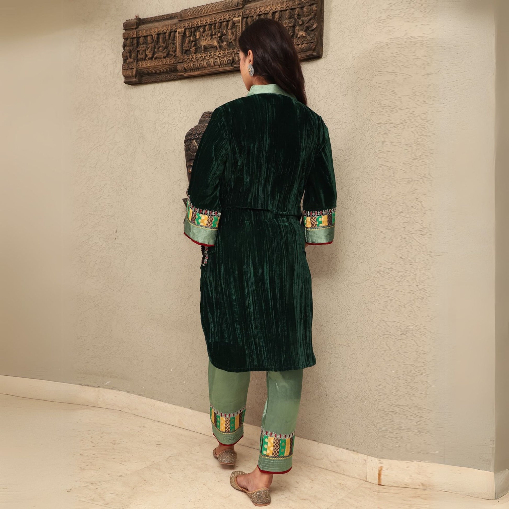 Green Crushed Velvet Embroidered & Brocade Applique Kurta Set with Mashru Silk Pants