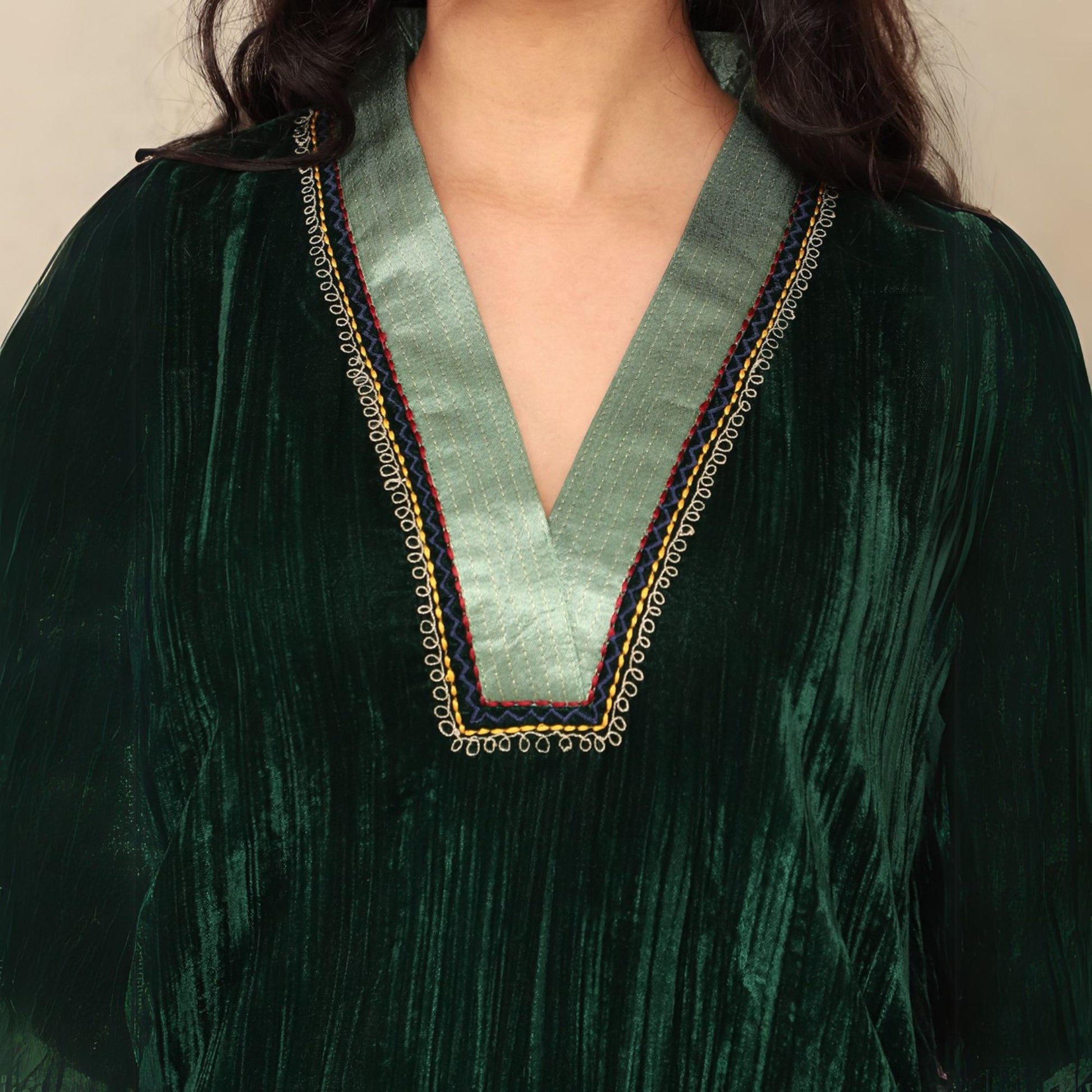 Green Crushed Velvet V neck kurta with brocade applique & Dori/Zari work detailing on neck, sleeves & pockets. It is paired with tonal embroidered mashru silk pants. Perfect outfit for winter celebrations.
