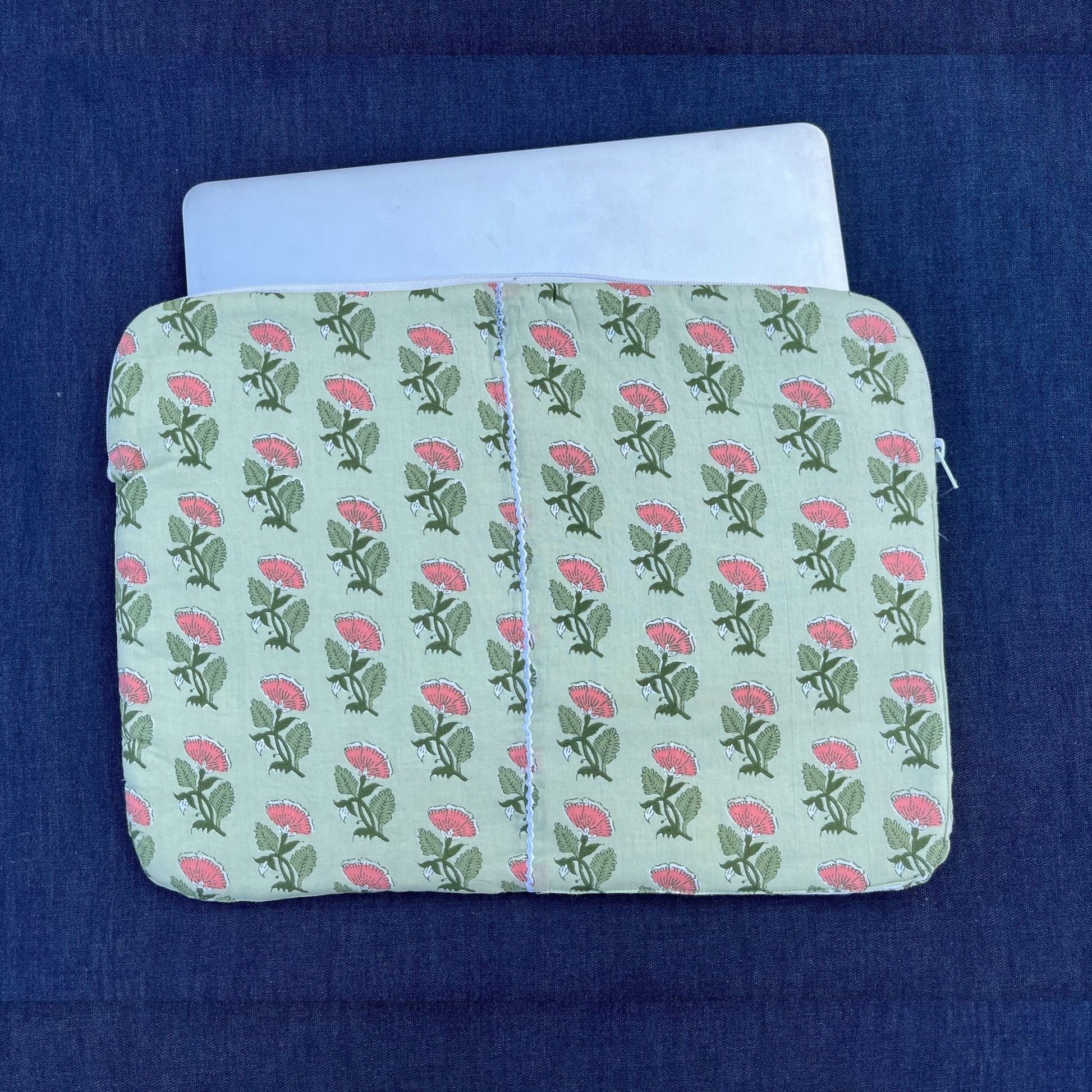 Green printed laptop sleeve to shield your laptop and tablets from scratches and bumps with our eco-conscious range made from pure cotton fabrics seamlessly blending style and sustainability