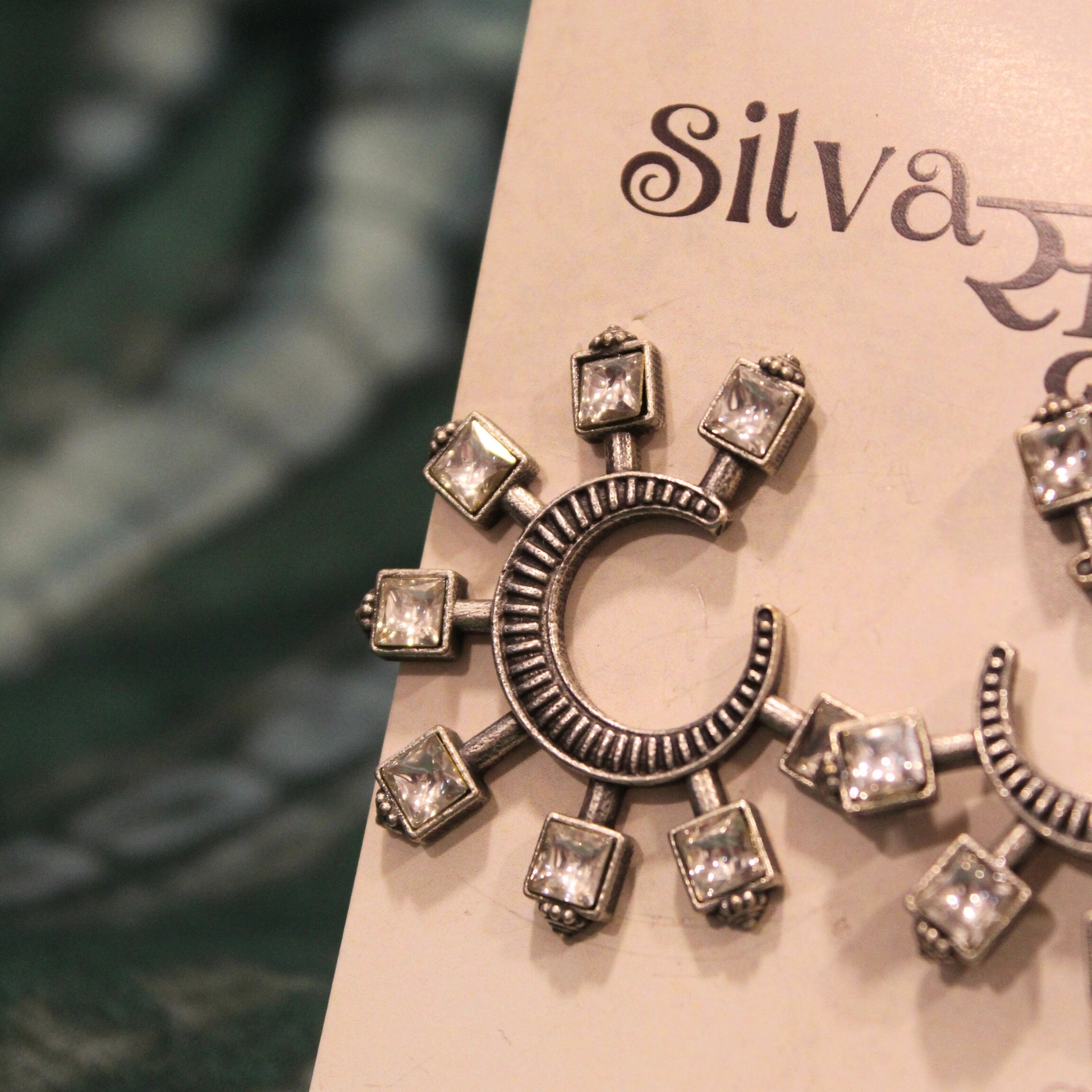 Oxidized silver earrings showcase a central crescent moon motif, encircled by bold radiating arms. Each arm is adorned with a sparkling clear square-cut gemstone, creating a modern celestial-inspired design that is both unique and striking.