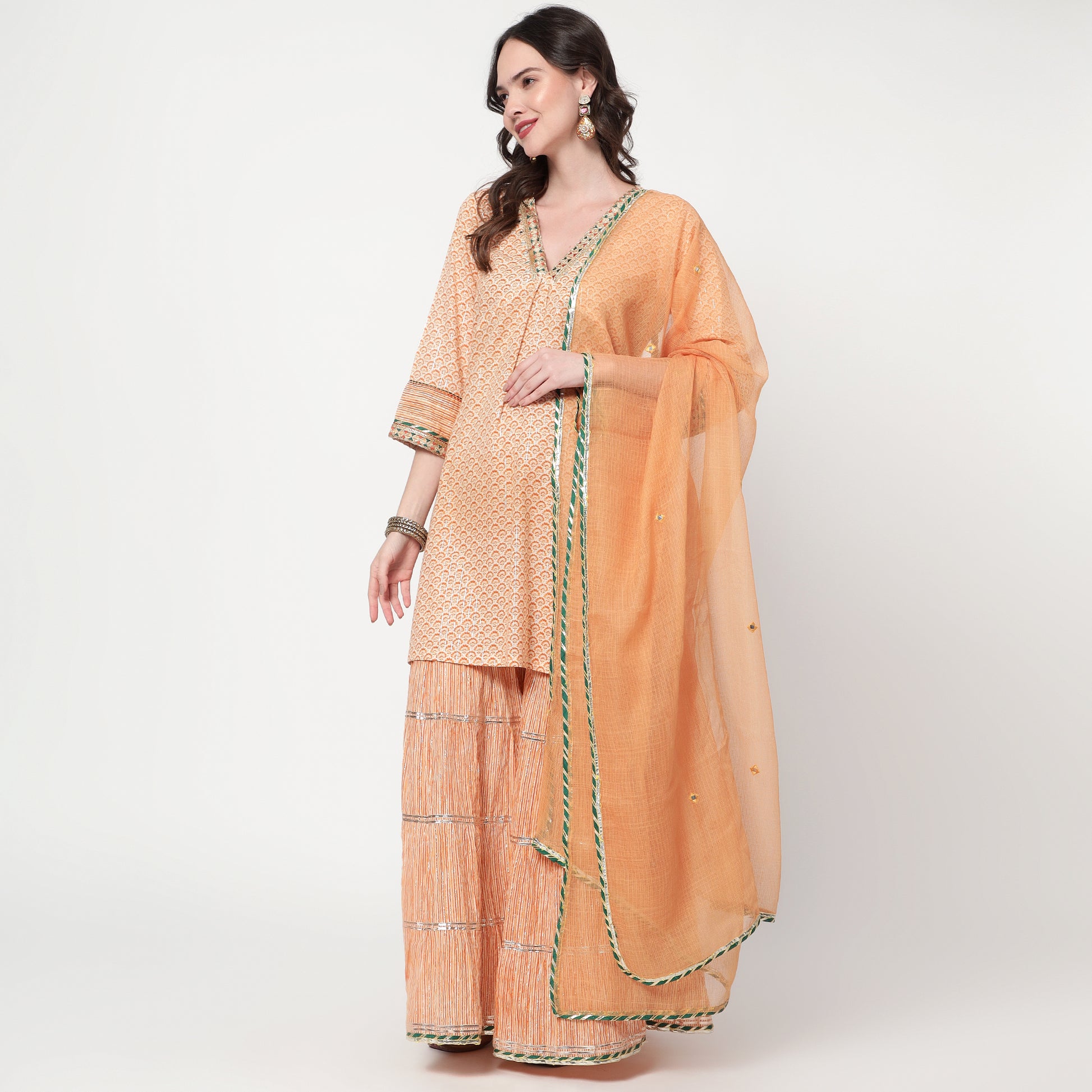 Cotton lurex mix and match printed sharara set with gota and threadwork detailing in beautiful shade of dull orange. Tonal kota dupatta with contrast gota edges adds to the charm of this festive outfit.