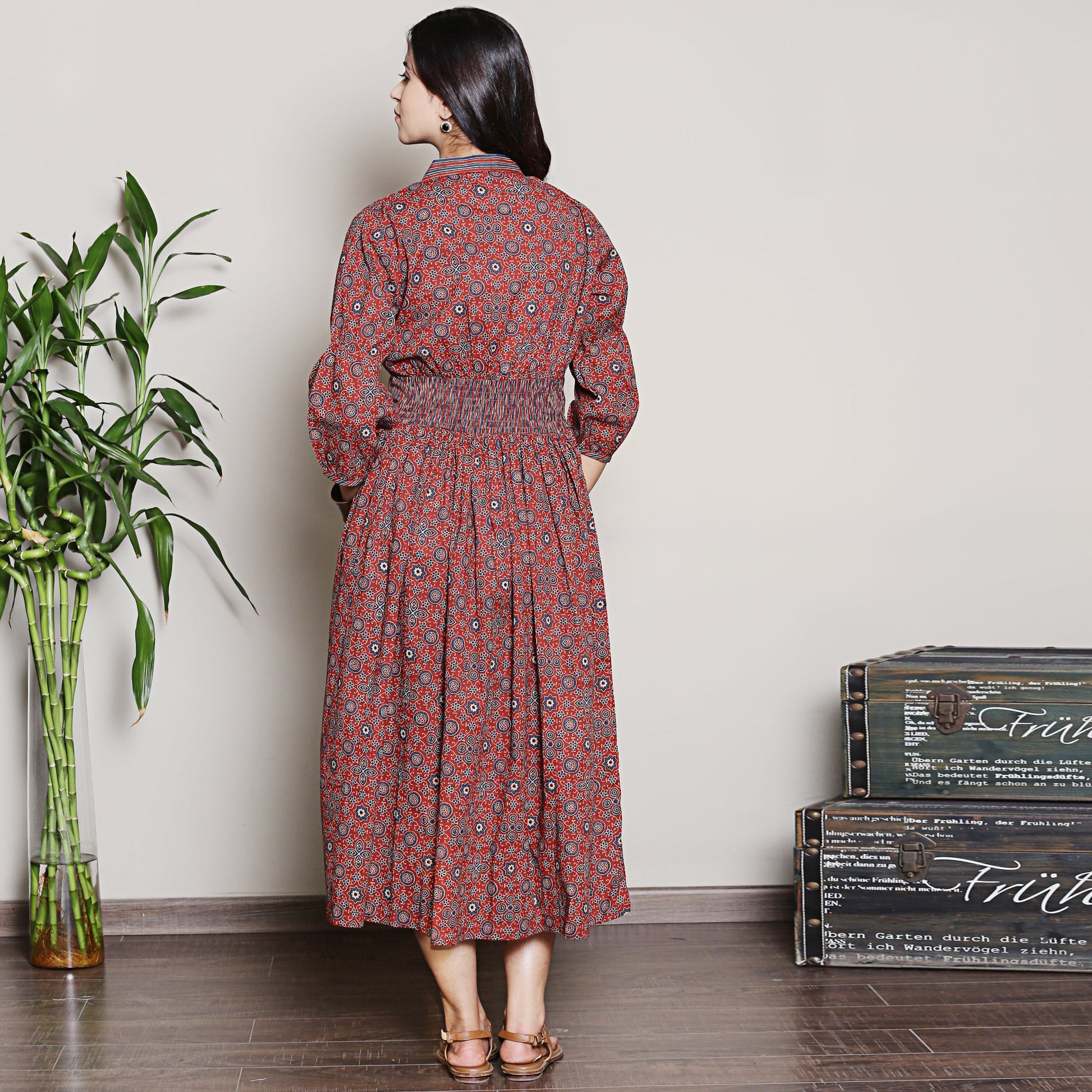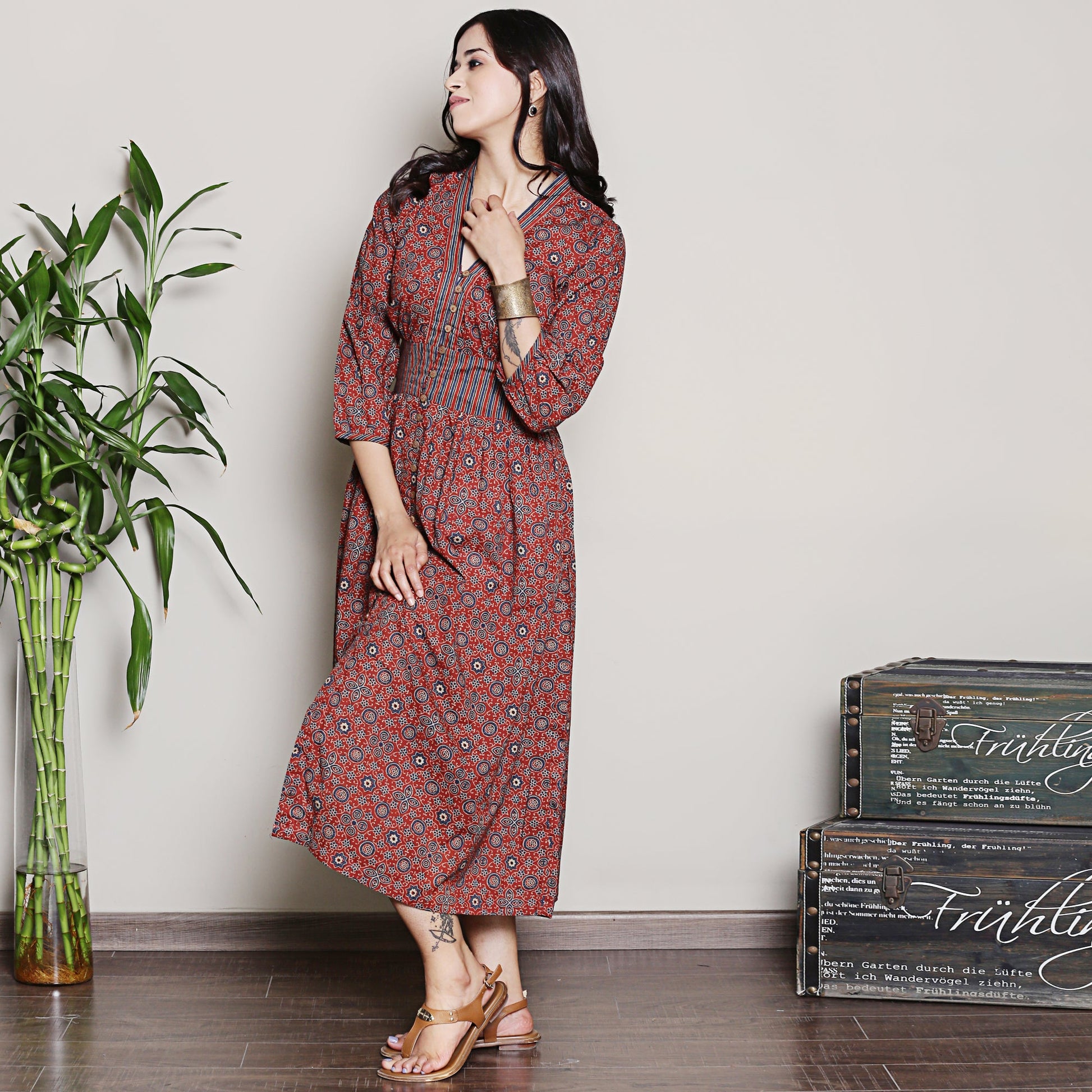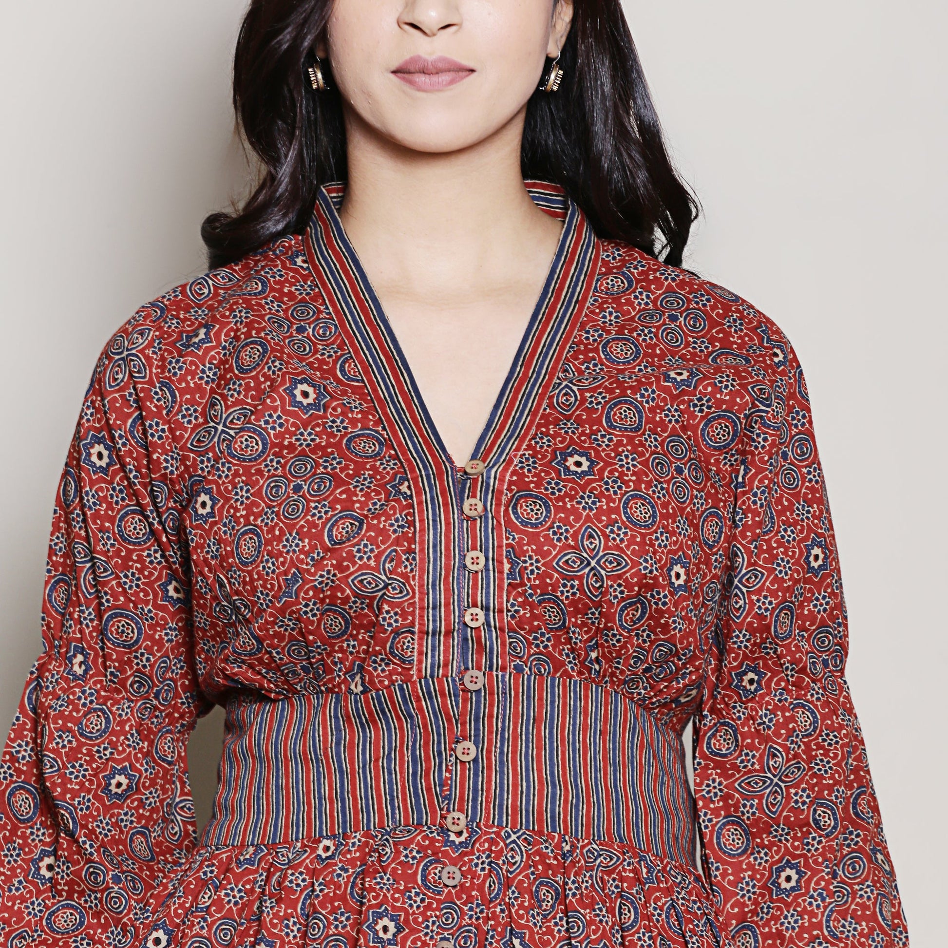 Introducing our V neck maroon printed cotton dress with puffed up sleeves and functional buttons. Embrace the modern sophistication and make a statement wherever you go with this style.