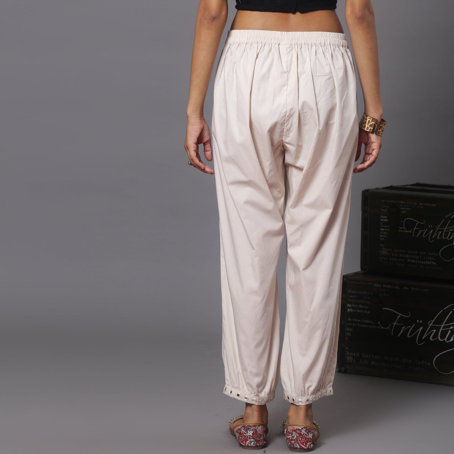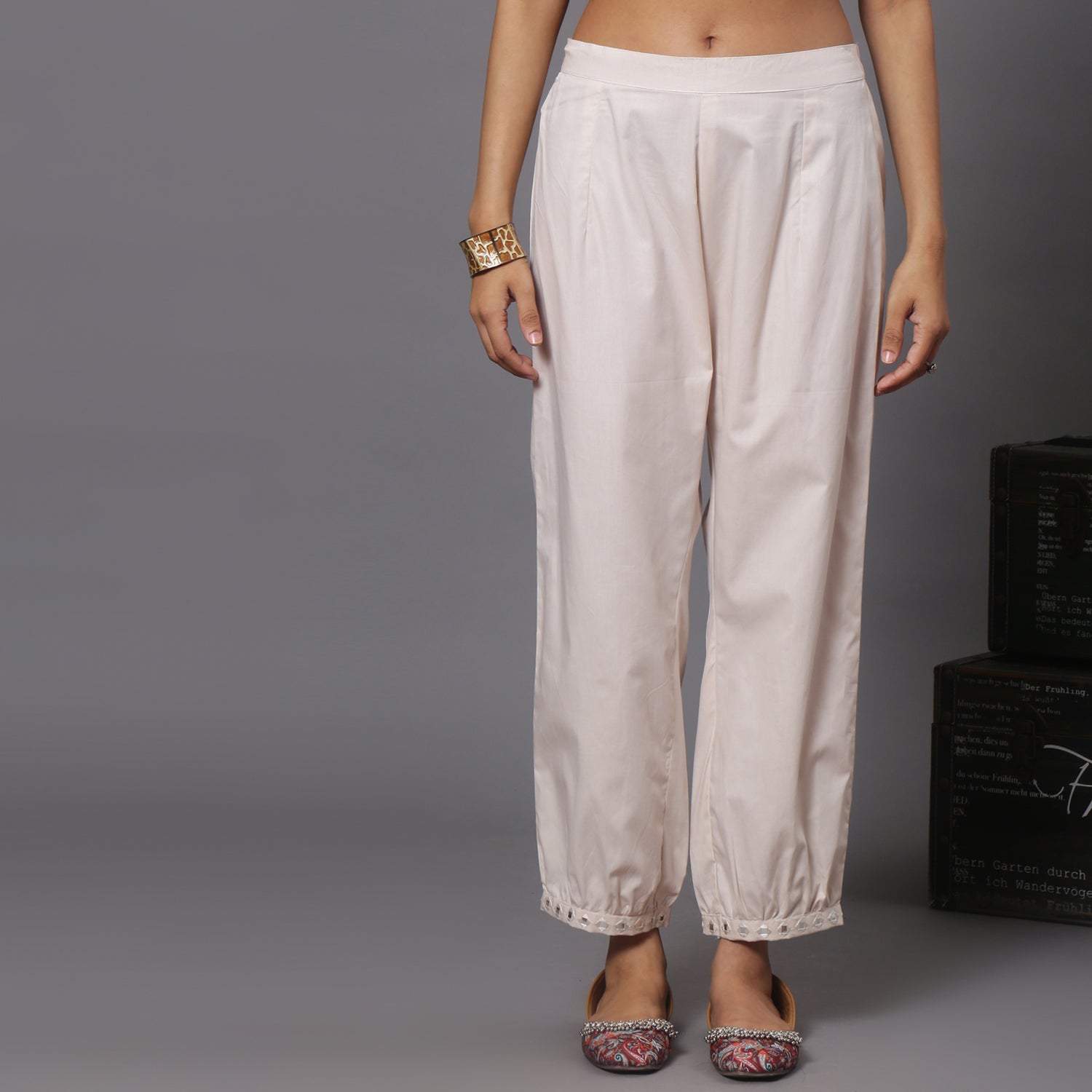 Off-white harem Pants with mirror detailing at the bottom. A summer classic which will pair well with all your kurtas