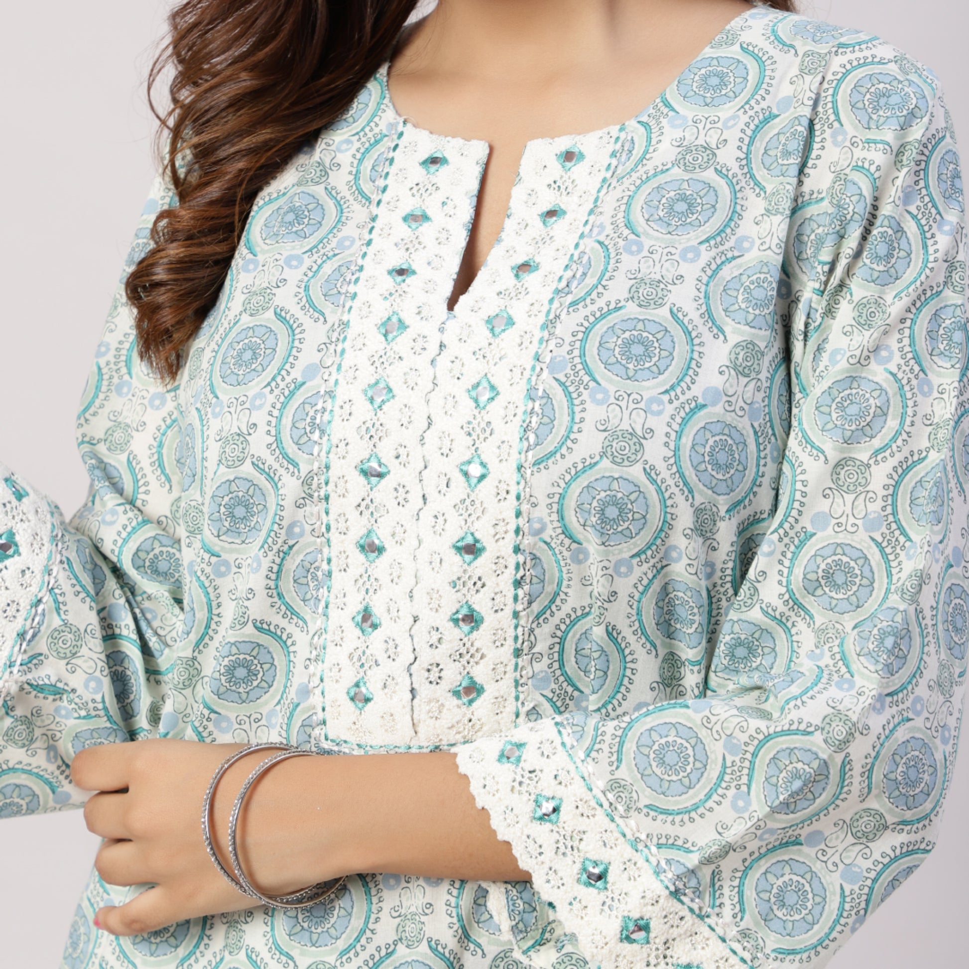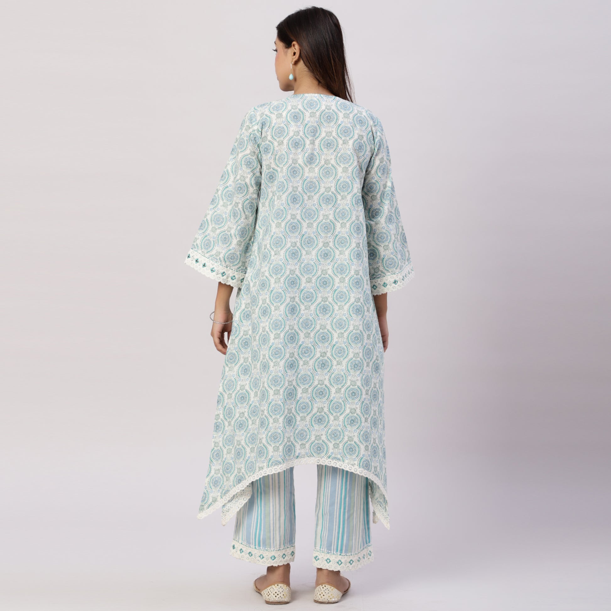Co-ord set with a printed cotton asymmetric kurta and pants with lace & mirrowork detailing . This trendy co-ord set is a perfect choice for day outings.