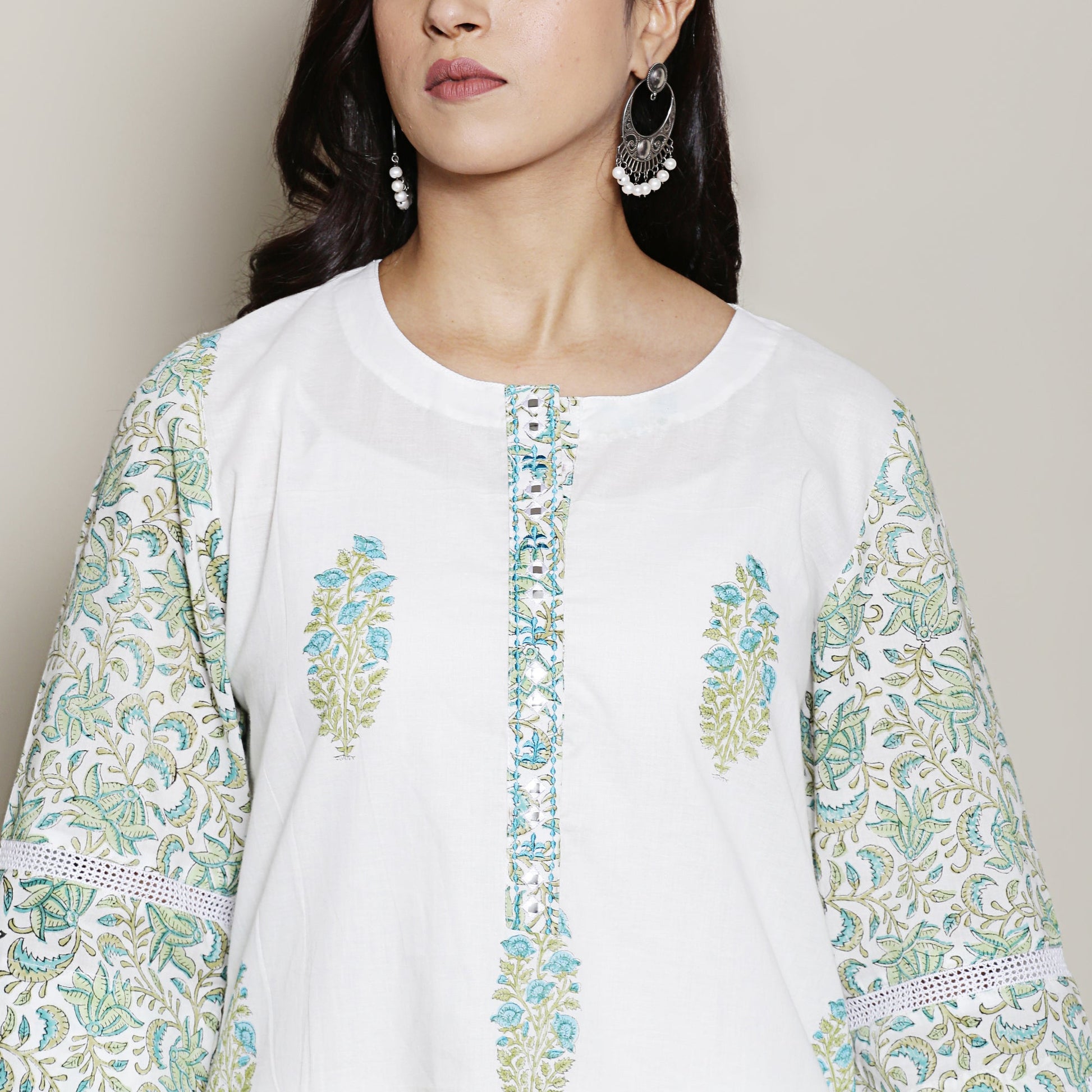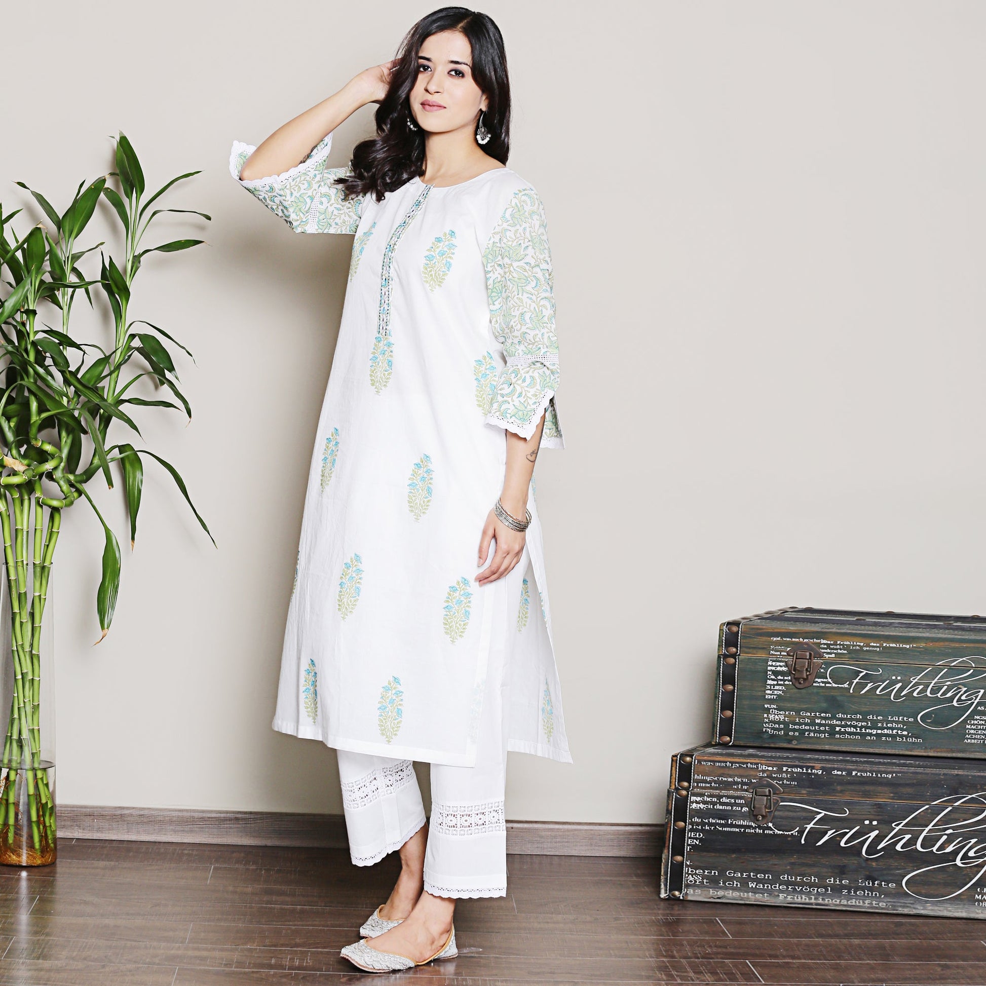 A classic mix-n-match white mughal print kurta Set, made from comfortable cotton fabric with mirrorwork and thread detailing on neck and lace detailing on sleeves. It is best paired with white lace pants and a Kota dupatta finished with white lace which makes it a stylish ensemble perfect for any occasion.