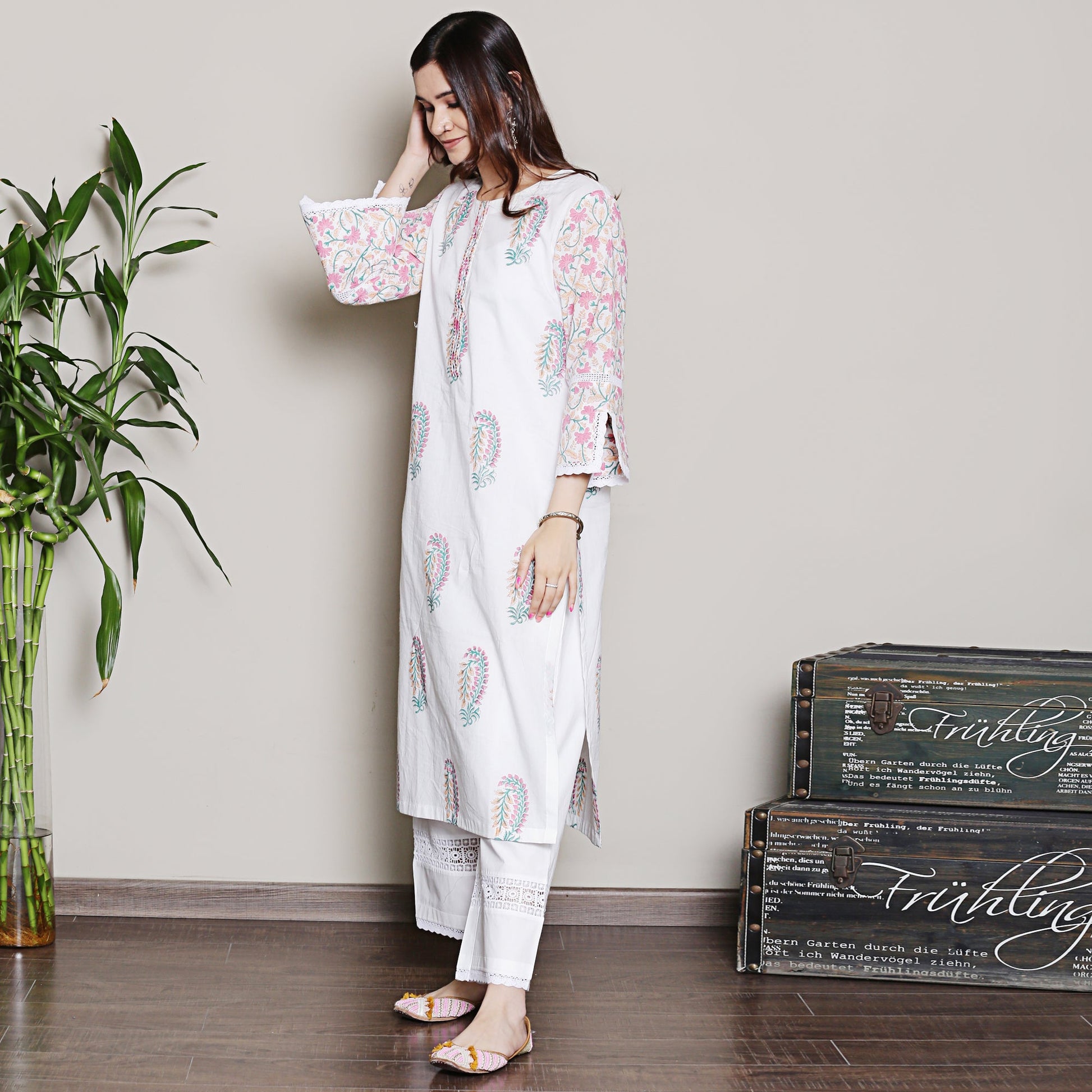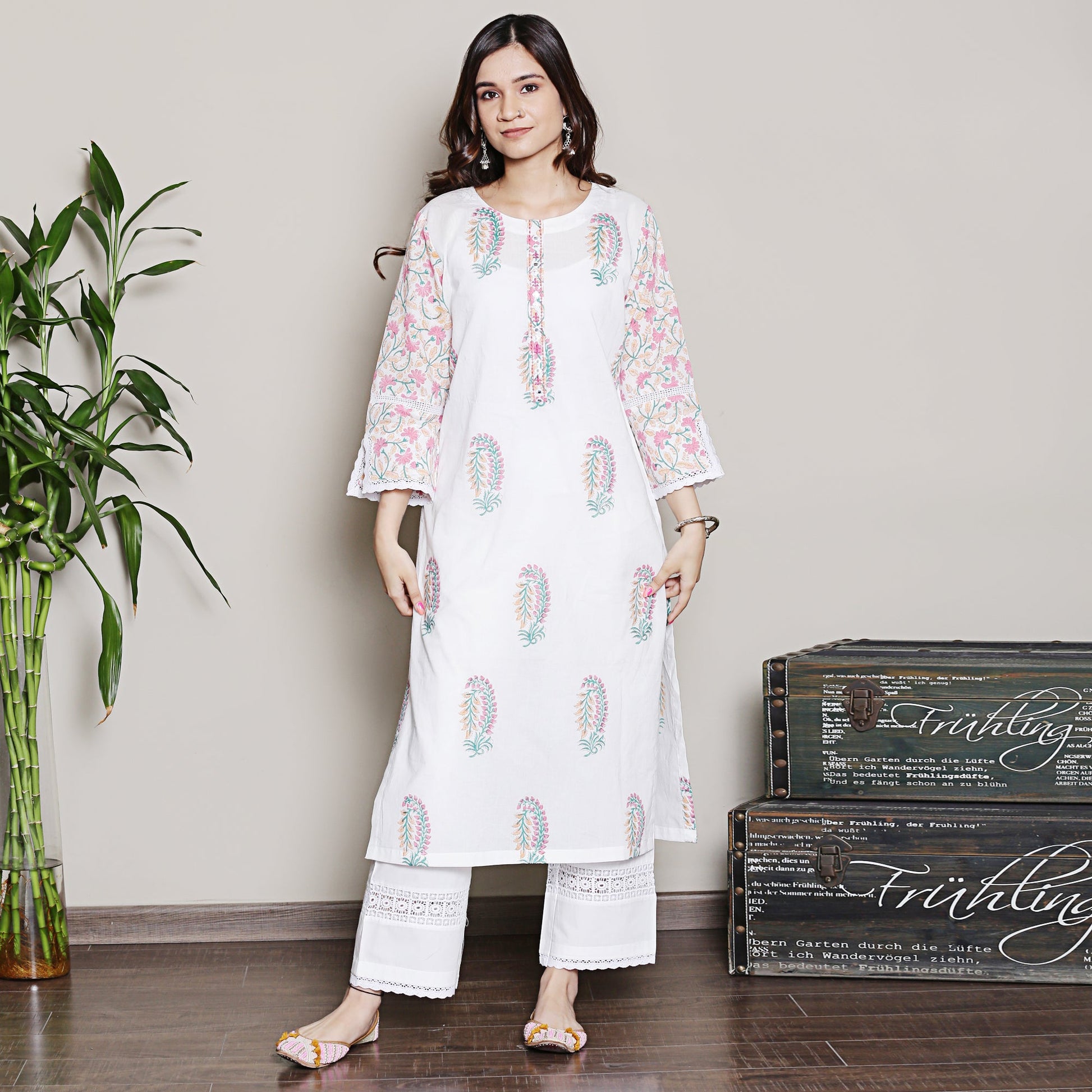 A classic mix-n-match white mughal print kurta Set, made from comfortable cotton fabric with mirrorwork and thread detailing on neck and lace detailing on sleeves. It is best paired with white lace pants. It a stylish ensemble perfect for any occasion.