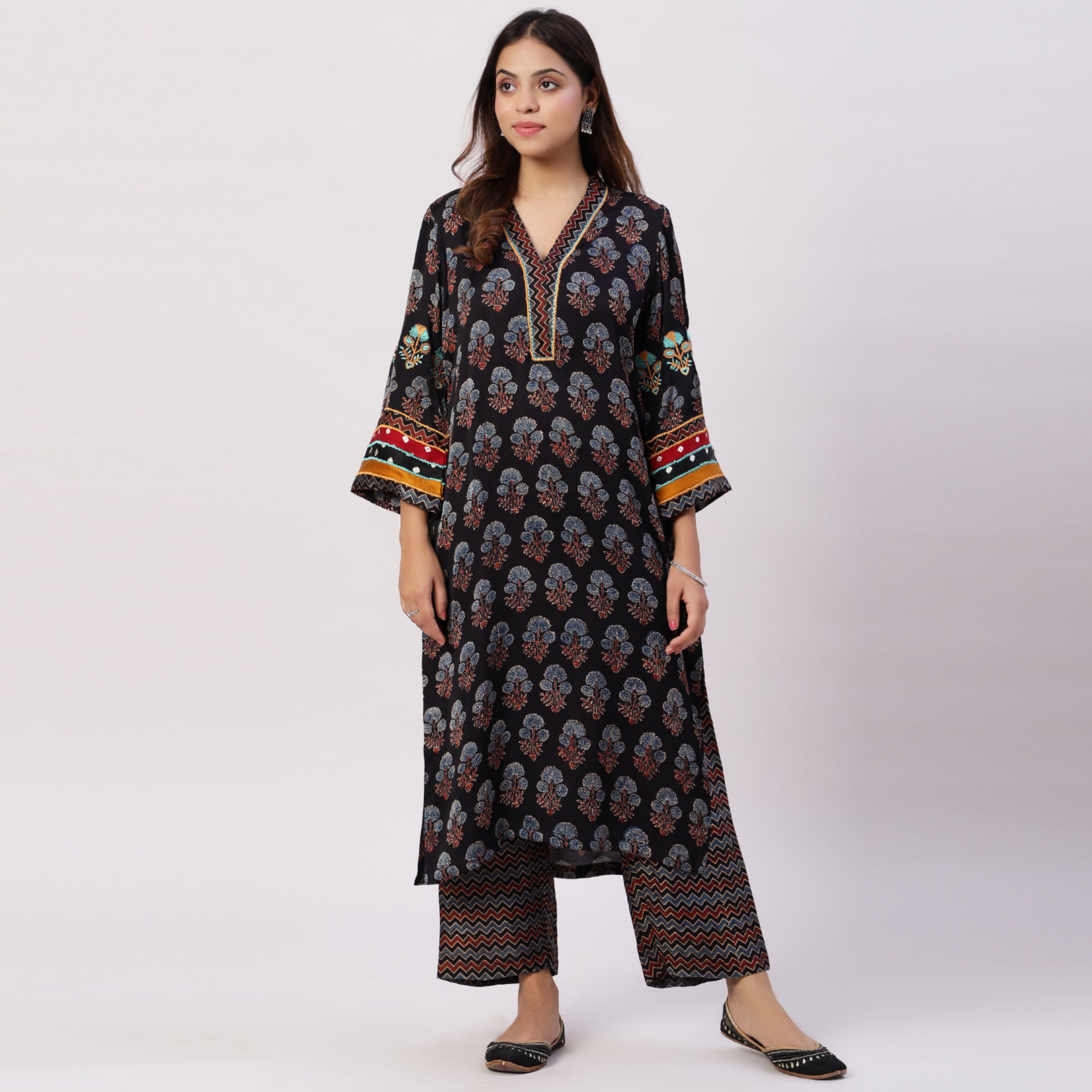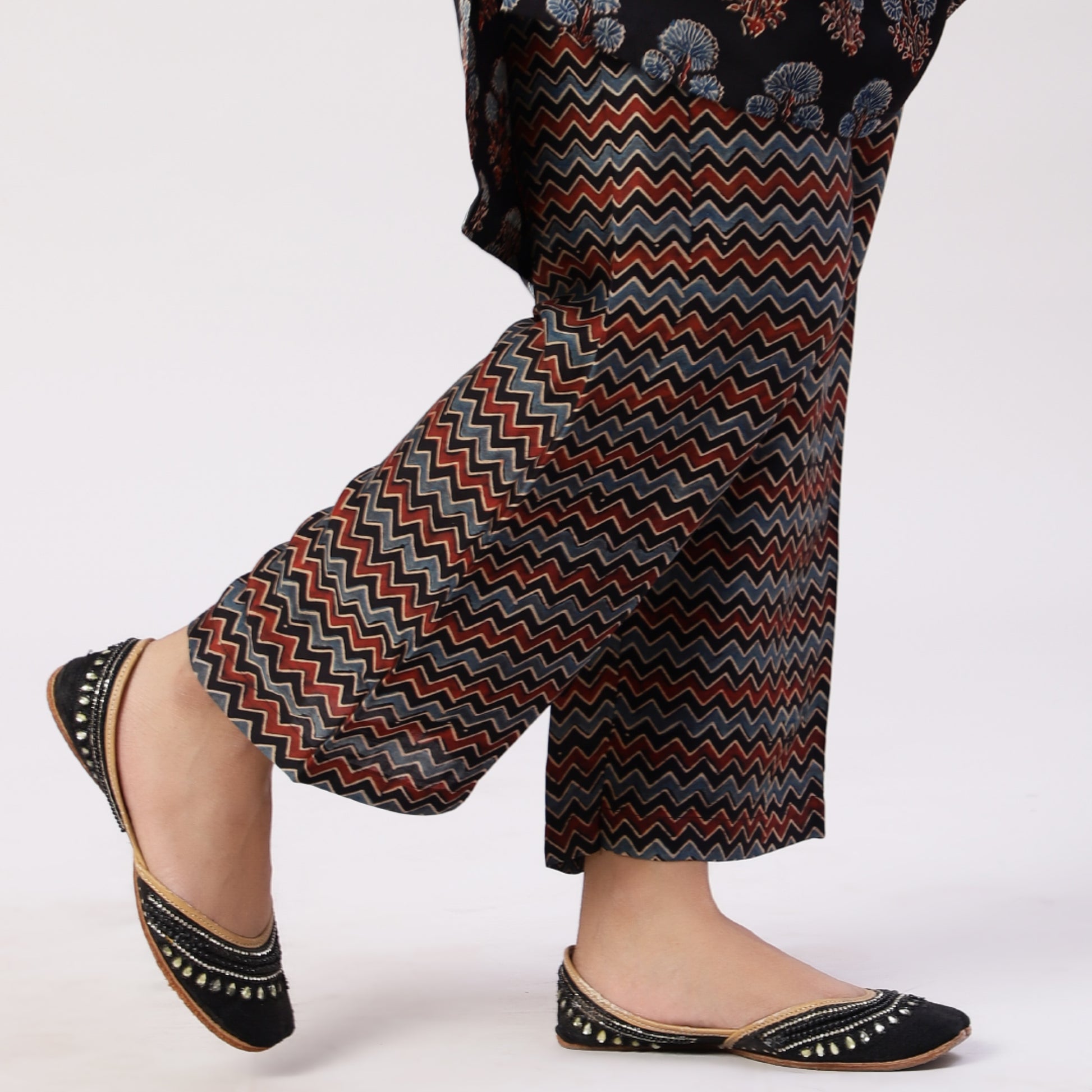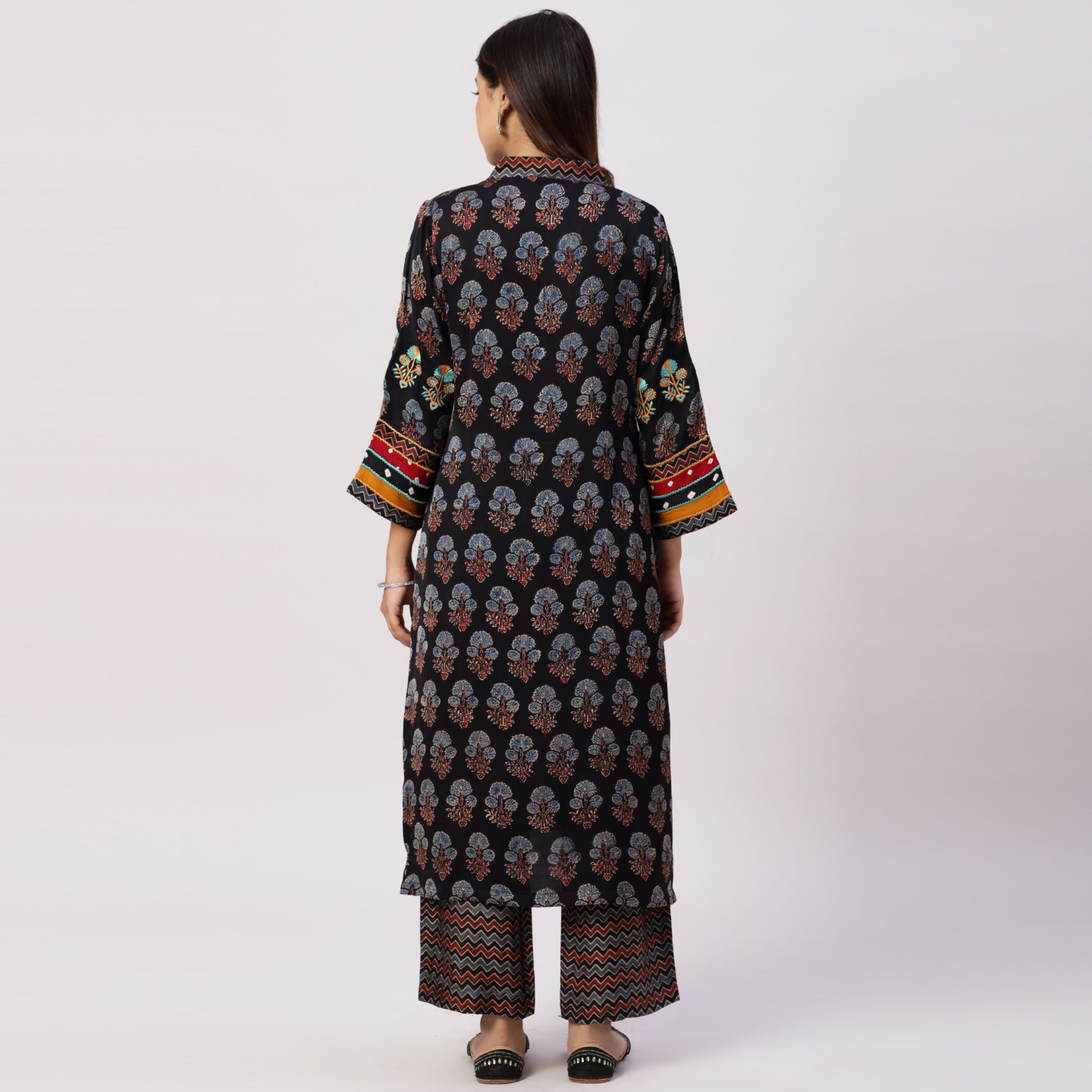 Modal Silk Ajrakh Kurta in mix and match prints with applique, threadwork and dori embroidery on neck and sleeves. This classic kurta is paired with striped tonal modal silk pants for a contemporary look.