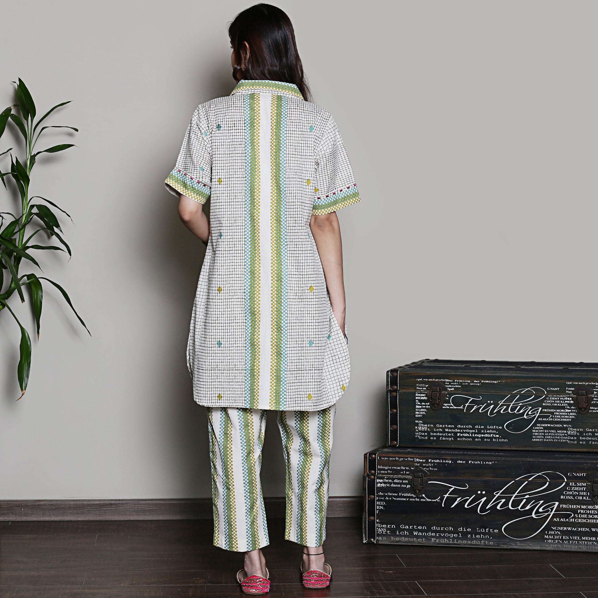 Off-white cotton flex collared co-ord set with geometric print. It is best paired with striped pants. It is a perfect choice for all day comfort.