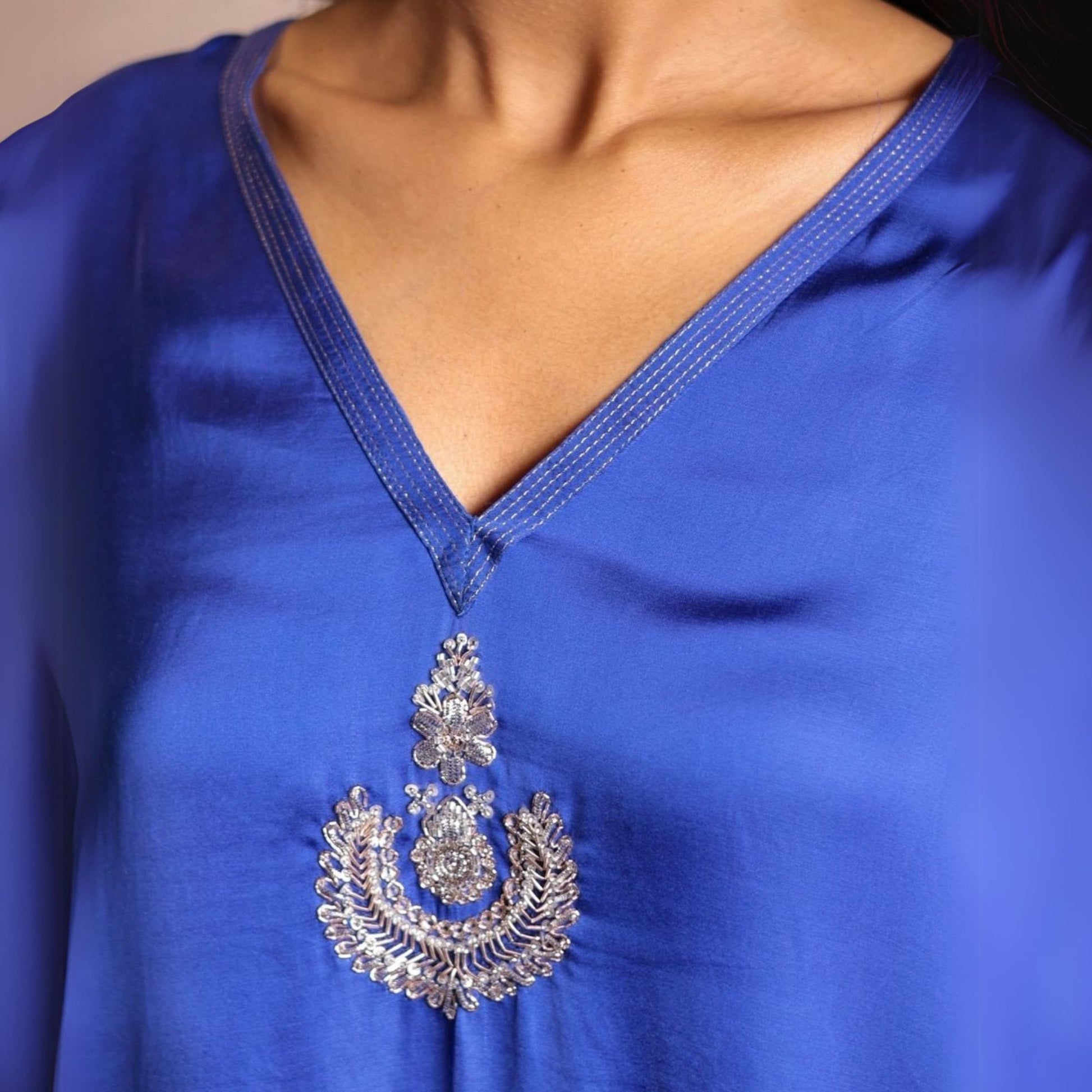 Make a statement with the Navy Blue Sheer Buta Co-ord Set. This modal silk kurta features a V-neck with intricate hand-embroidered buta and delicate zari detailing on the neck and sleeves. Paired with modal pants, the look is elevated by a hand-embroidered buta organza patch at the hem, blending timeless elegance with modern design.