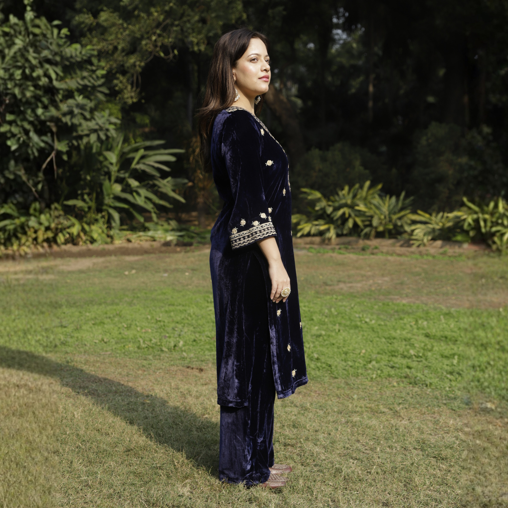 Drape yourself in luxury with this stunning Heavily Adorned Velvet Ensemble. The rich velvet features intricate Zari embroidery and dori work across the kurta and pants accented with subtle yet beautiful threadwork detailing. Complete with perfectly matching velvet pants, this two-piece set is designed to make a truly sophisticated statement at any winter event.