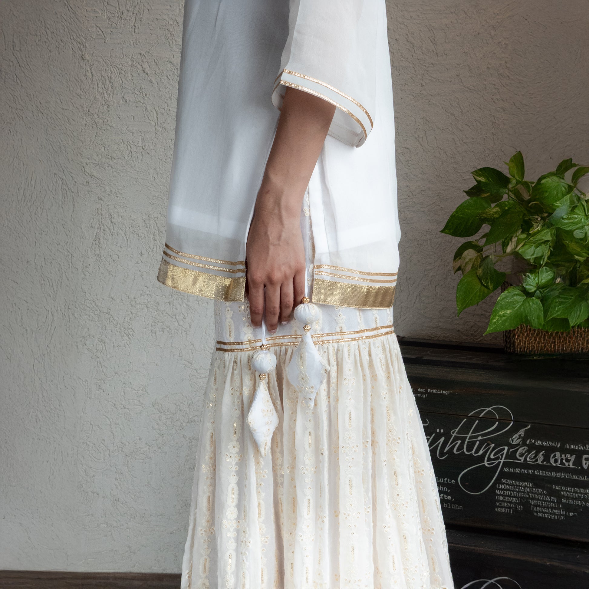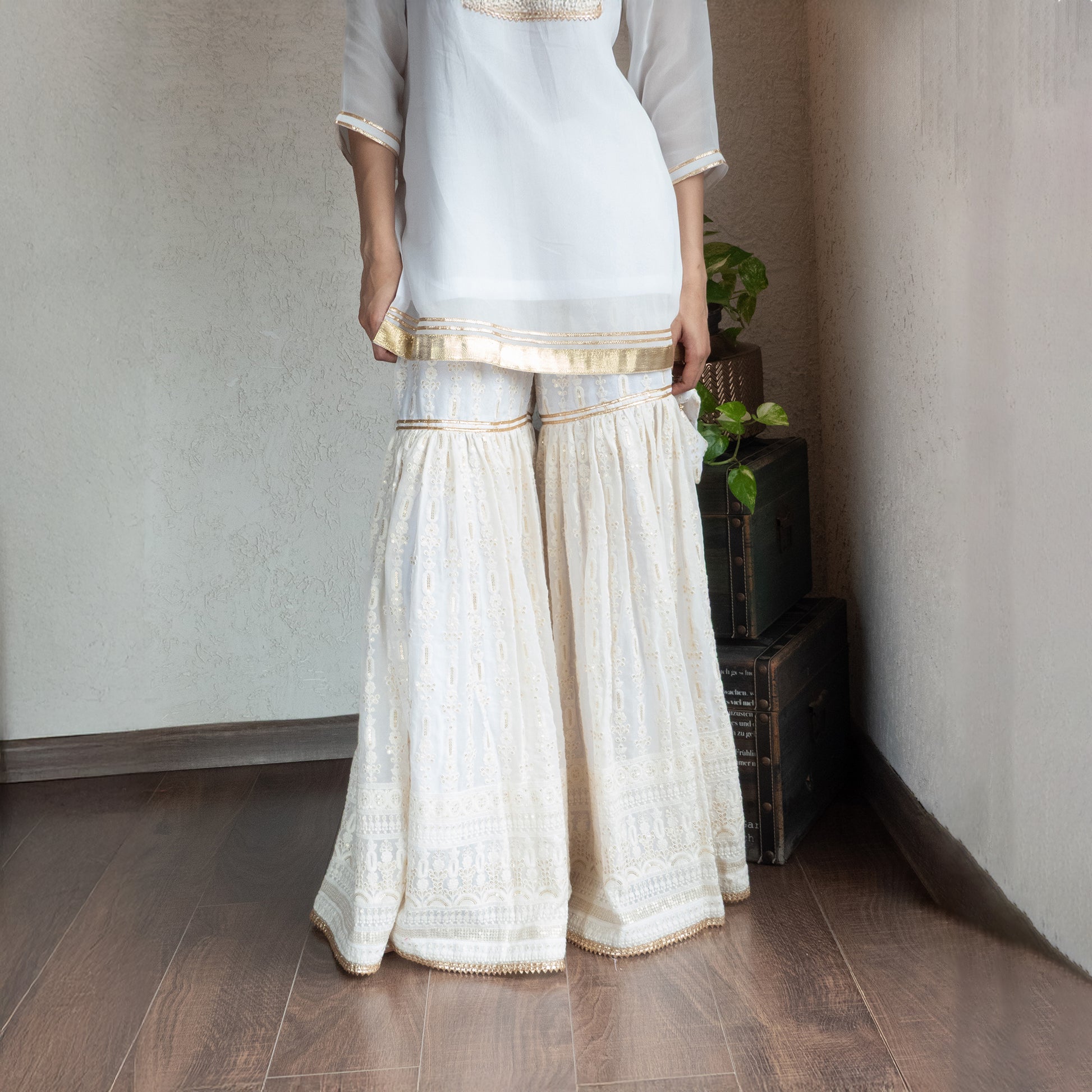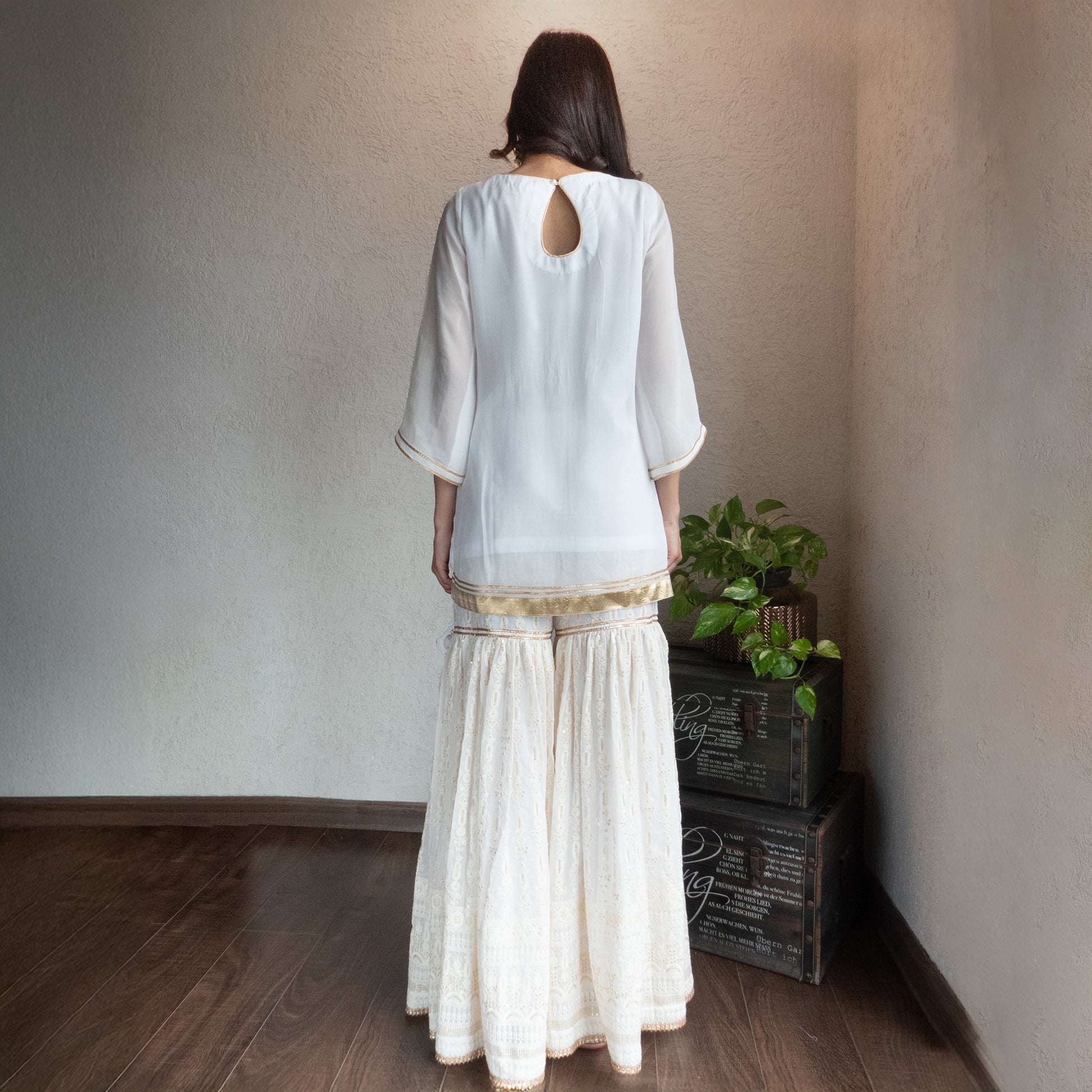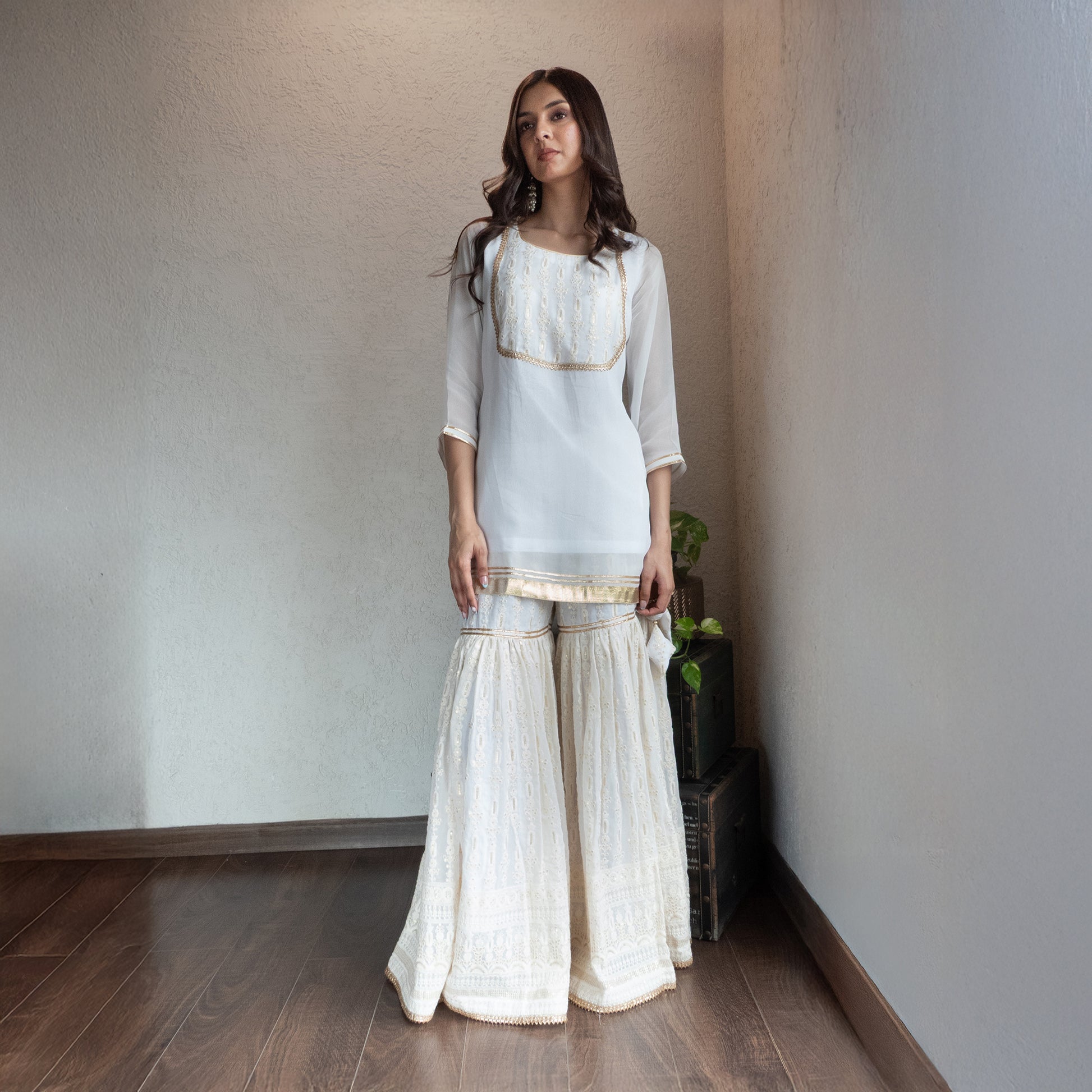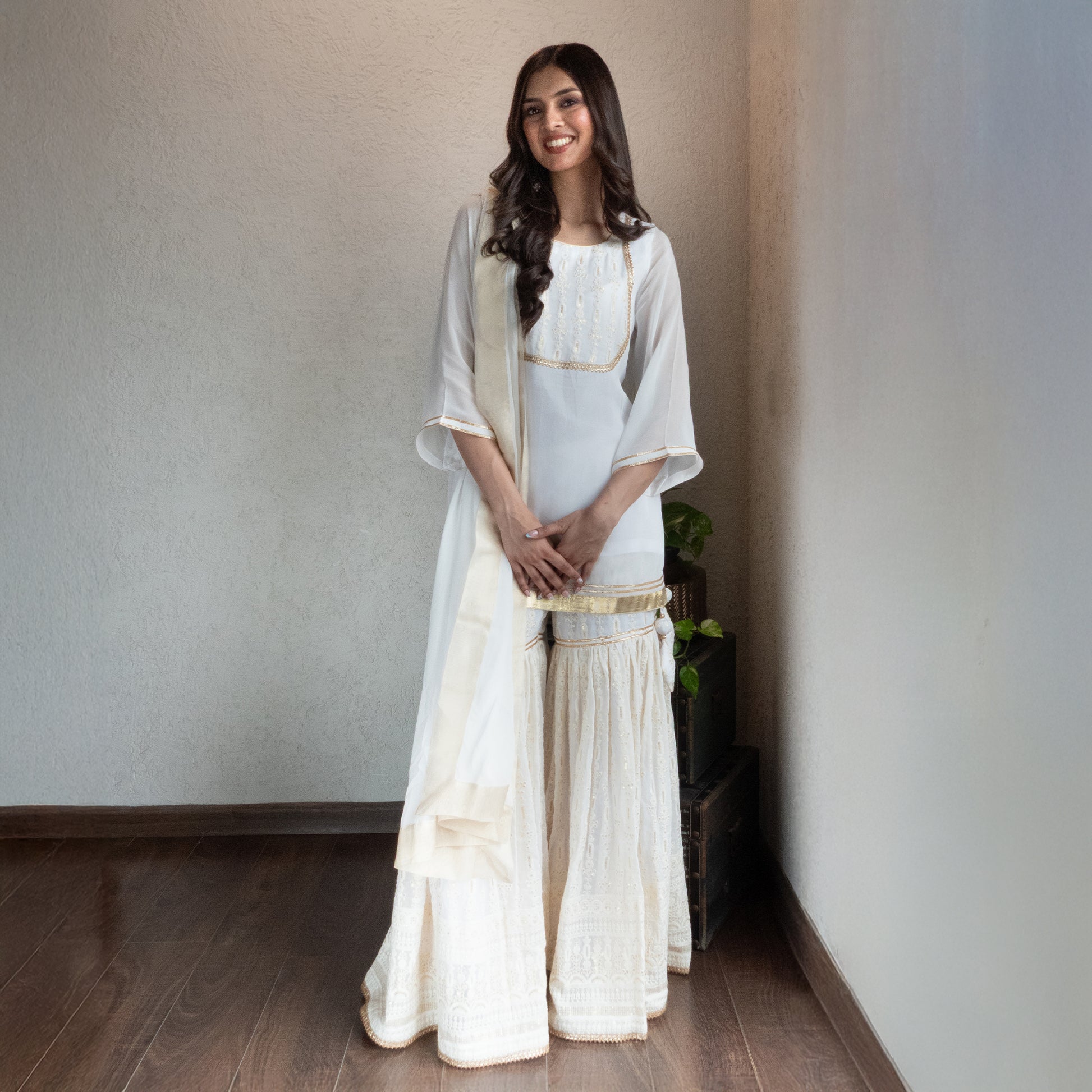 Off white Georgette kurta and Embroidered Sharara set with Dupatta