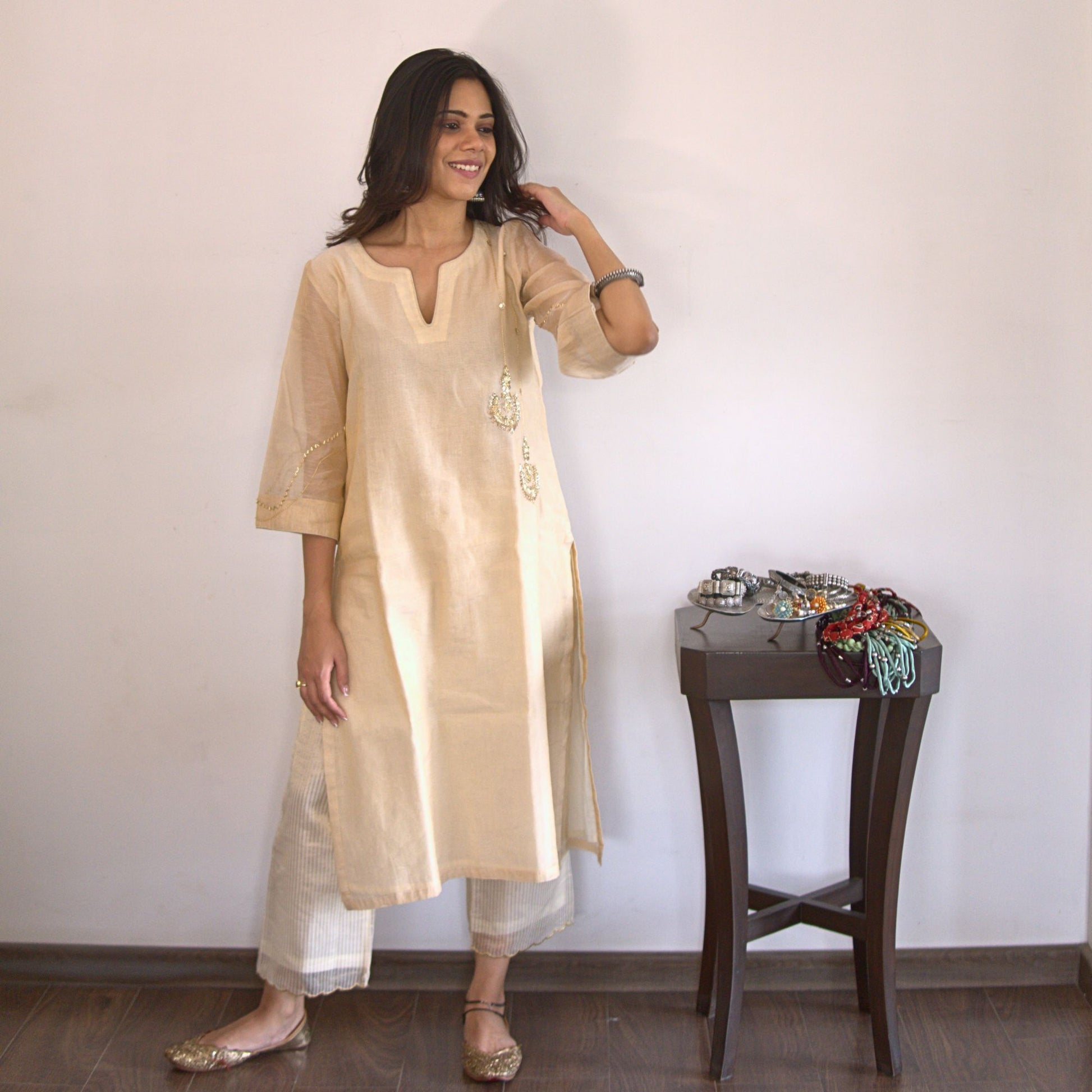 A graceful formal pick, this Natural metallic Chanderi set features delicate hand-embroidered Chandbali motifs. The sleeves are adorned with abstract hand-embellished beads, and it’s paired with matching trousers. Minimal, refined, and really pretty.