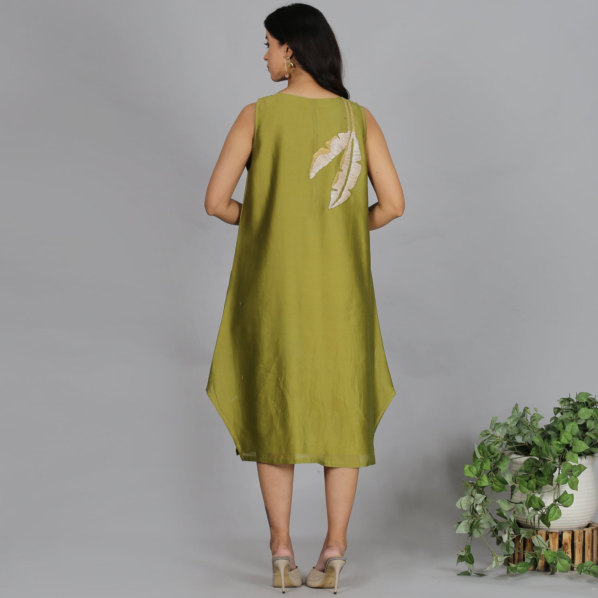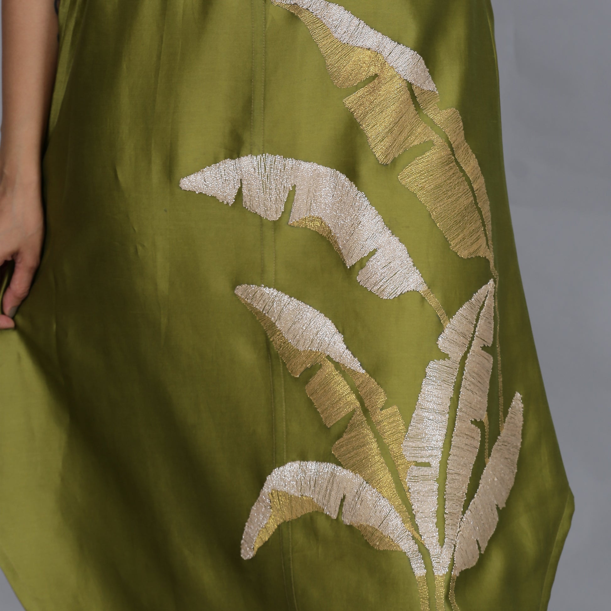 Our olive green chanderi dress, designed with a modern straight cut, features exquisite leaf embroidery in silver and gold dori on both the front and back. This dress also includes a matching slip dress for added comfort and style. Perfect for festive occasions or formal events.
