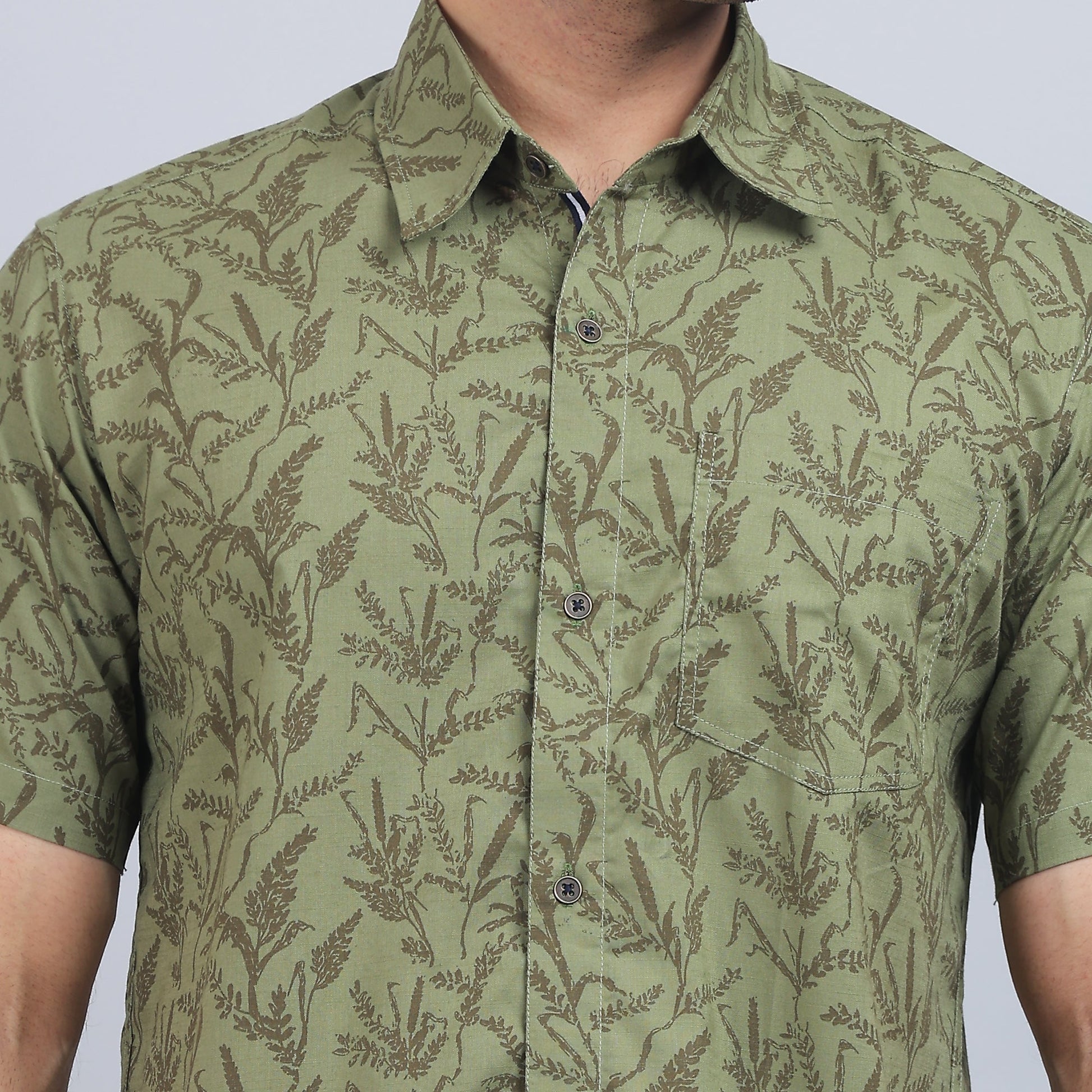 Olive Green Printed smart casual pure cotton half-sleeves regular collar shirt in comfort fit. Ideal for social gatherings and for keeping comfort with a professional trendy appearance.