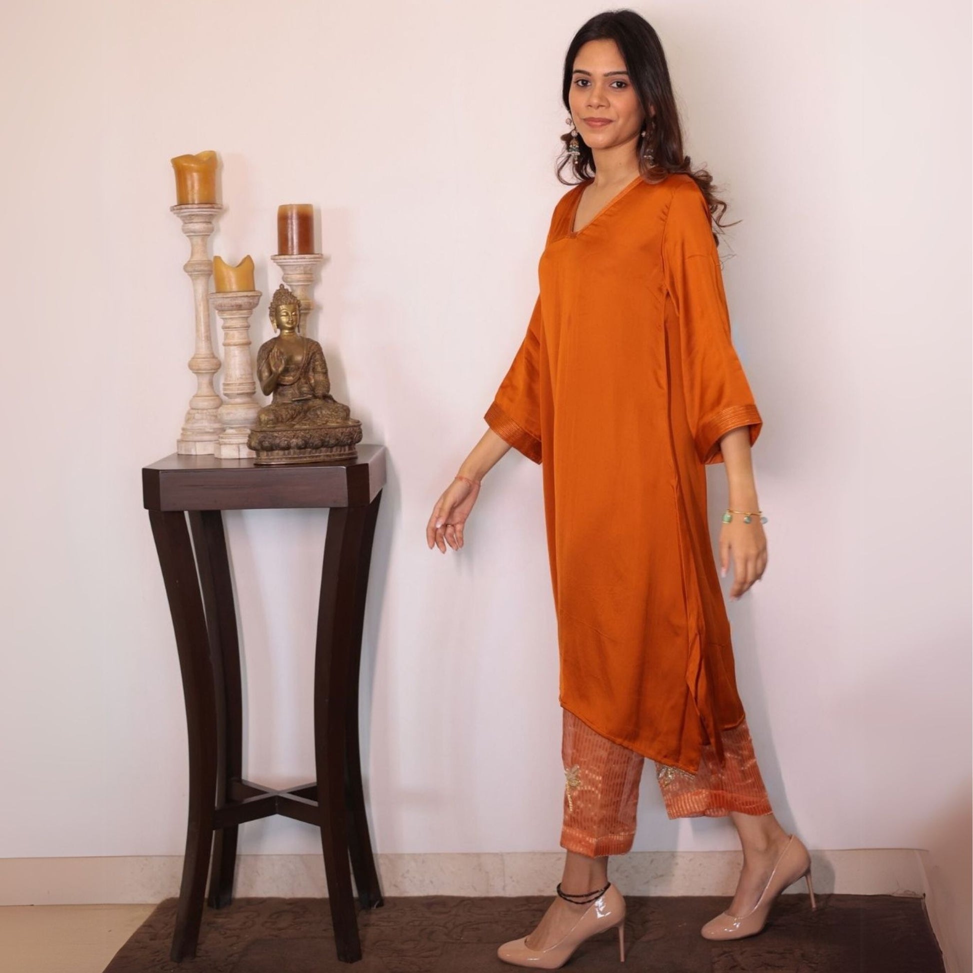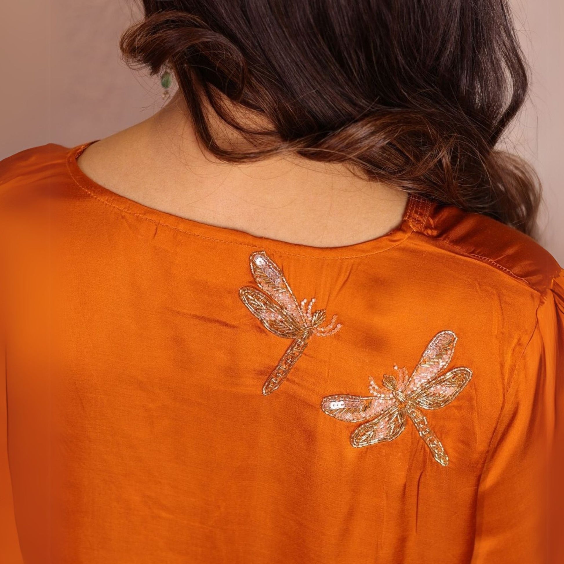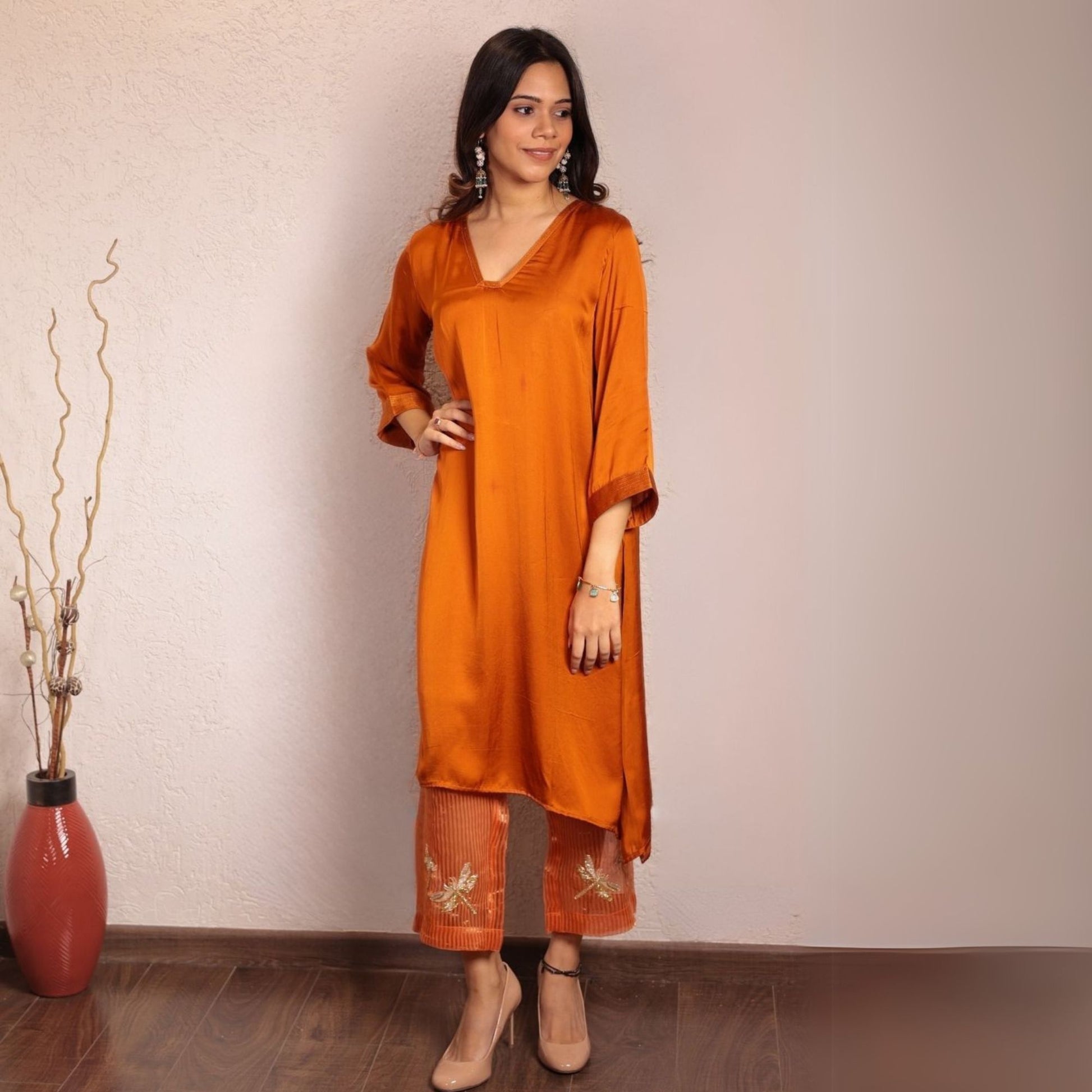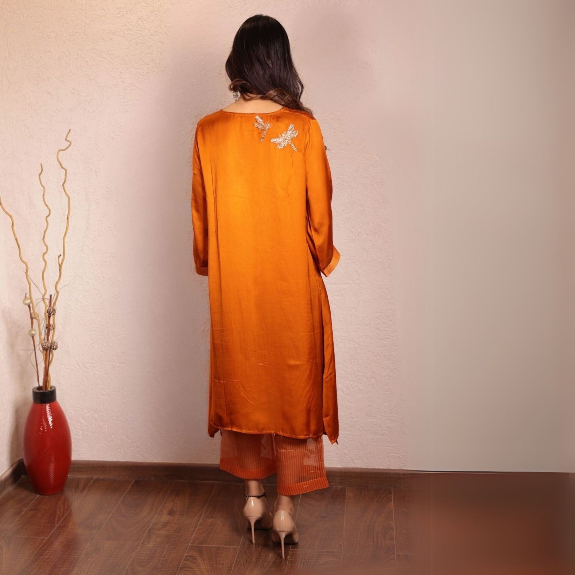 Elevate your style with our Orange Sheer Dragonfly Modal Co-ord Set, featuring a V-neck modal kurta adorned with delicate zari lines on the neck and sleeves. The playful hand-embroidered dragonfly on the back adds a charming touch, while the modal pants stand out with quirky hand-embroidered organza patches at the hem. Perfect for a modern and contemporary look