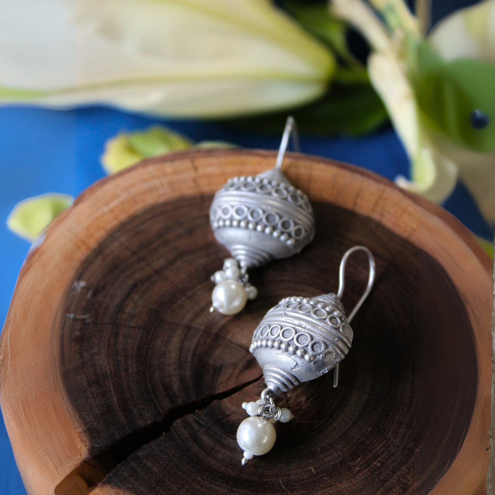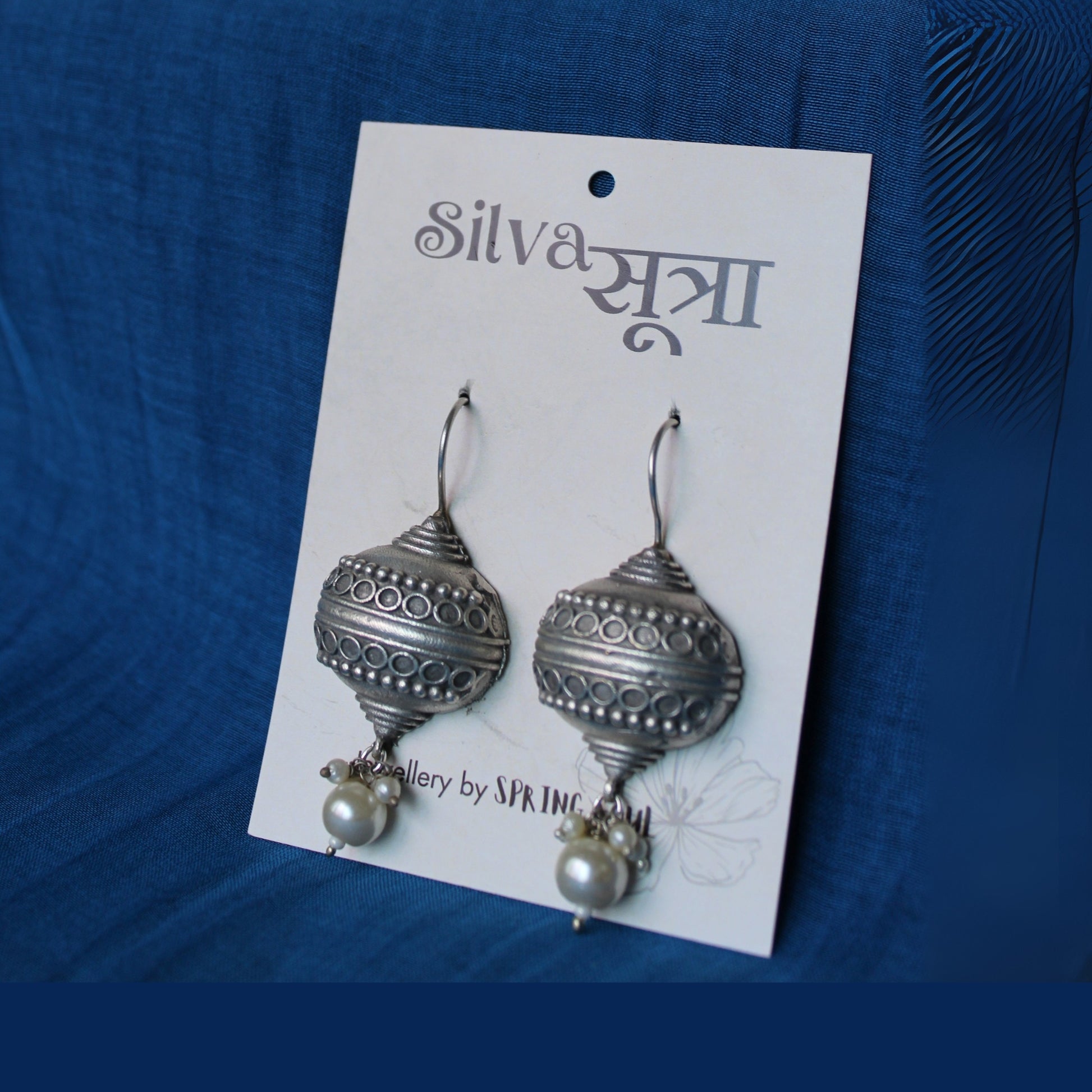 These striking oxidized silver earrings feature a unique spherical design, intricately detailed with textured bands and small raised dots. A delicate pearl drop gracefully hangs from the bottom, adding a touch of traditional elegance to their bohemian charm.
