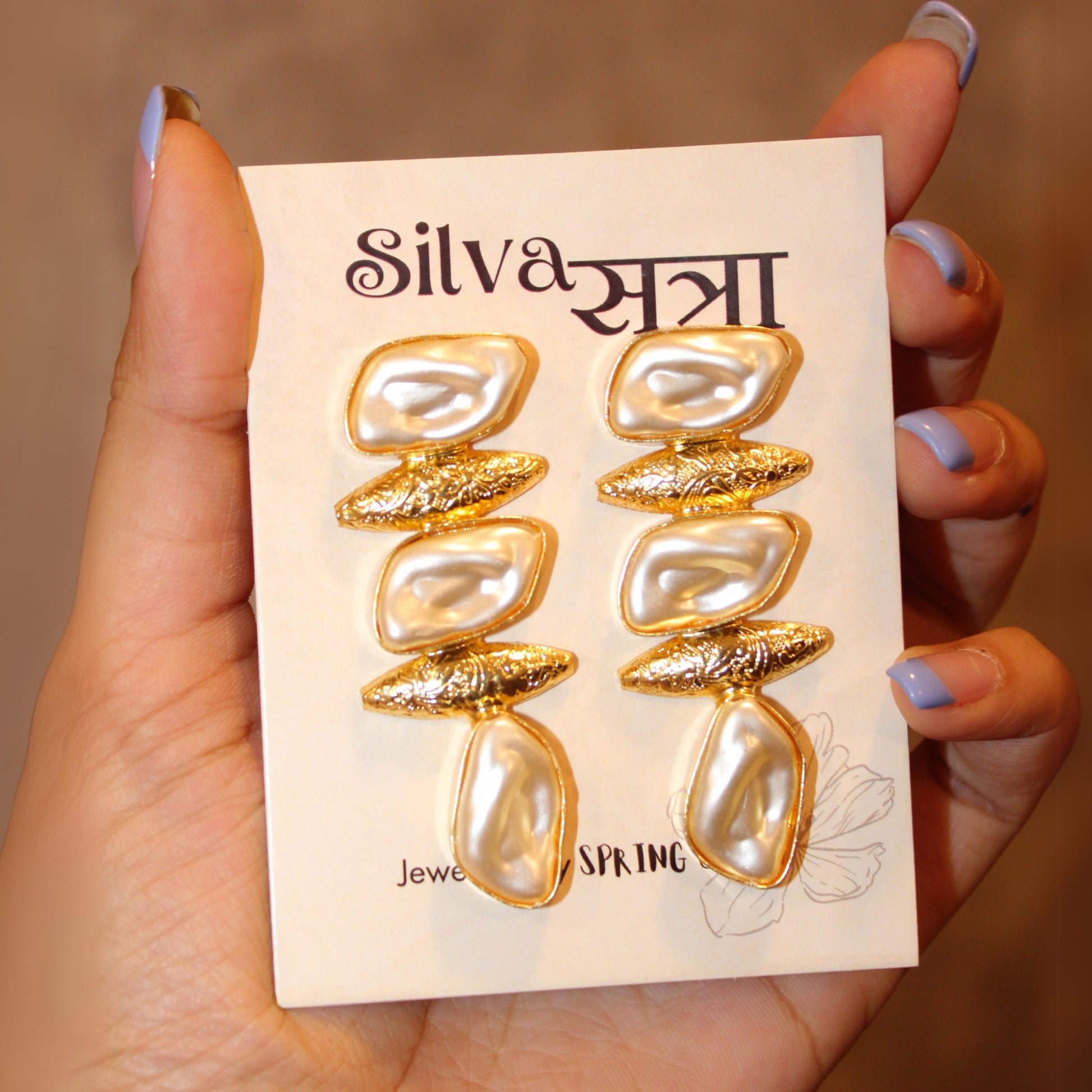 Gold-toned earrings featuring unique, organic-shaped pearls. These long, dangling earrings create a distinctive, elegant statement. Ideal for adding a touch of natural artistry to any look. Pushback closure.