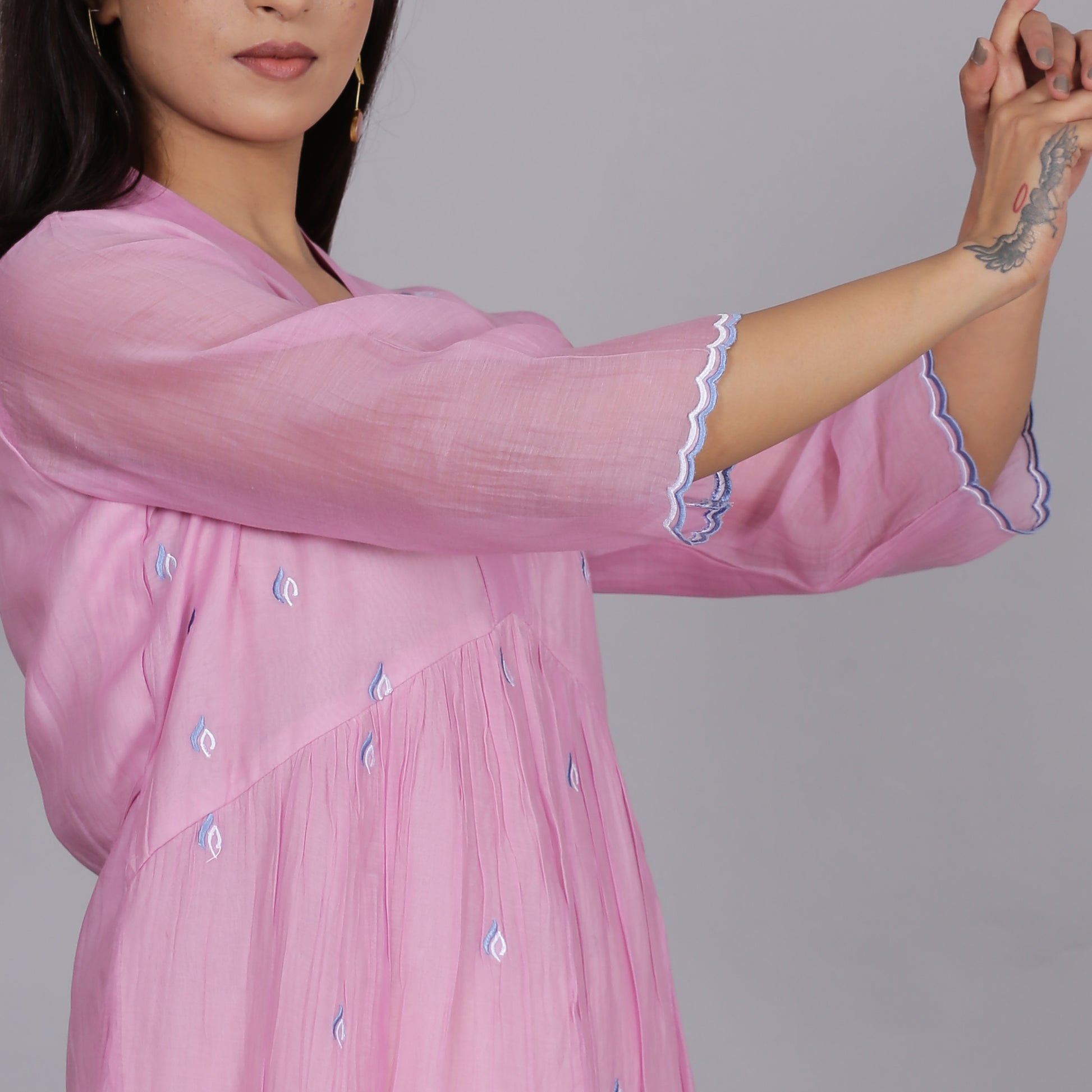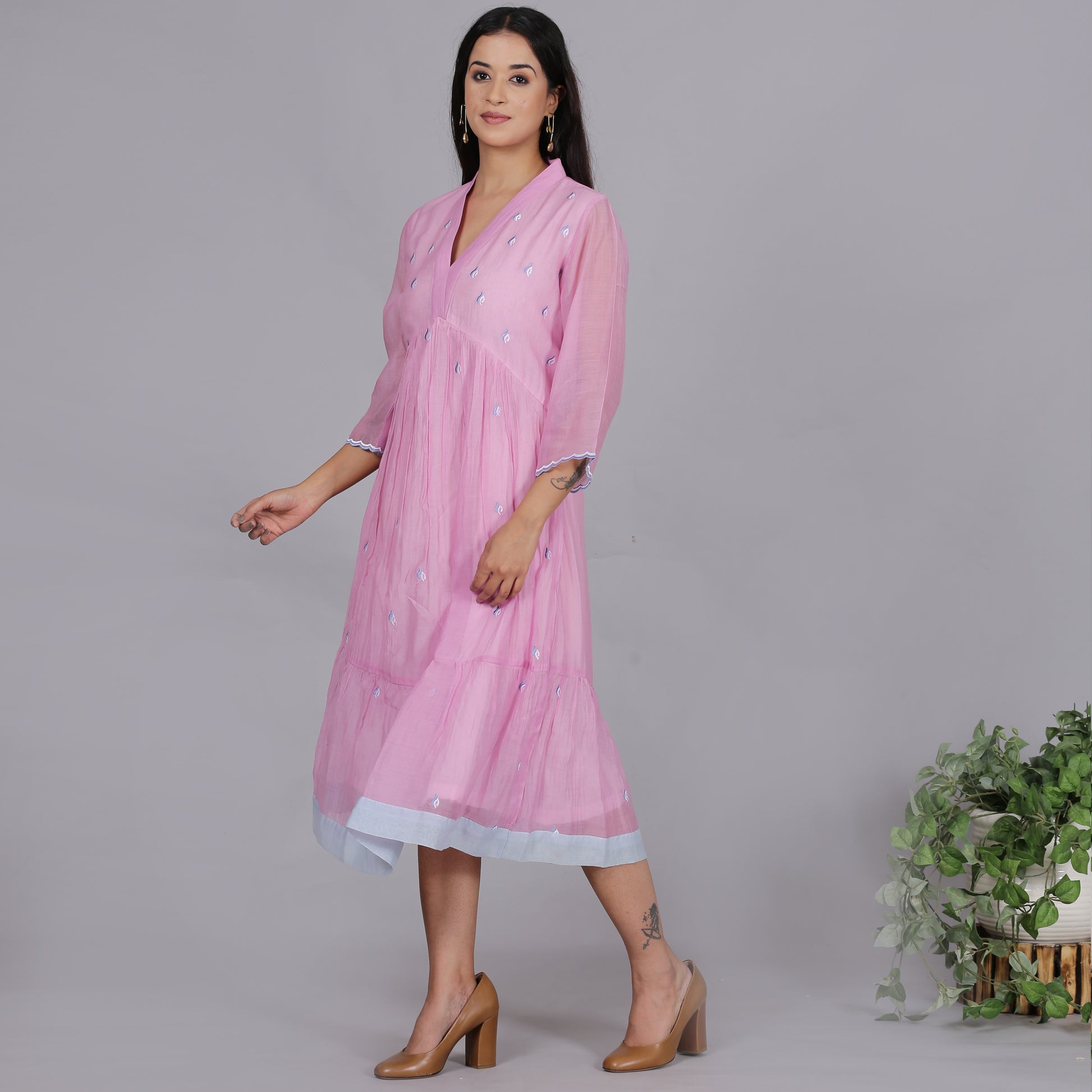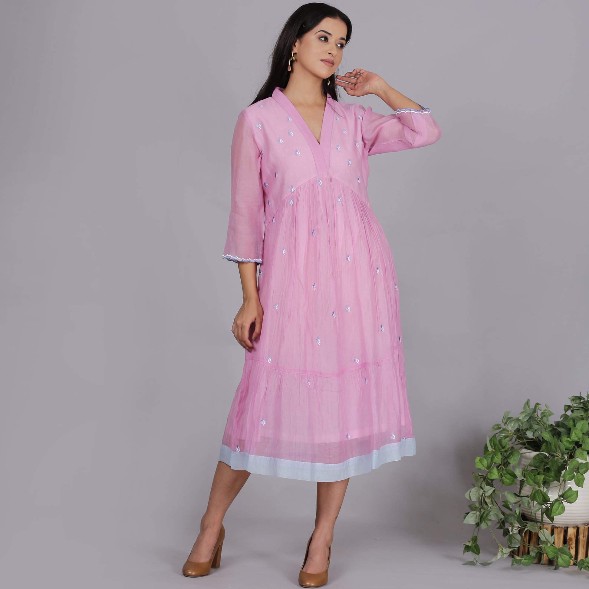 This pink Chanderi gathered dress exudes elegance with its delicate embroidery and luxurious fabric. The gathered silhouette offers a graceful flow. This dress is lined with matching fabric. Ideal for special occasions, this dress combines traditional charm with contemporary style for a timeless look.