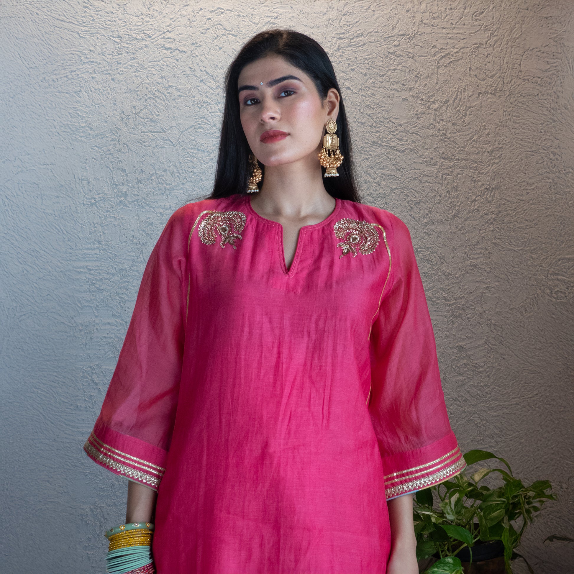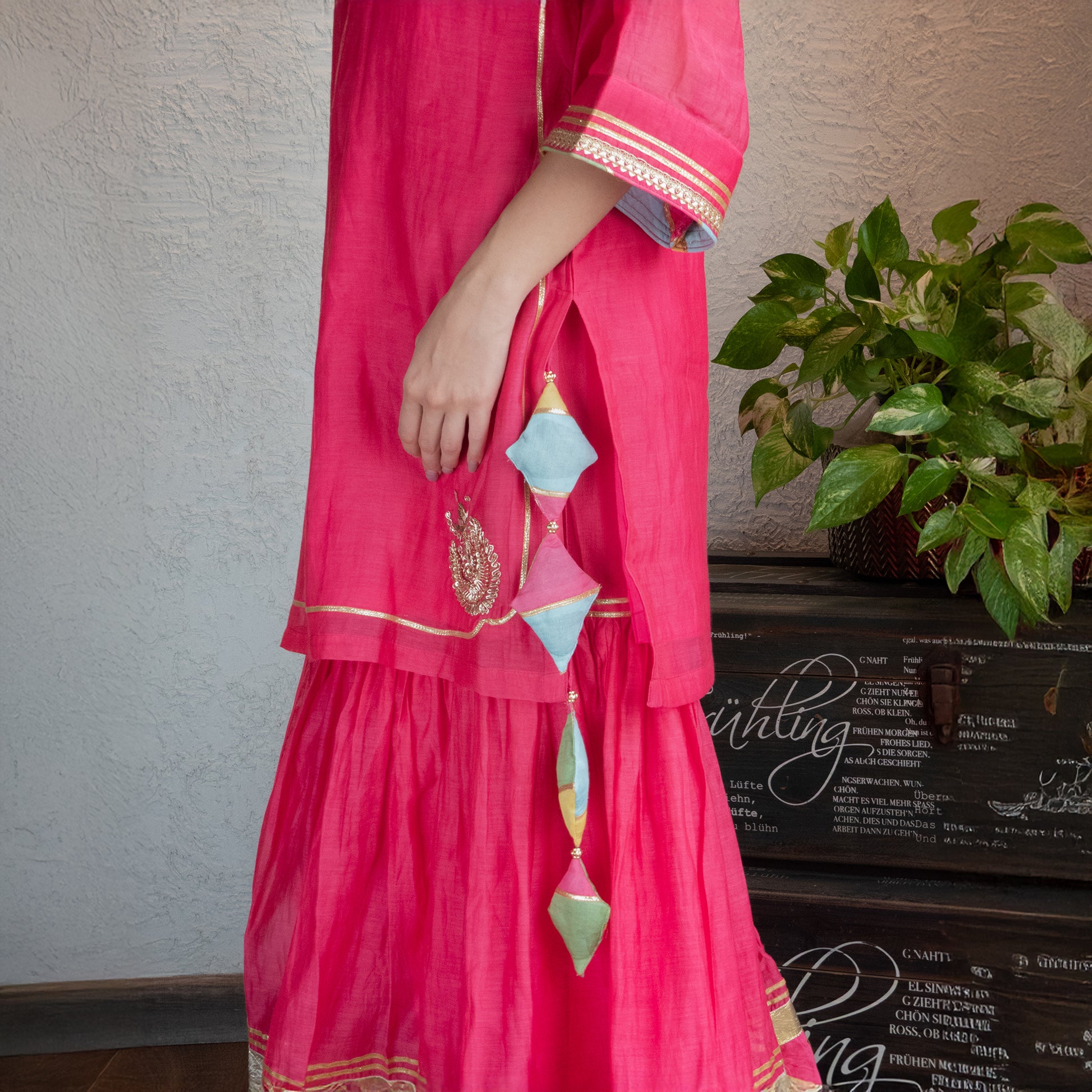 Bursting with festive charm, this coral-fuschia garara set stands out with a kurta detailed in thoughtfully placed hand-embroidered motifs. The garara features a vibrant, creative patchwork hem, adding bold texture. It’s equal parts playful, elegant, and unforgettable.
