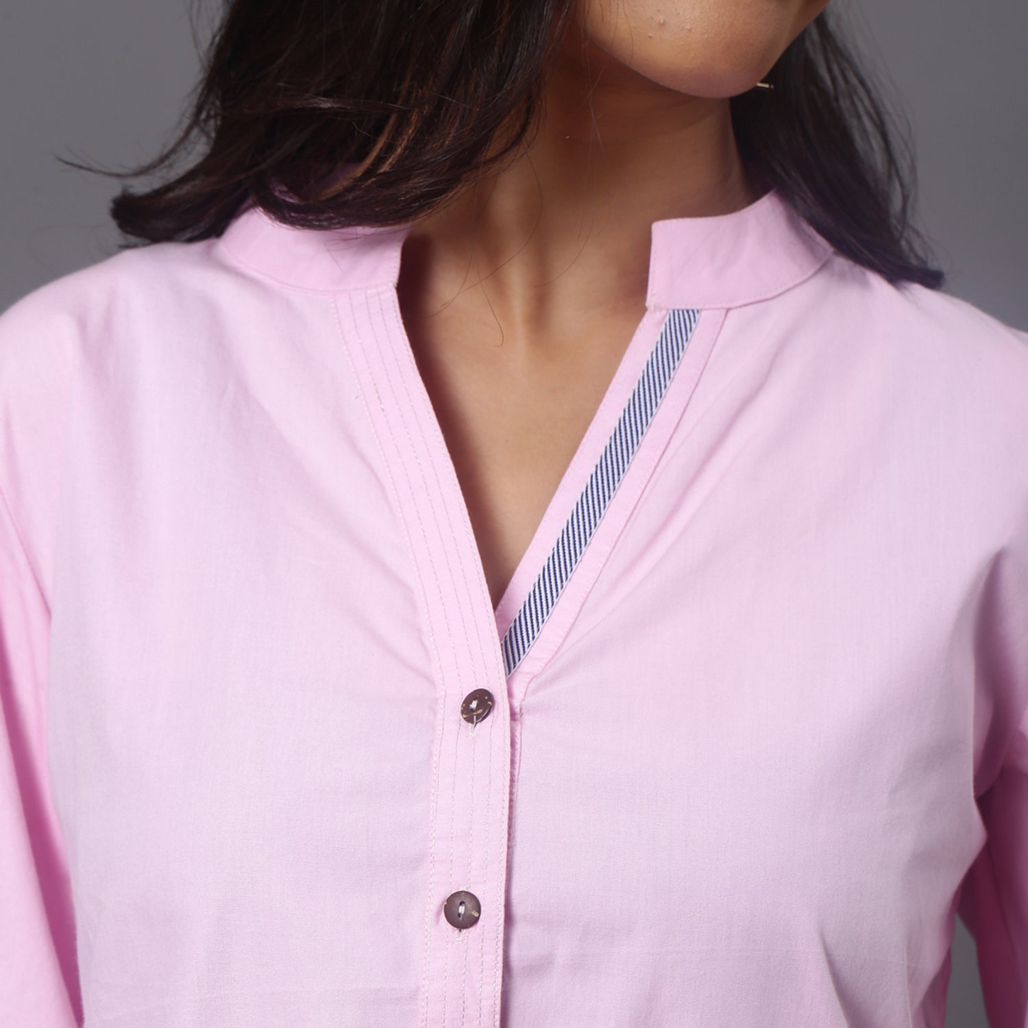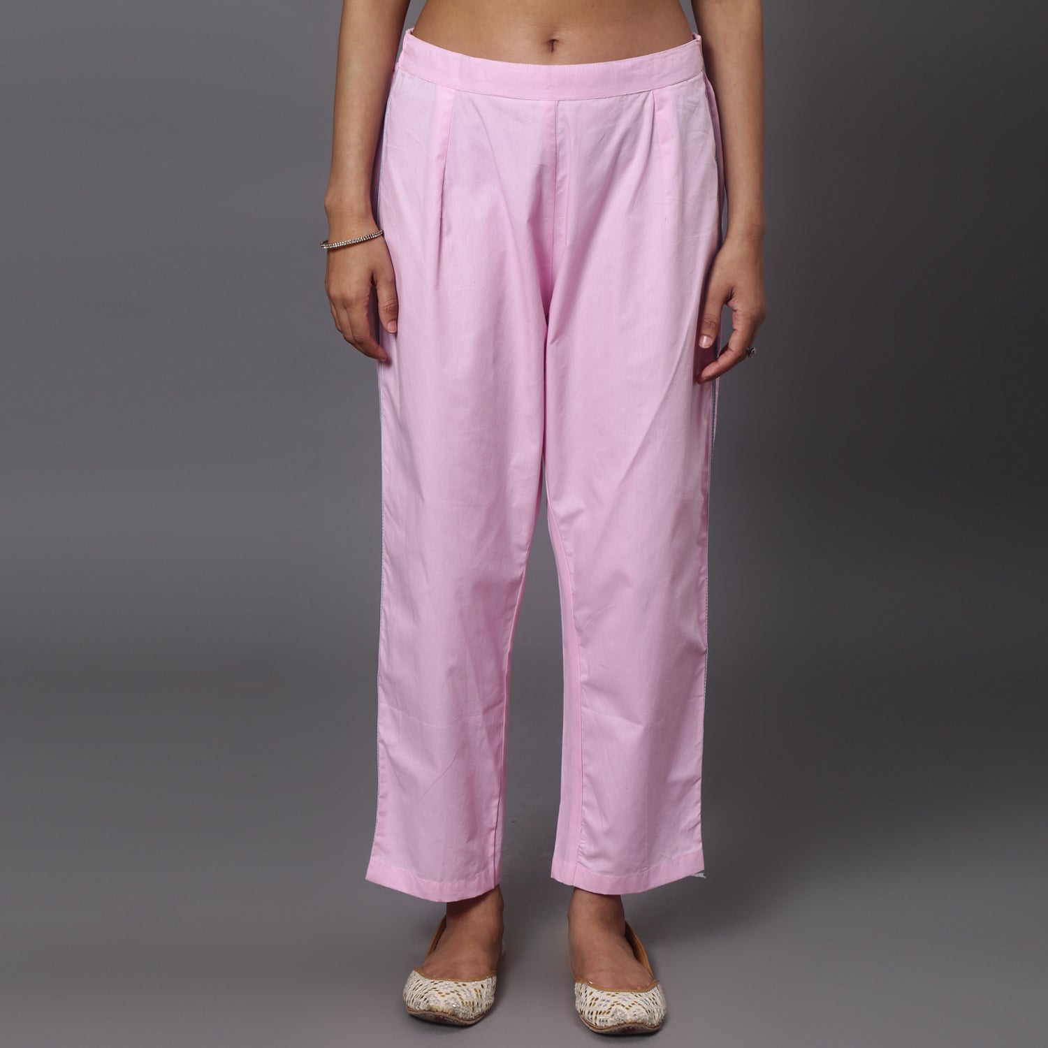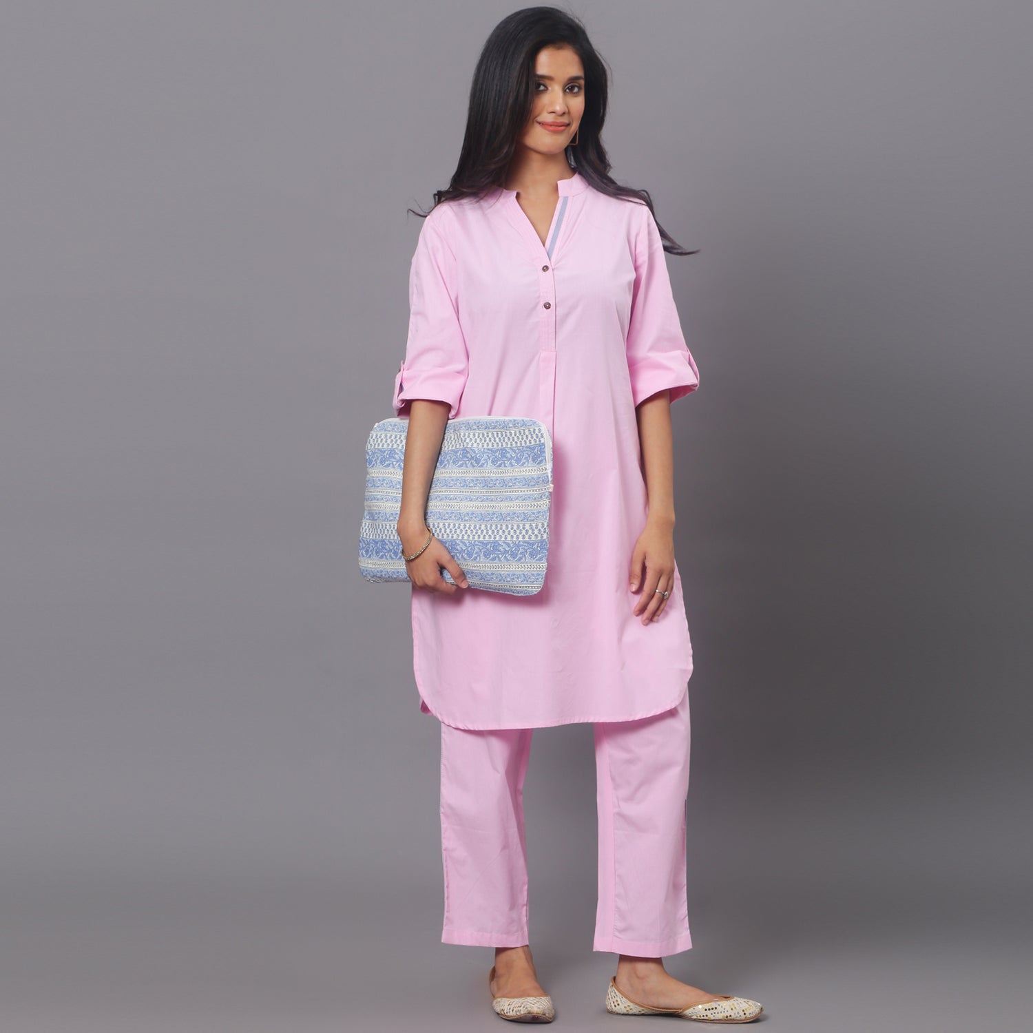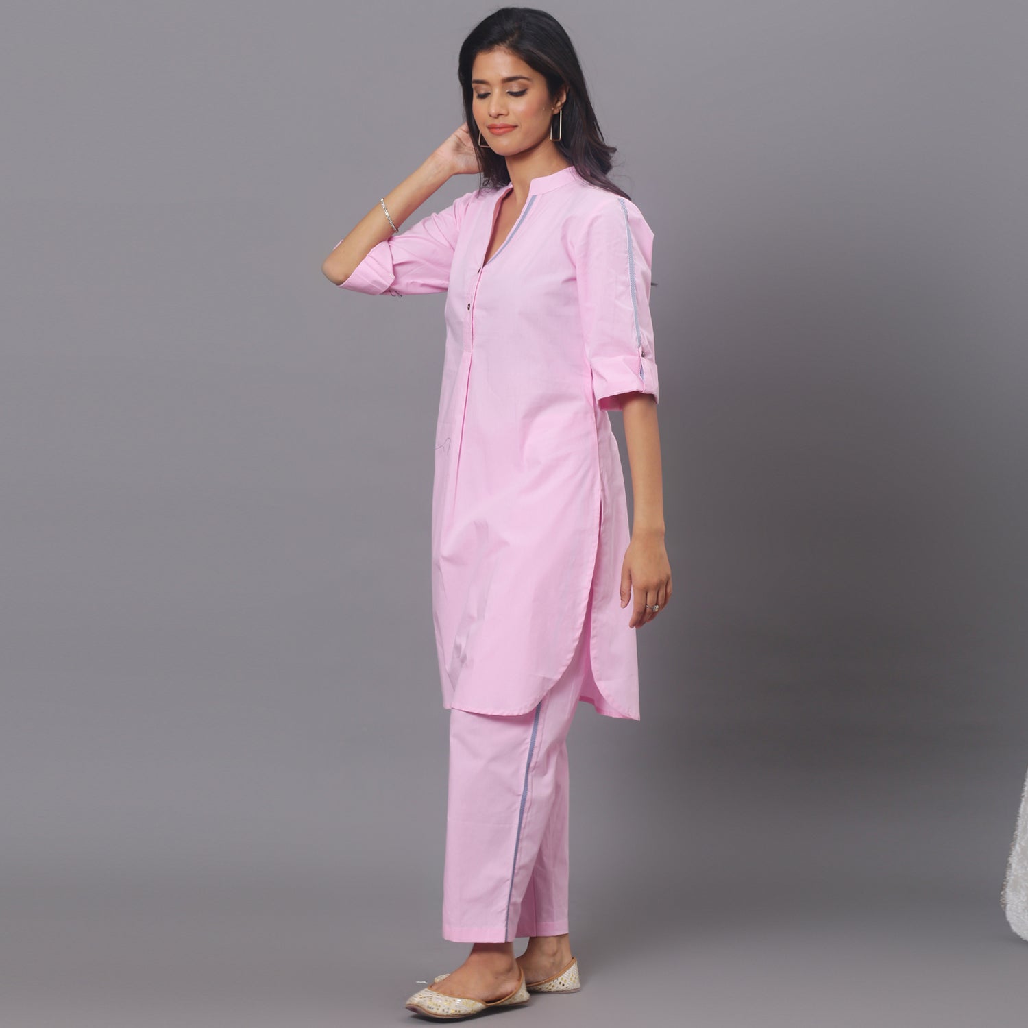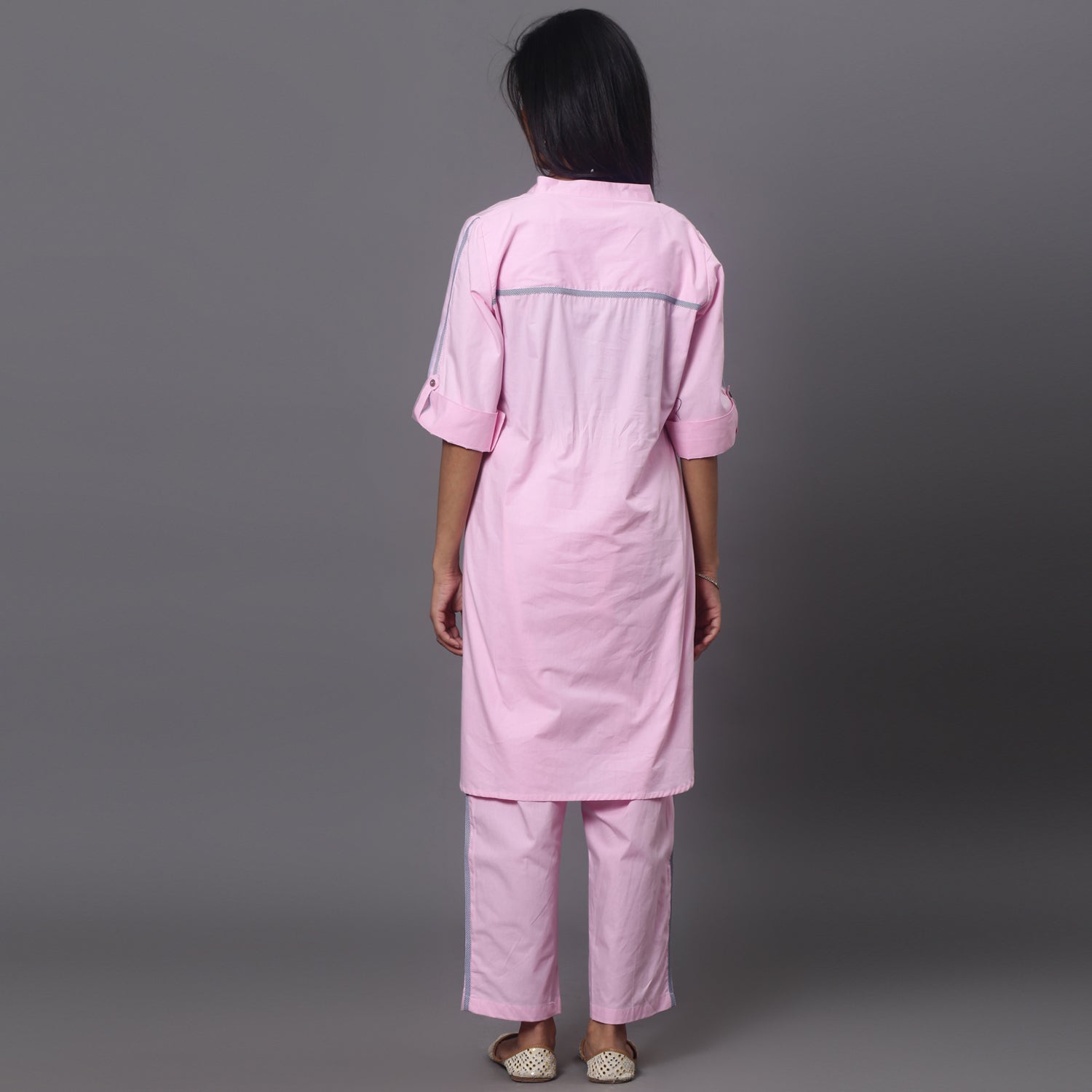 Pink cotton co-ord set with tape detailing on neck and sleeves. It is paired with tonal pants with tape detailing on the sides. Perfect for all day comfort.
