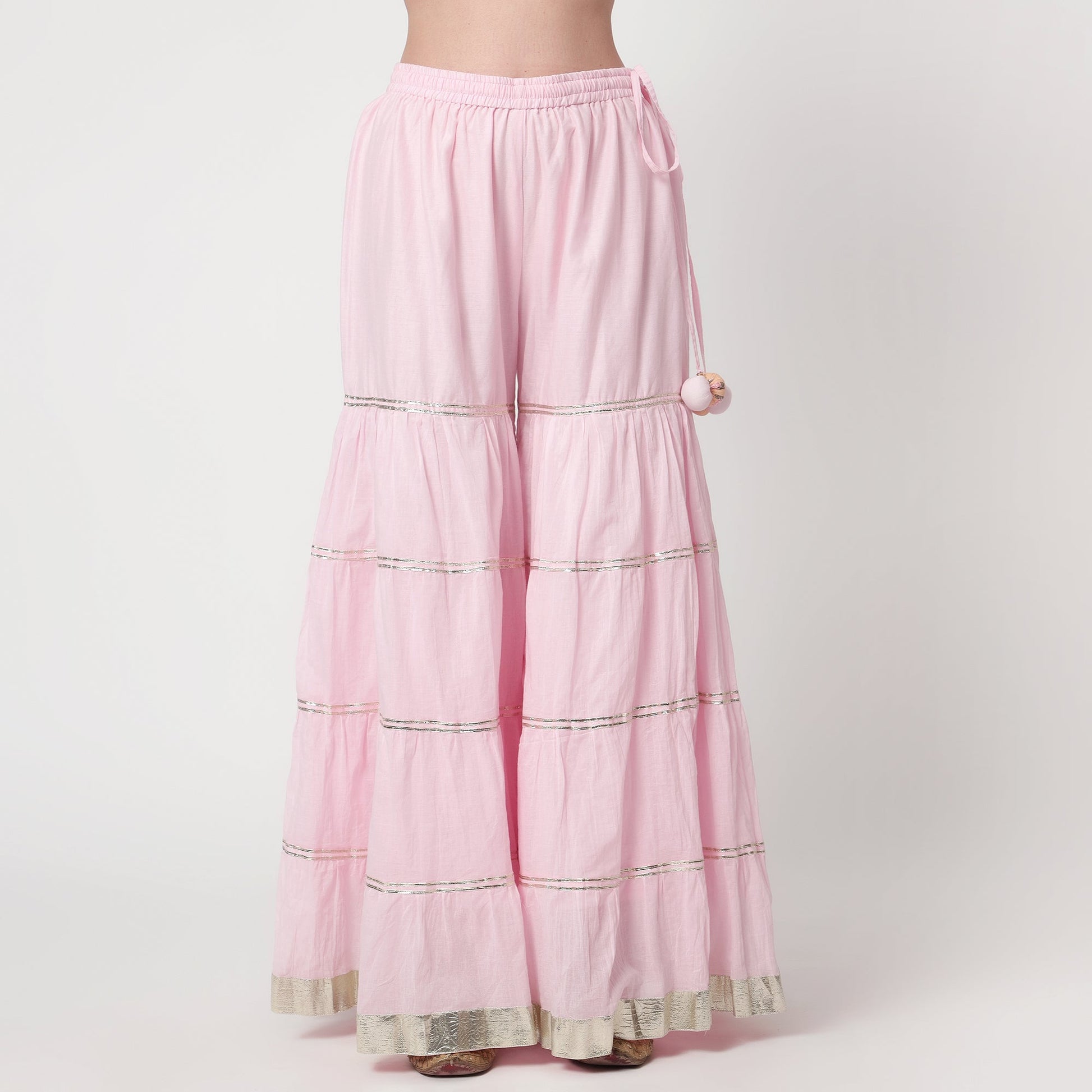 Pink Cotton tired sharara with fancy latkan tie-ups. Can be worn with a plain or Printed kurta with tonal dupatta. Ideal for festivals & functions.