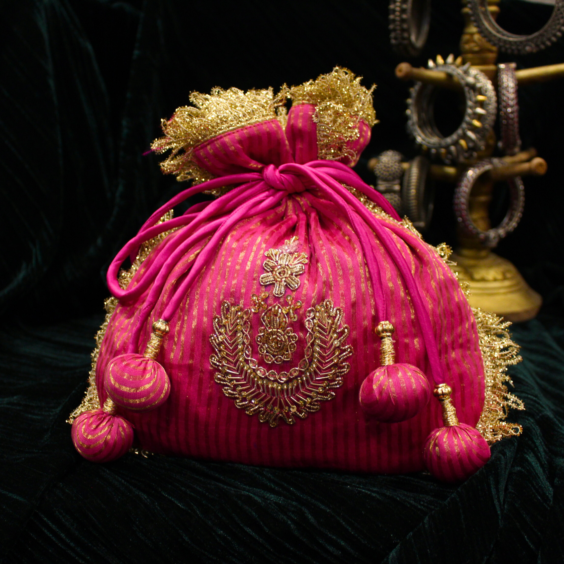 An elegant Pink tissue Chanderi Potli featuring intricate hand-embroidered motifs and delicate lace detailing along the edges. Lined with a smooth satin finish, it’s the perfect accessory to elevate any ethnic outfit—adding grace, charm, and timeless style to festive or celebratory looks.