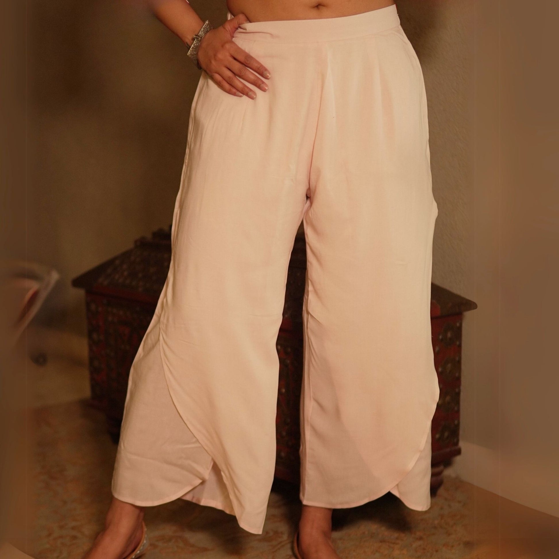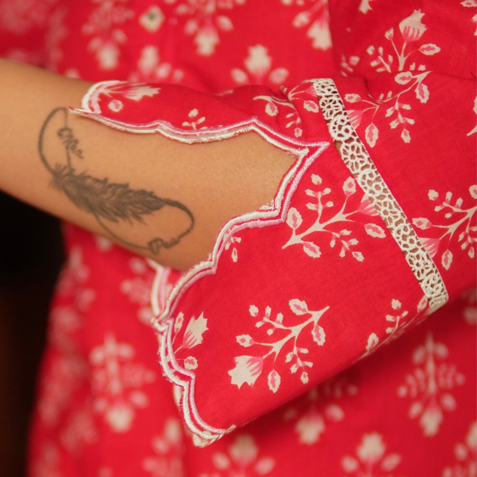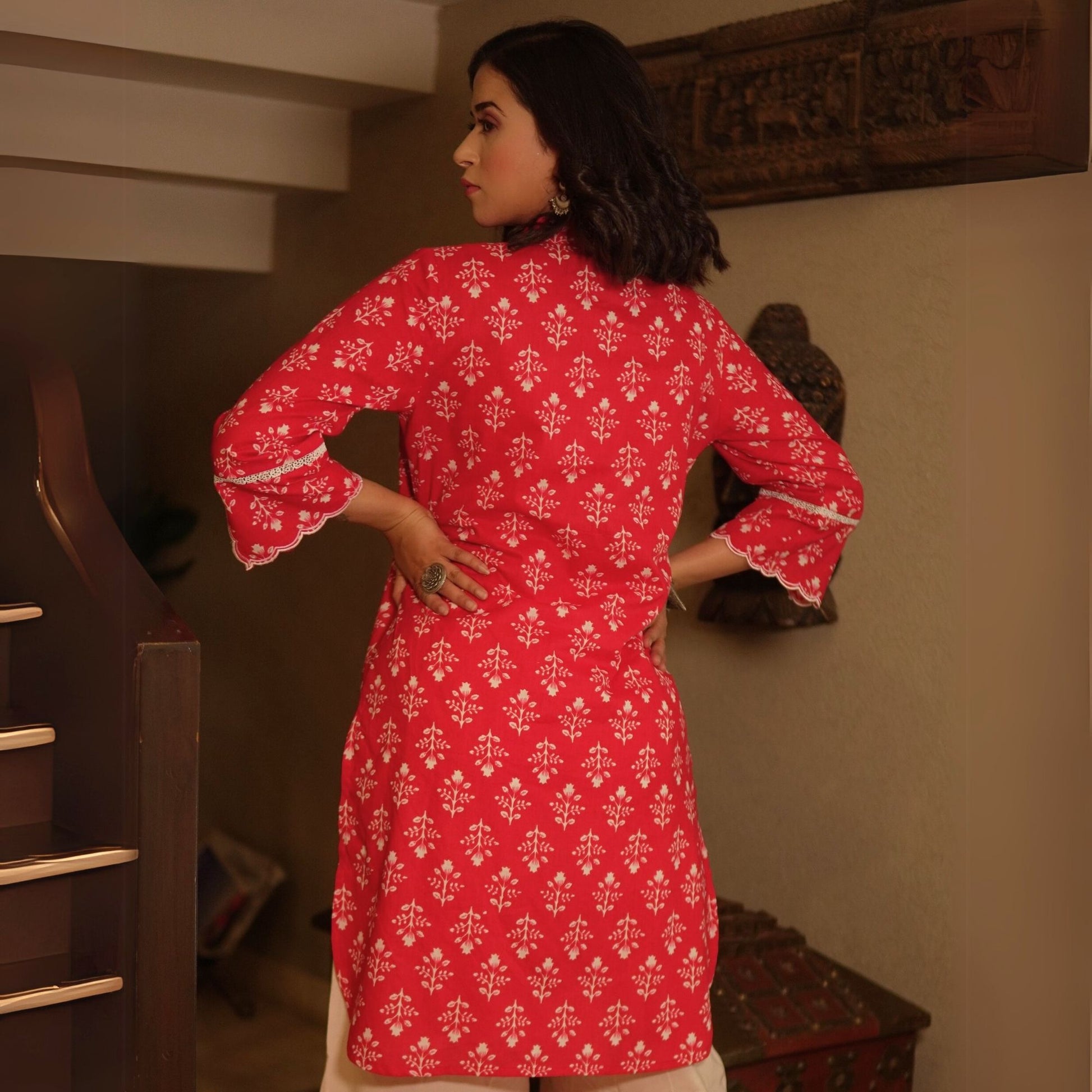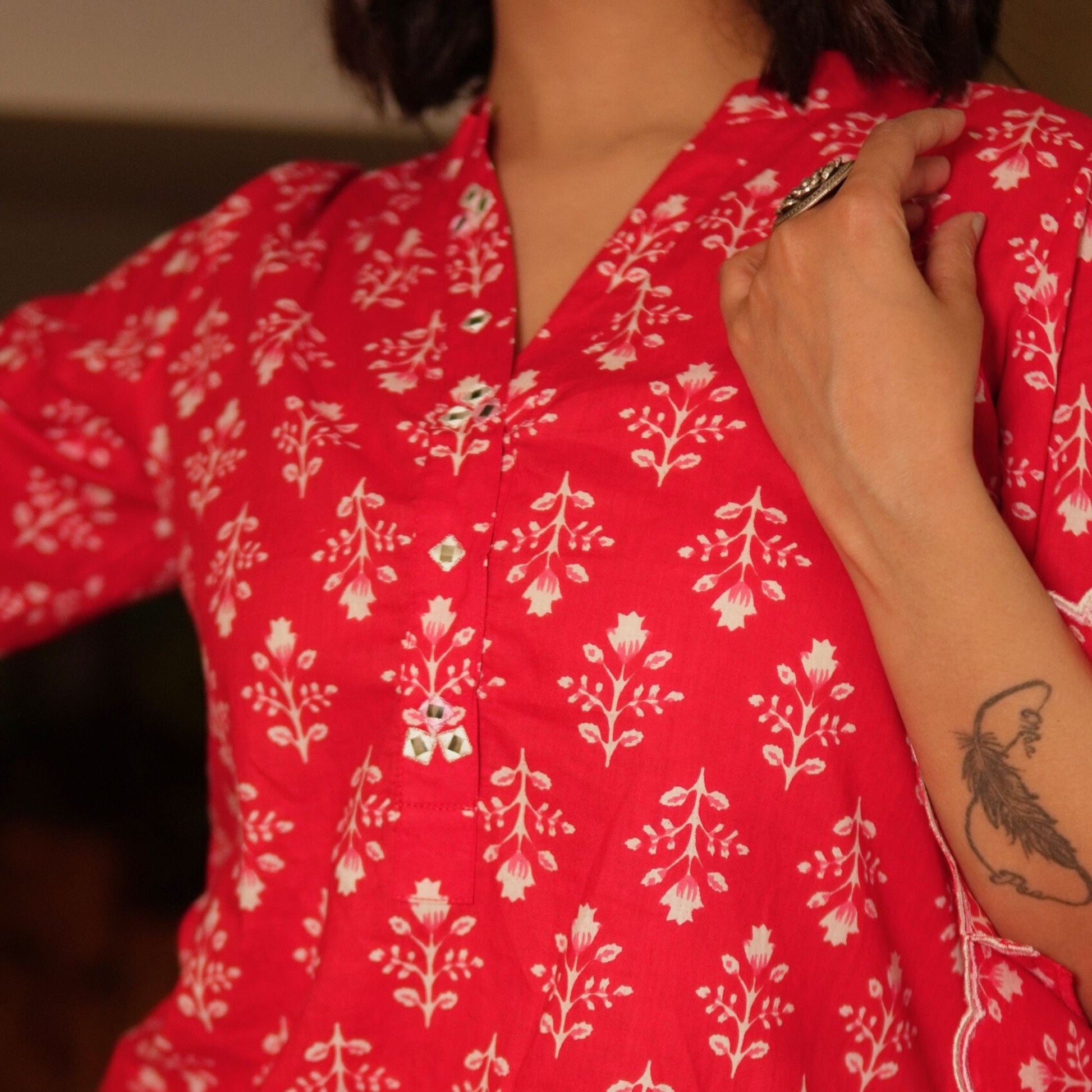 Chic yet comfortable, this red floral cotton kurta features mirror work on the placket, a band collar with a V-neck, and scalloped slit sleeves with lace inserts. Styled with modal cotton pink overlapped pants, it’s a smart, coordinated look for casual and workwear alike