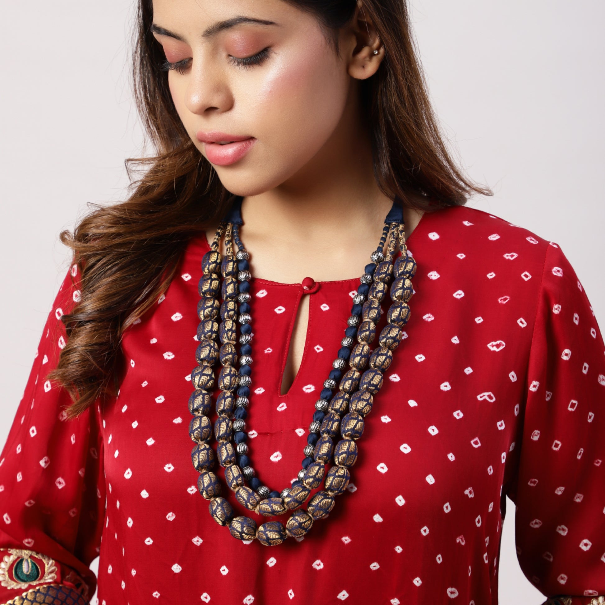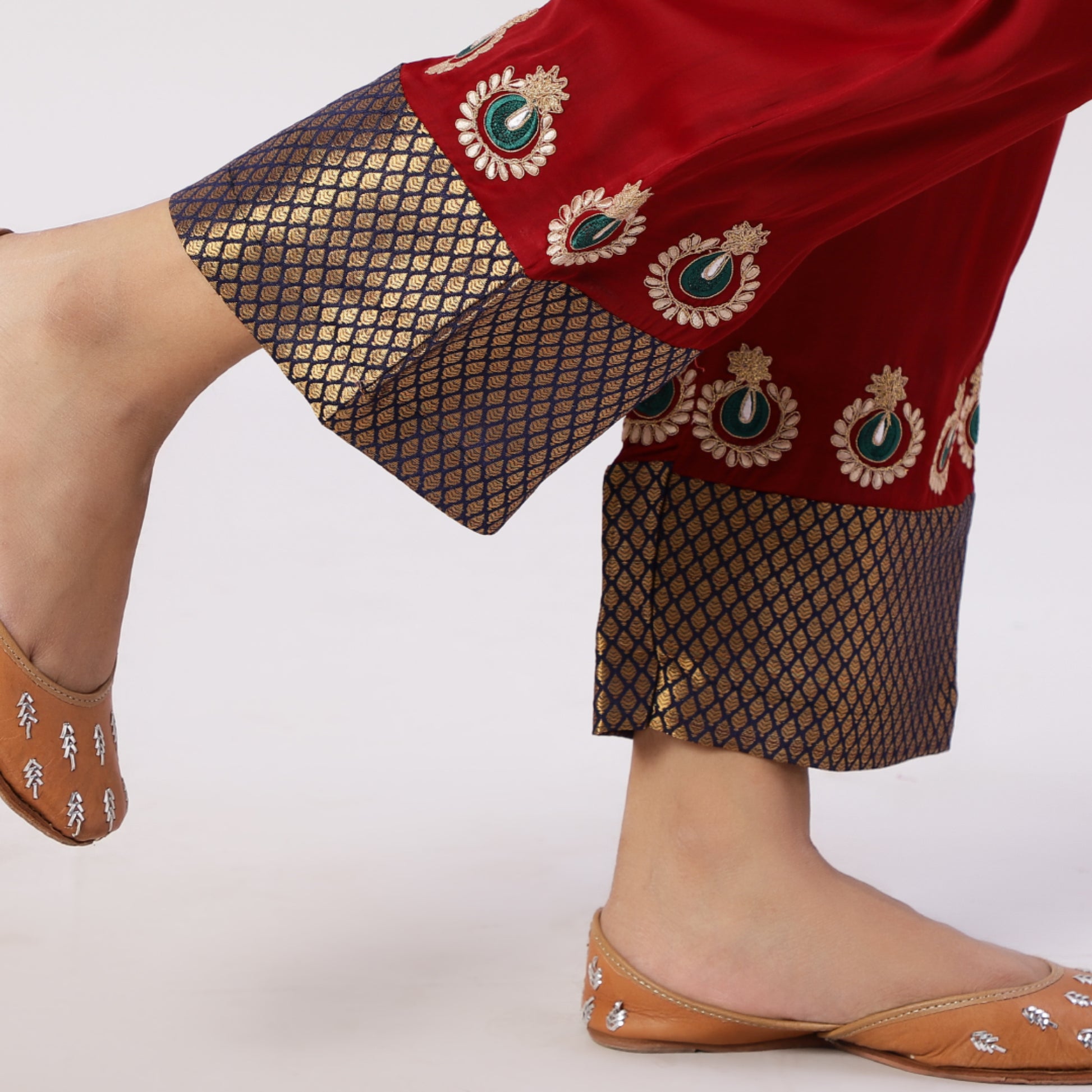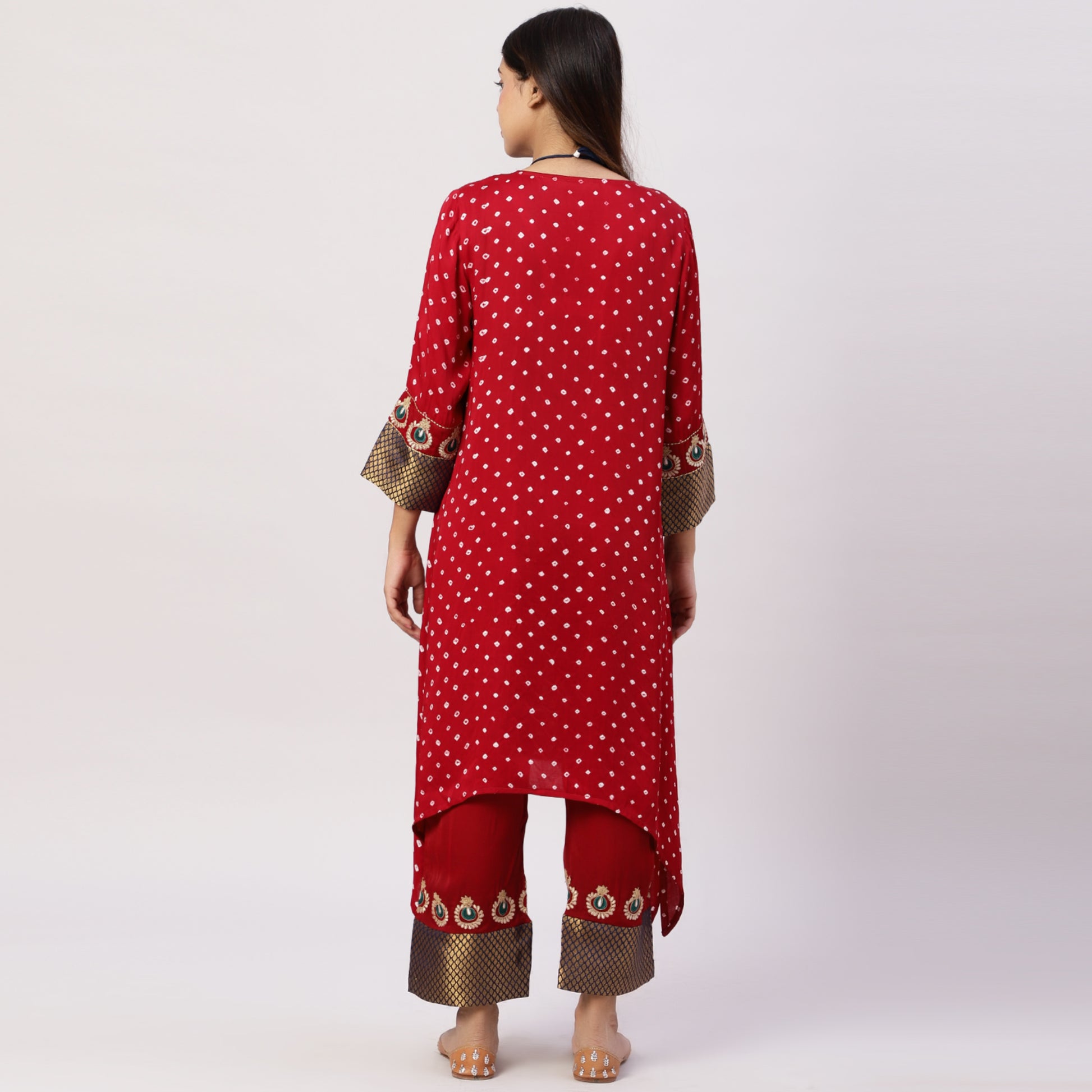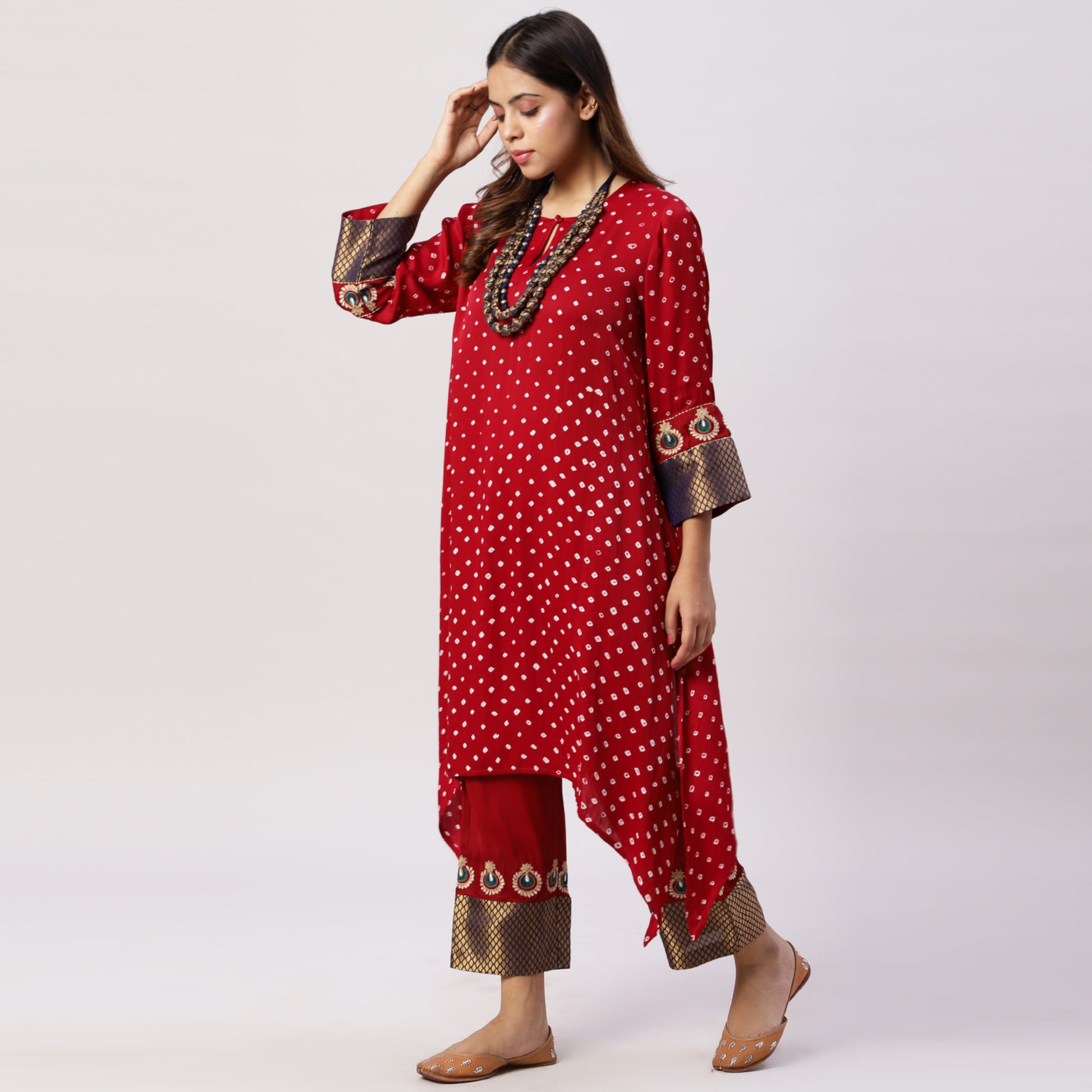 This bandhani print round neck asymmetric modal silk kurta in red color with embroidery on sleeves and brocade trim is paired with contrasting embroidery pants.It is a stylish ensemble perfect for festivity.