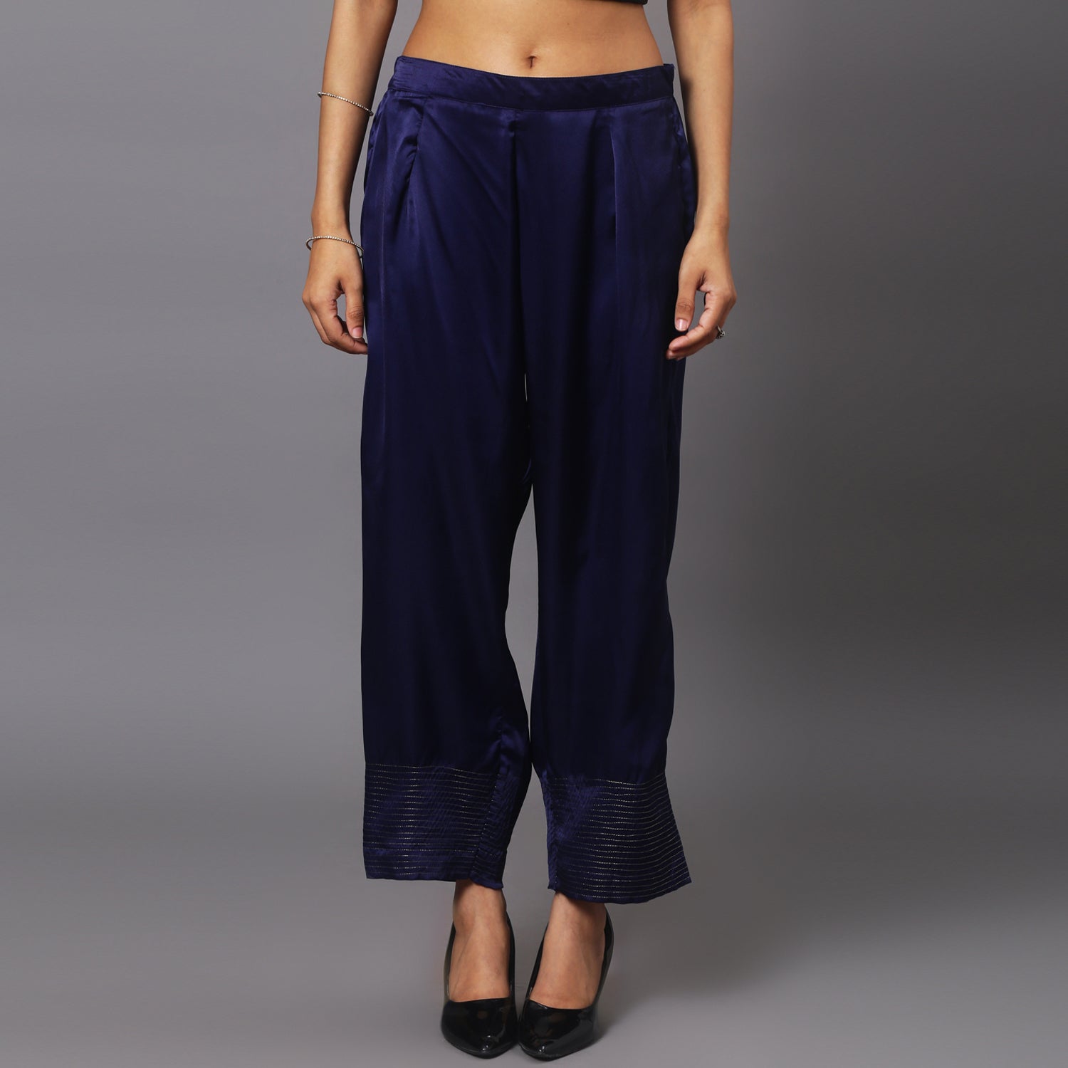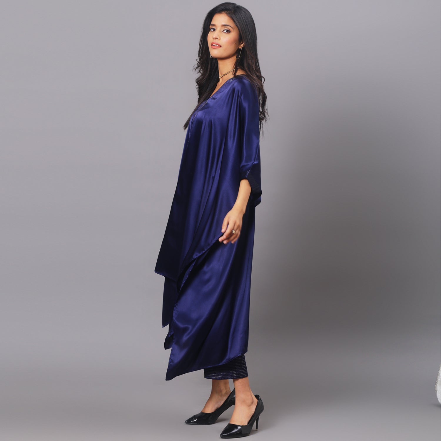 Royal blue silk blend short kaftaan co-ord set with v neck and zari detailing on neck. It is paired with tonal pants with zari work detailing on the bottom. This trendy set is perfect to catch your festive vibe by making the style statement.