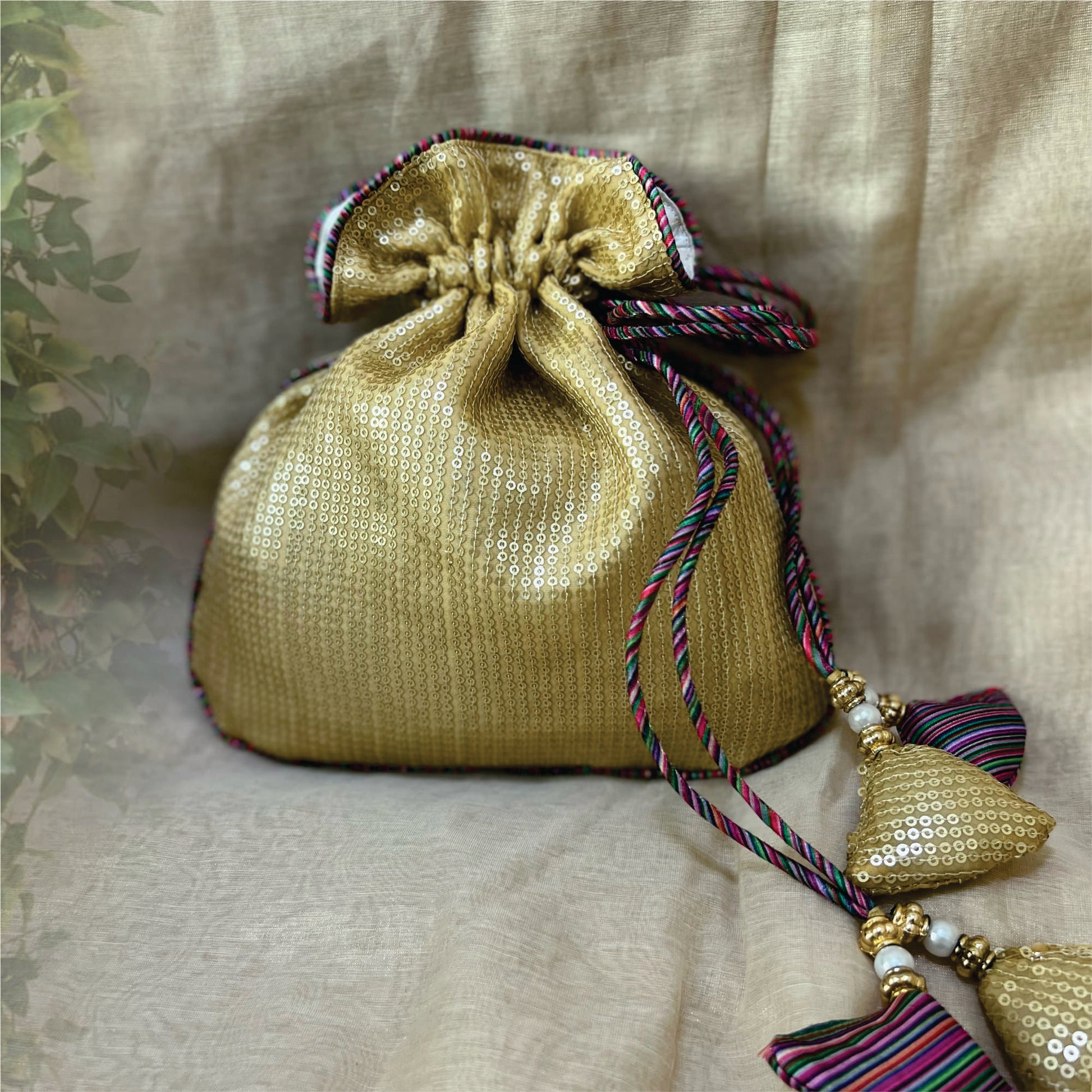 The dull gold sequin potli is just the kind of understated bling you'd love. Delicate sequin with a satin lining and tassels makes it a festive must have.