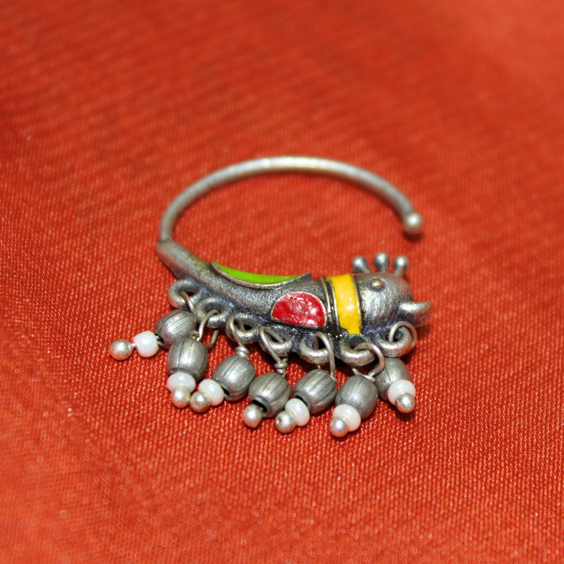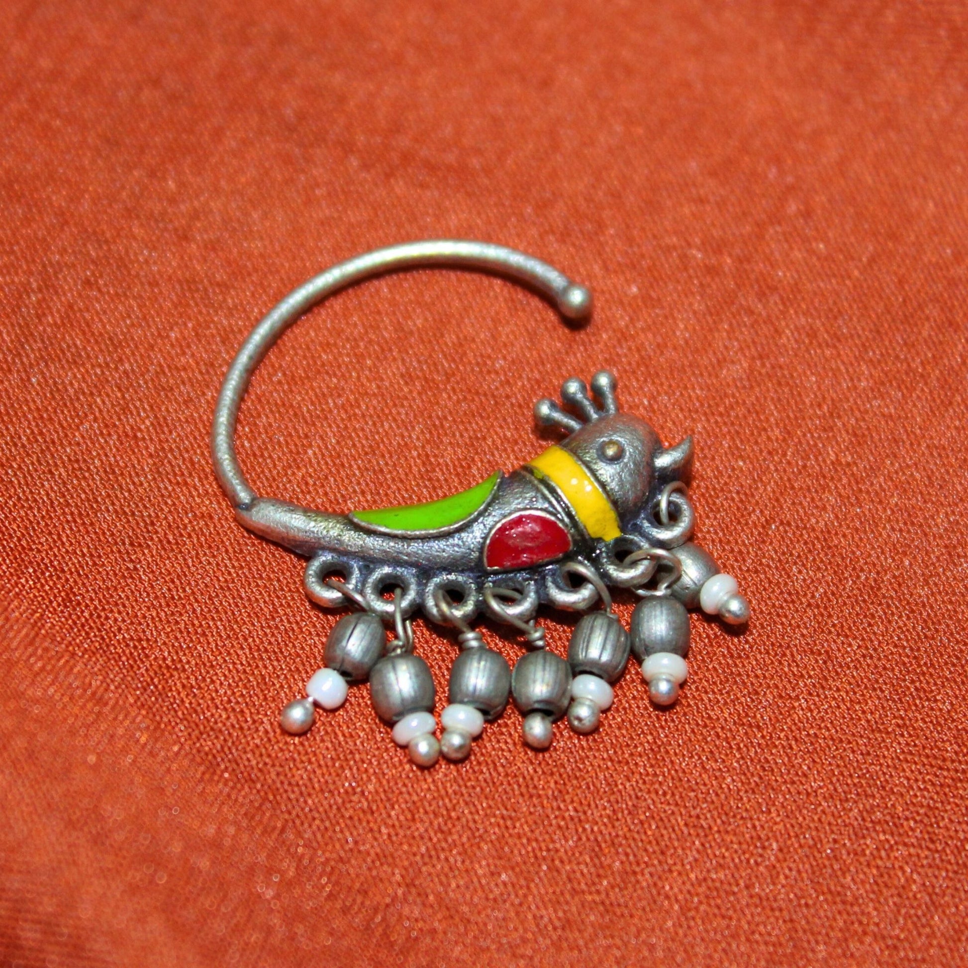 This whimsical nose ring features a charming bird design with colorful accents, adding a touch of playful elegance to your look. The delicate detailing and dangling pearls make it a captivating accessory. This nose ring is perfect for adding a touch of personality to any outfit. Pair it with a simple dress and heels for a chic look, or with a casual outfit for a touch of bohemian flair.