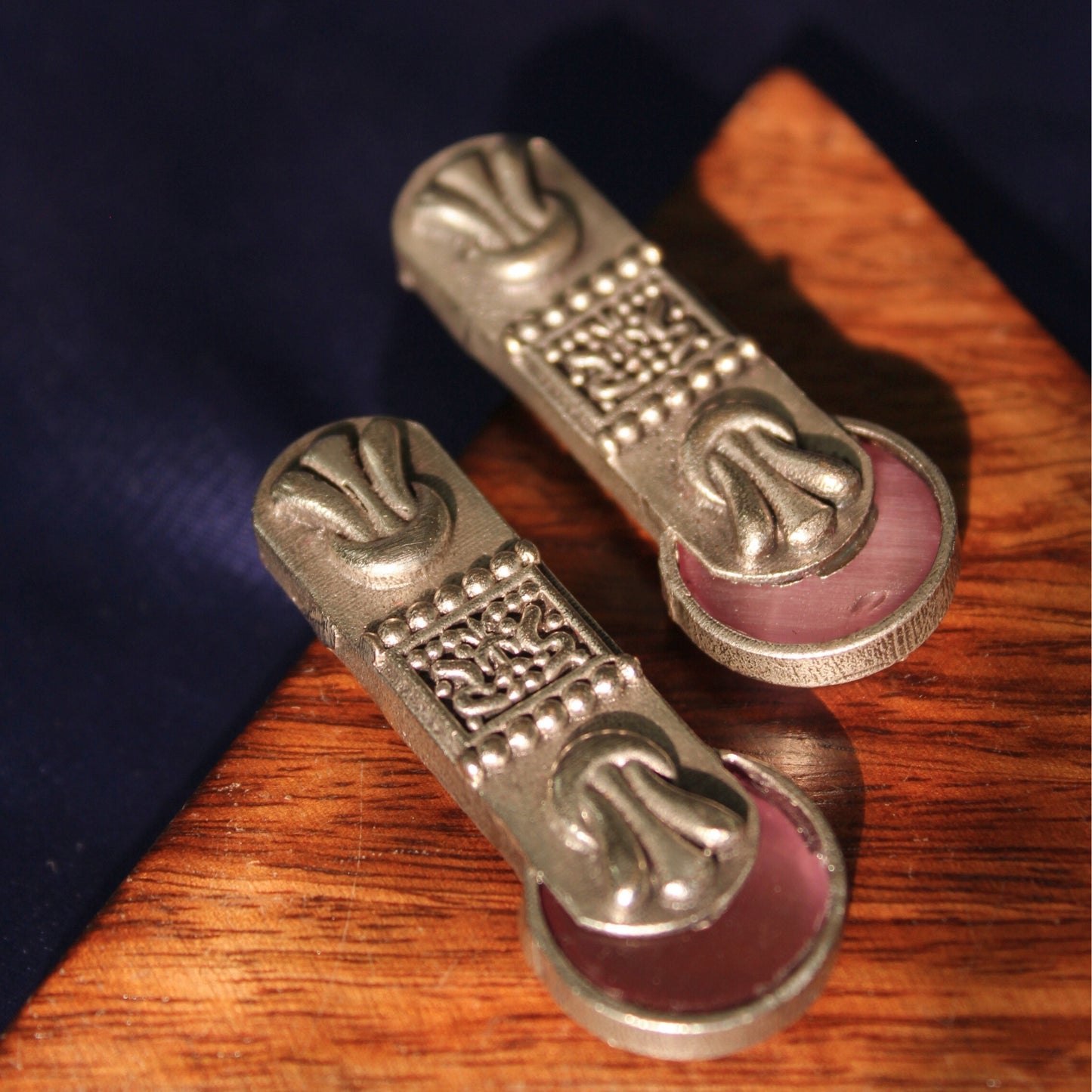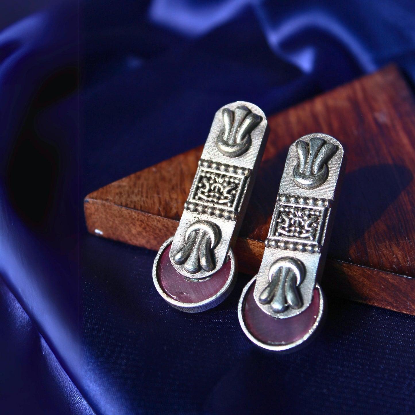 Oxidized silver-toned earrings with intricate detailing and a unique crescent-shaped base featuring a pink stone inlay. These statement earrings offer a blend of vintage and artistic style. Secure pushback closure