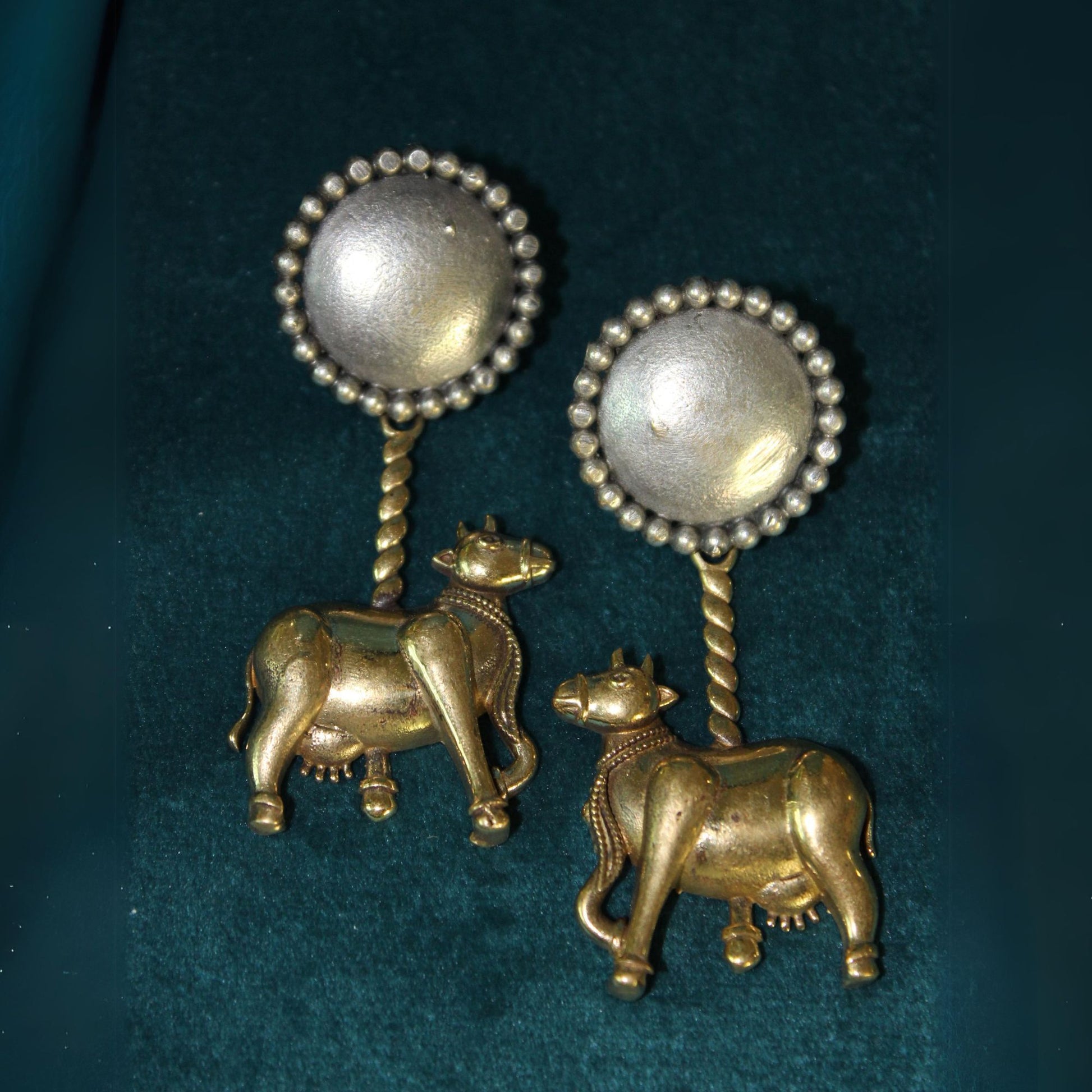 Add a touch of tradition and elegance to your look with these stunning dual-tone Nandi earrings. The intricate design features a silver-toned disc and a golden Nandi motif, showcasing exquisite craftsmanship. The secure push-back stopper closure ensures comfortable wear. Pair these earrings with traditional attire for a timeless ensemble, or add a touch of Indian heritage to contemporary outfits.