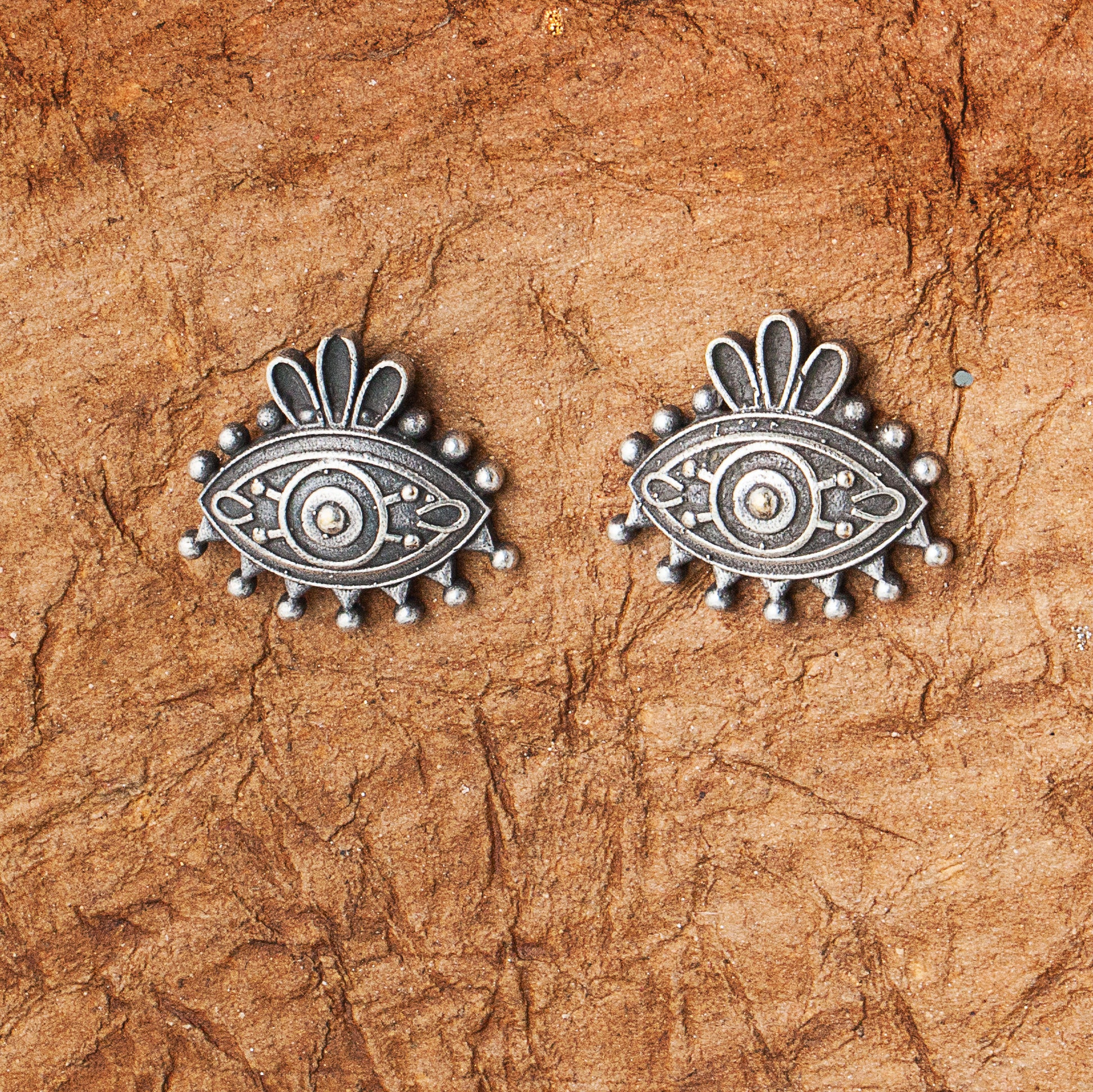 These meticulously crafted earrings showcase an intricate eye motif, set in a refined silver design. The oxidized finish adds a touch of sophistication, while the eye motif offers a subtle sense of protection and style. They're perfect for adding a touch of quirky to any outfit.