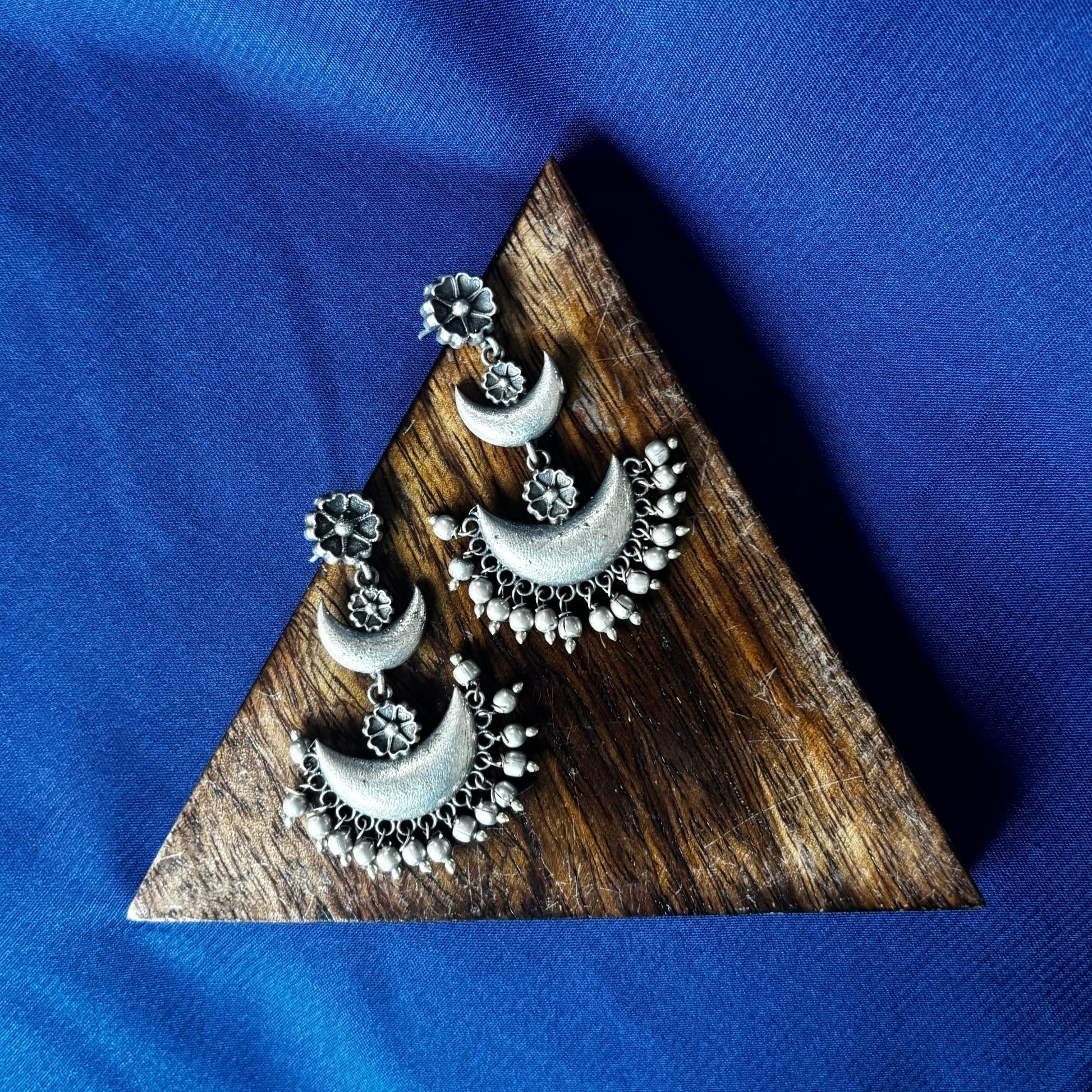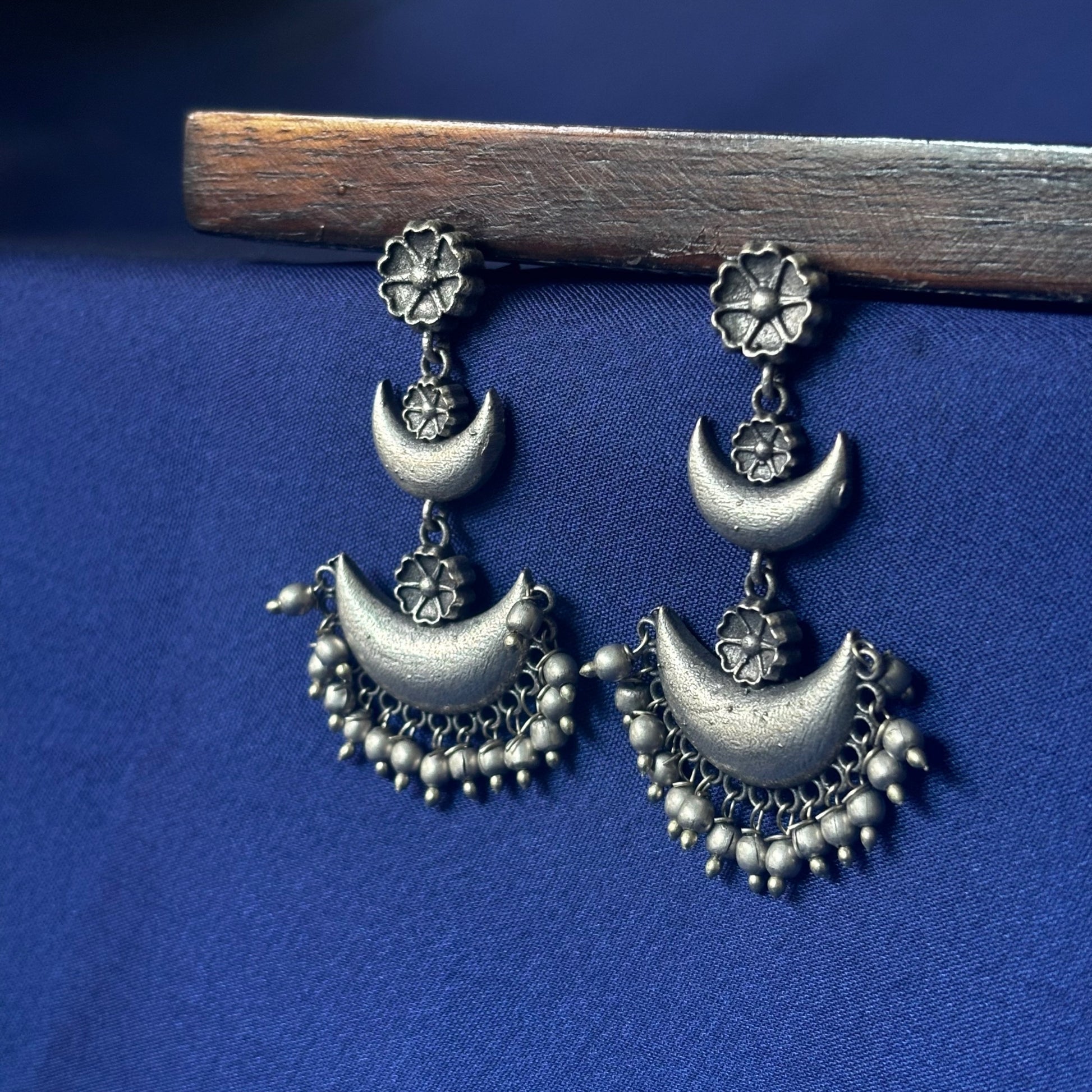 Oxidized silver-toned earrings with a tiered crescent design featuring floral accents. Detailed metalwork and small bead drops add a touch of bohemian charm. These long, dangling earrings have a pushback closure.